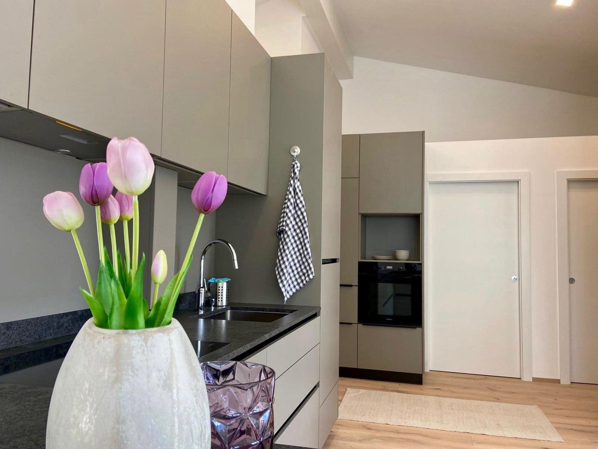 Die Ferienwohnung ist aufgeteilt in eine offene Küche mit integriertem Ess- und Wohnbereich, zwei separate Schlafzimmer, ein Bad und ein extra WC, sowie einen grossen Balkon. Sie ist modern eingerichtet und voll ausgestattet.