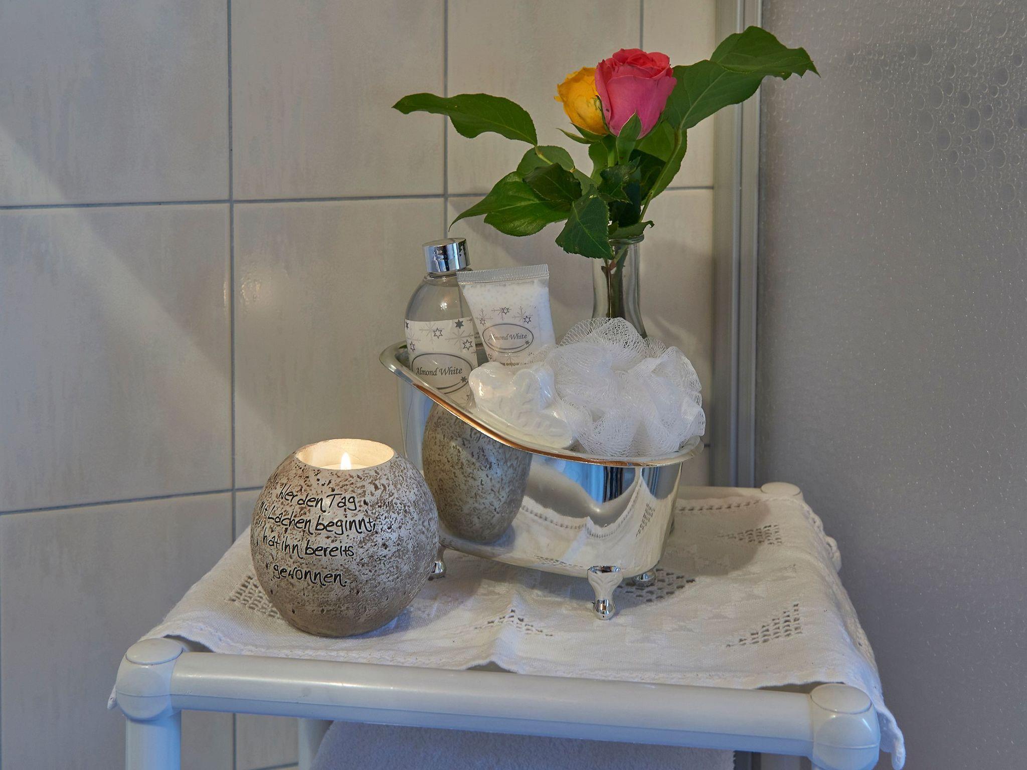 Bathroom: shower, washbasin, towel dryer, hairdryer;