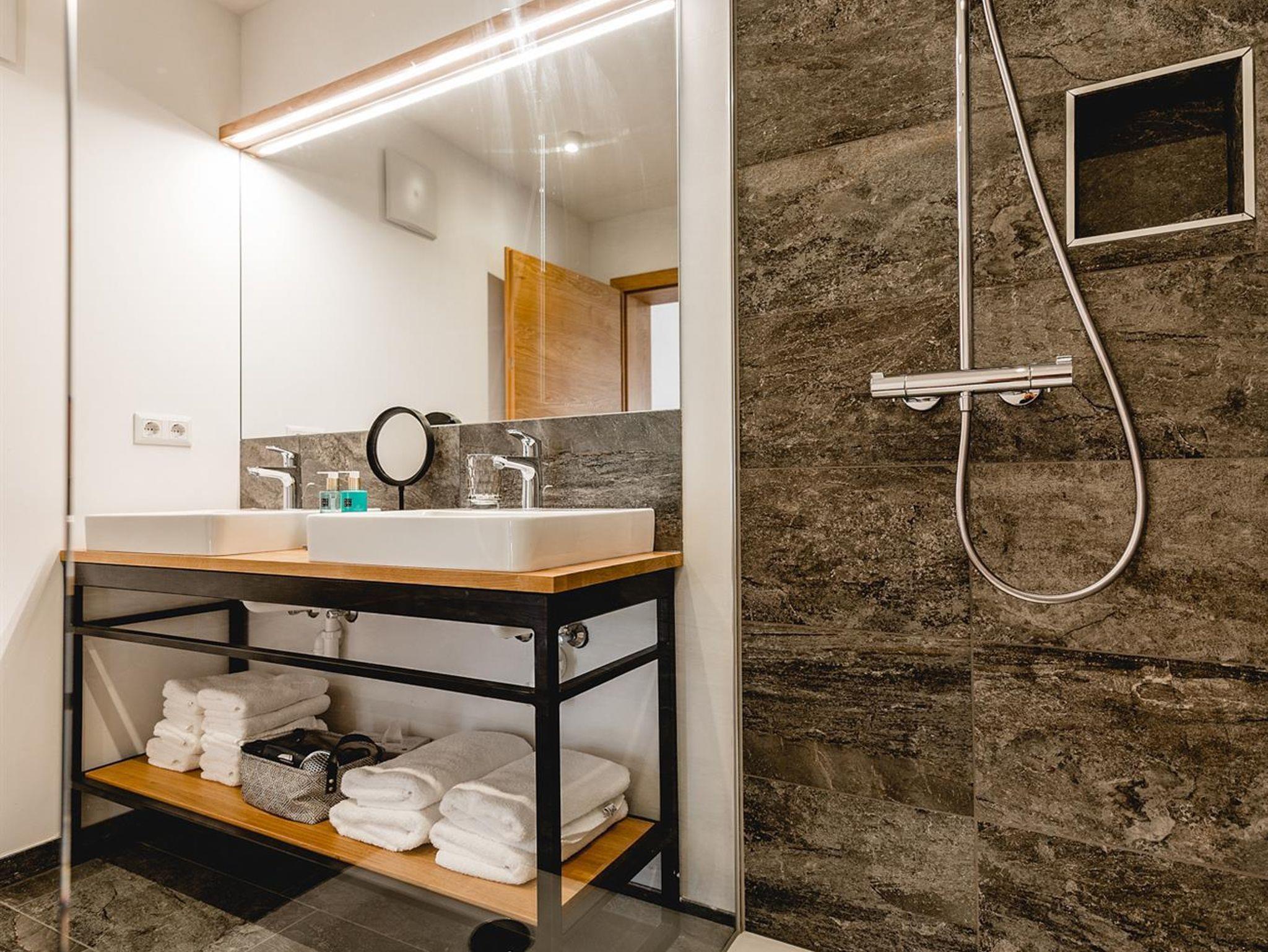 Cabin Typ Montscheinspitze ist für zwei bis vier Personen geeignet. Das 60m² große Appartement bietet zwei getrennte Schlafzimmer, davon ist eines mit einem Designer-Etagenbett eingerichtet. Es gibt zwei Bäder, ein separates WC sowie eine Terrasse mit direktem Gartenzugang.