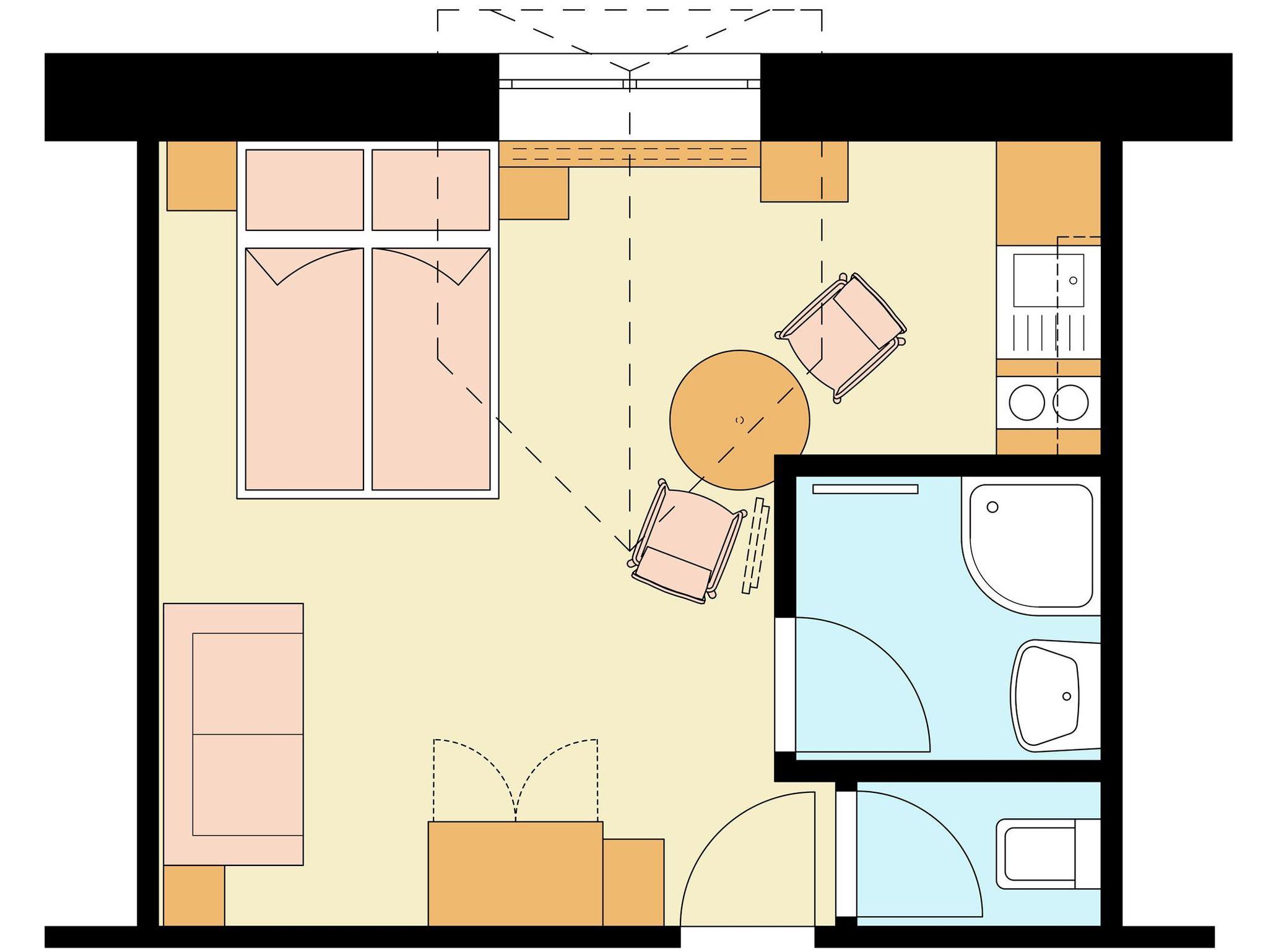 Dieses Studio ist ausgestattet mit einem Doppelbett, Tisch mit Stühlen, Sofa, kleine Küche mit Kühlschrank, Kochplatten, Mikrowelle mit Grill, Kaffeemaschine, Wasserkocher, Koch- und Tafelgeschirr, Sat-TV, Fön, Safe, Hand- und Badetücher, gratis W-Lan. Dusche und WC getrennt.