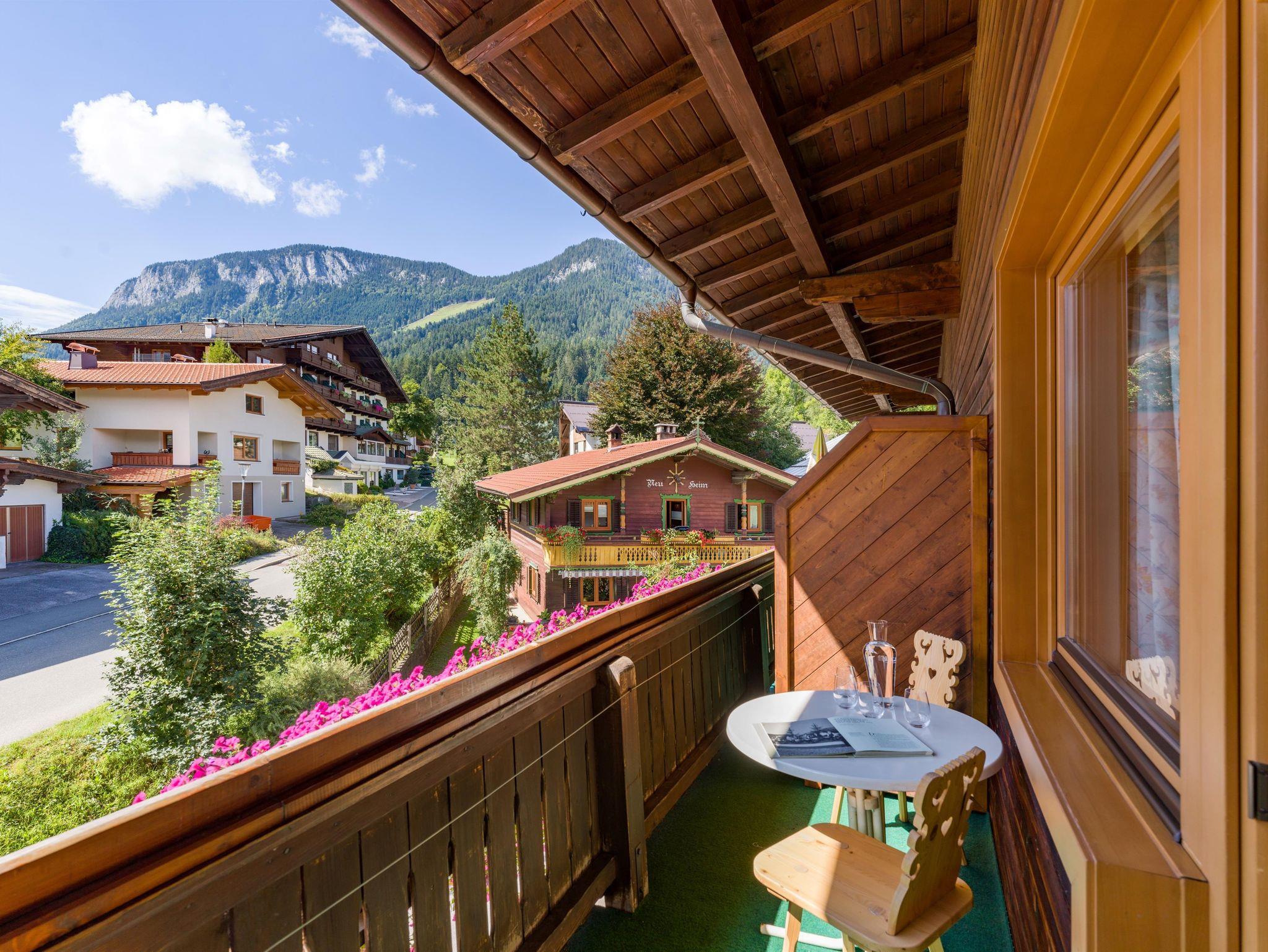 Unsere Doppelzimmer verfügen über ein Bad mit Dusche oder Badewanne, WC, Körperpflegeartikel, Bademäntel und Slipper, W-Lan, TV, Telefon, Radio, Safe und Balkon mit Blick auf den Wilden Kaiser oder die Hohe Salve.