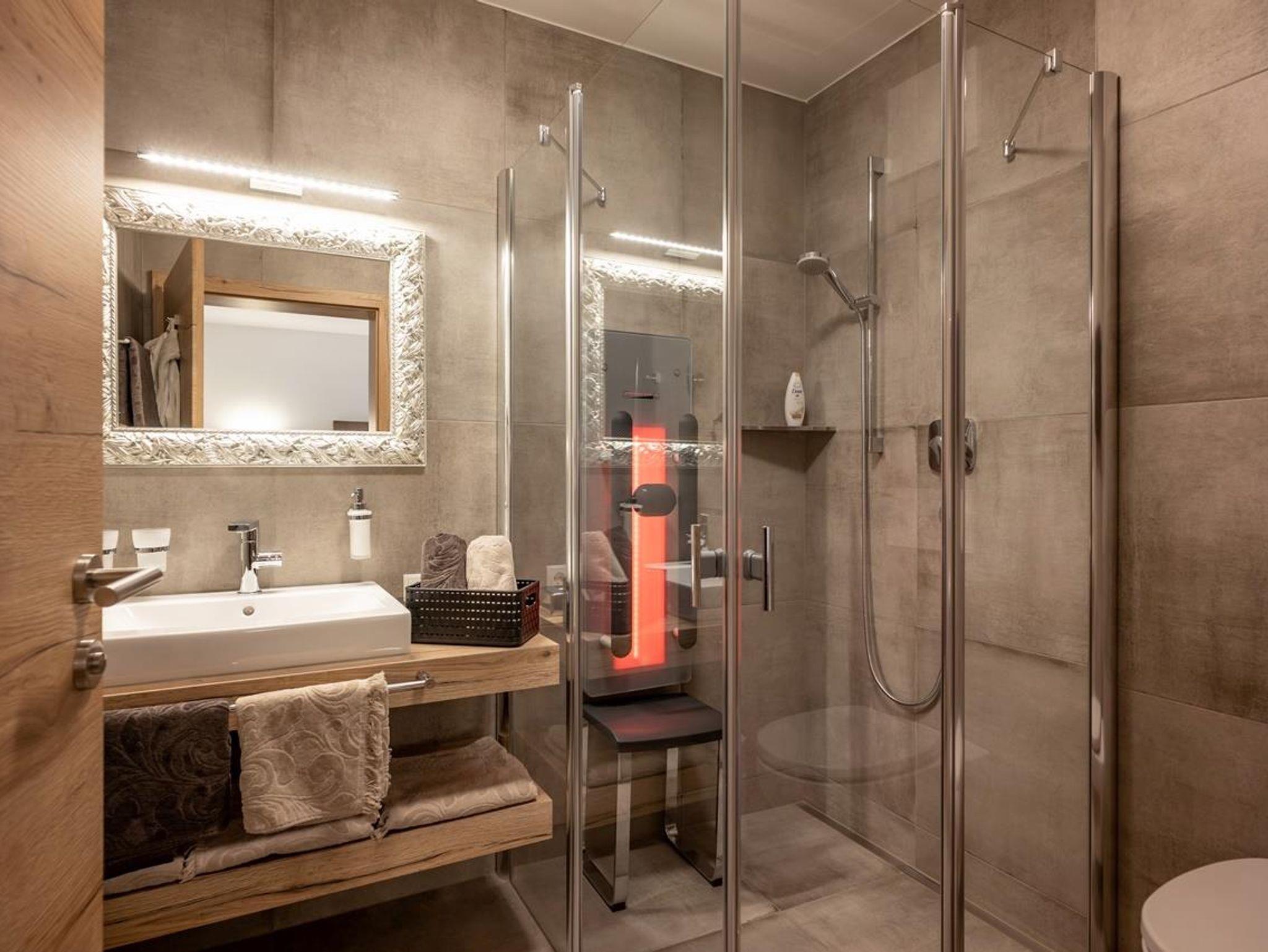3 Badezimmer mit Dusche und integrierter Infrarotkabine, WC, Masterbad mit Regenbogendusche, werden höchsten Ansprüchen gerecht.