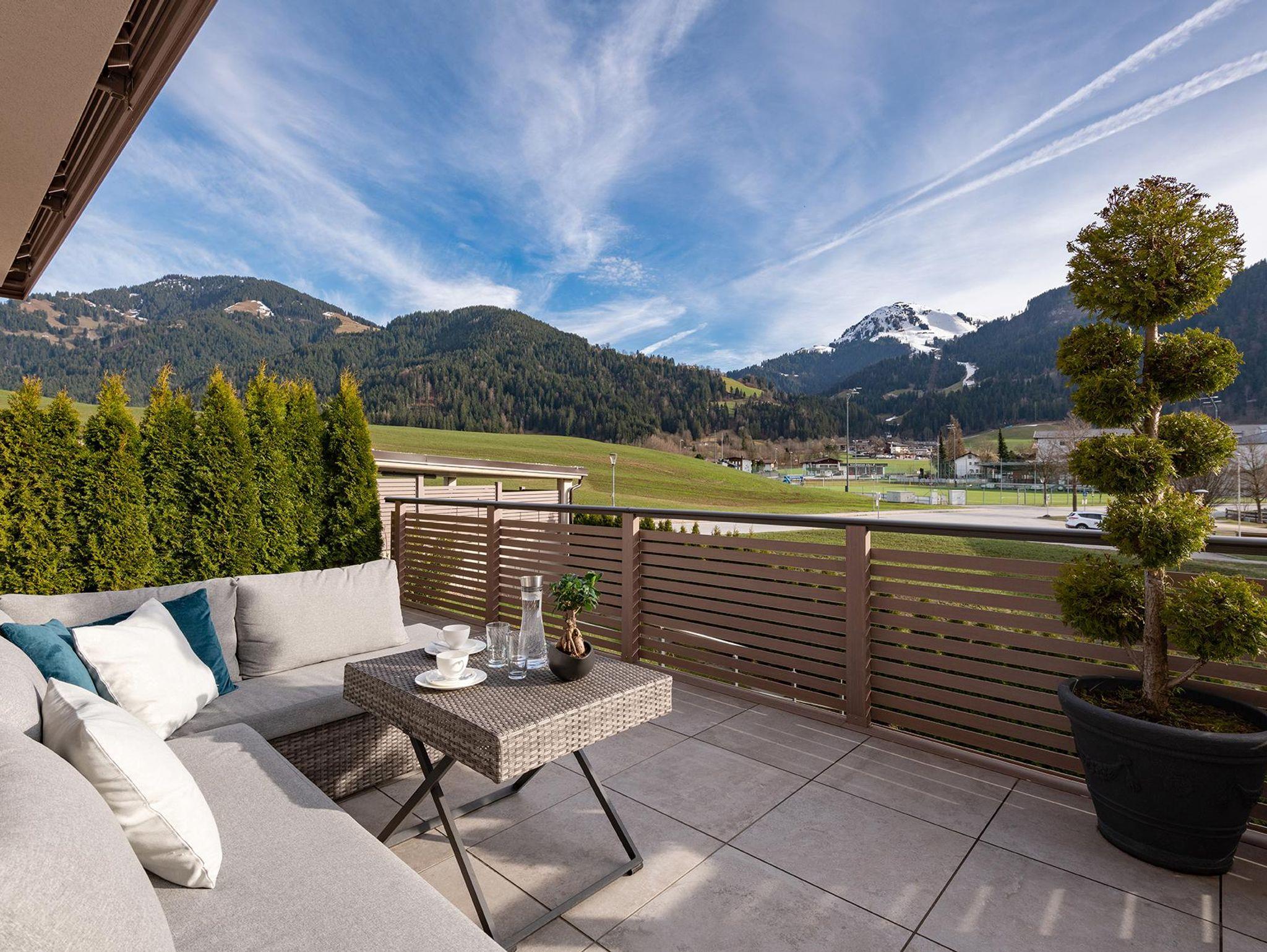 Im luxurösen Penthouse erwarten Sie 1 großzügige Doppelzimmer, 2 Dreibettzimmer und 1 Einzelzimmer mit komfortablen Boxspringbetten auf 135 qm Wohnfläche. Der traumhafte Blick zum Wilden Kaiser und der Hohen Salve von der 40 qm möblierten Terrasse und dem Balkon ist überwältigend.