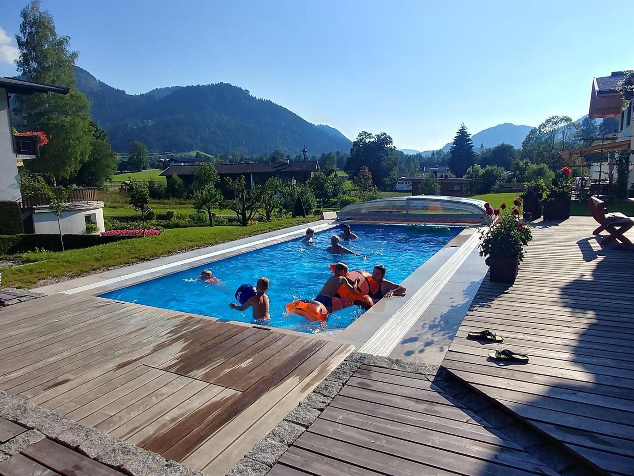 Unsere Apartments sind komfortabel eingerichtet mit einer herrlichen Aussicht auf die Hohe Salve und WilderKaiser, ca.10 Gehminuten vom Ortszentrum und Badesee entfernt. Im Garten befindet sich ein Swimmingpool, der bei gutem Wetter im Nachmittag genutzt werden kann.