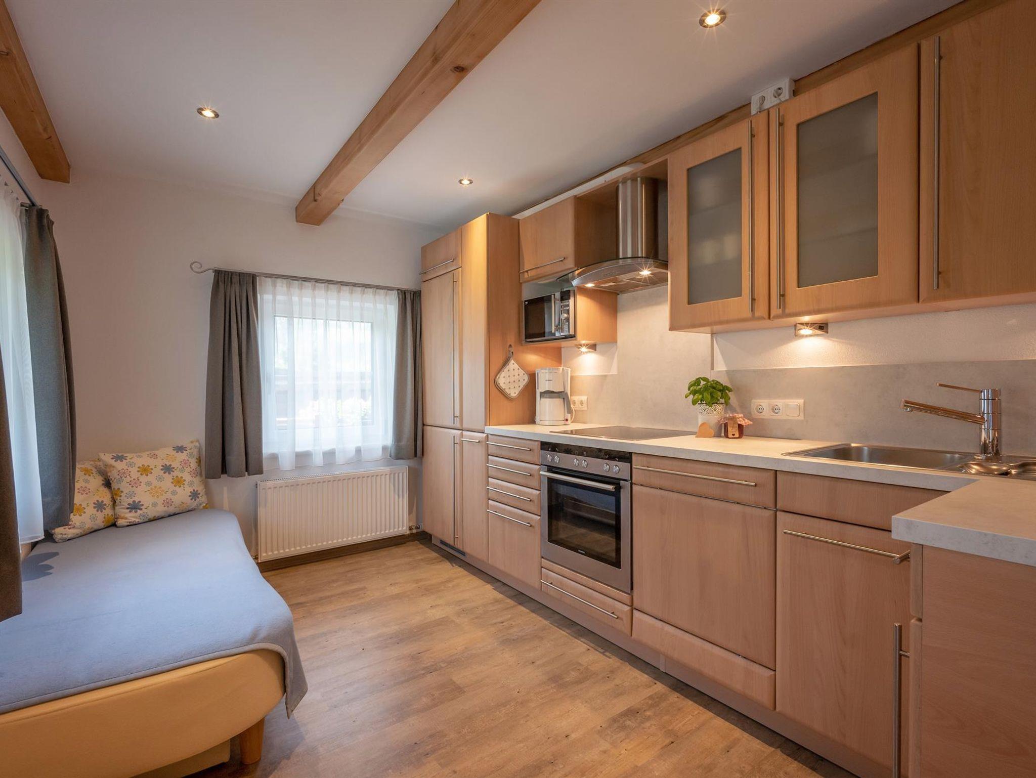 Die Ferienwohnung hat eine Gesamtgröße von ca. 35m² und wird unterteilt in 1 Schlafzimmer, 1 Wohnküche in der sich eine Schlafcouch befindet die für 2 Personen ausgezogen werden kann (180x200), WC, Bad (Dusche + Badewanne), sowie ein kleiner Flur mit Garderobe. Ausstattung: Bettwäsche, Dusch- und Handtücher, Geschirrtücher, Fön, Kaffeemaschine, Herd + Backrohr, Kühlschrank mit kleinem Gefrierabteil, Wasserkocher, Toaster, Sat – TV.