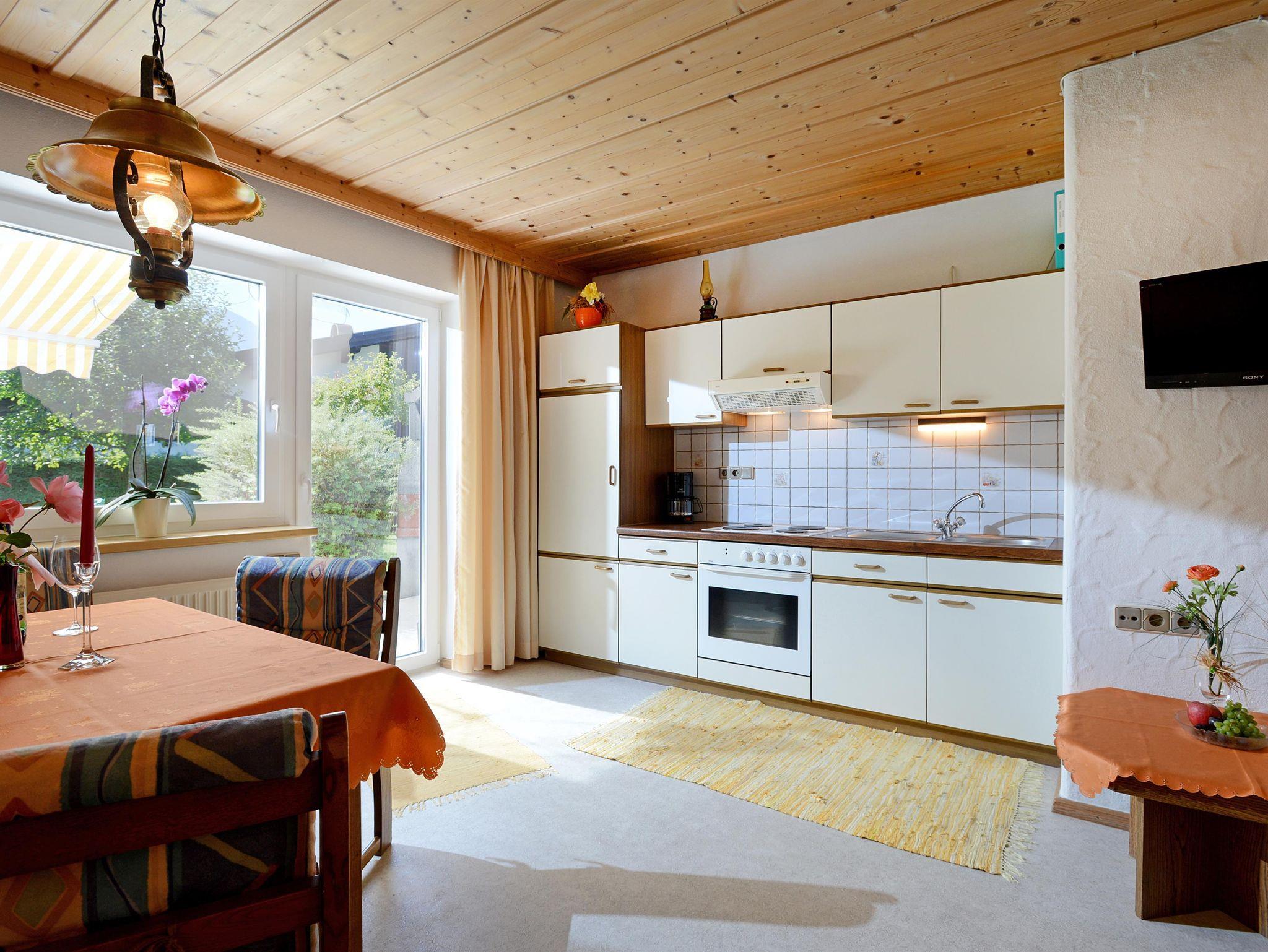 Unser gemütliche Ferienwohnung (Parterre-Lage) im Tiroler Stil ist ausgestattet mit 2 Schlafräumen (1 Dreibettzimmer, 1 Doppelzimmer), 1 Wohnküche mit Geschirrspülmaschine und Doppelschlafcouch, Dusche/WC und großzügige Spiel- und Liegewiese.