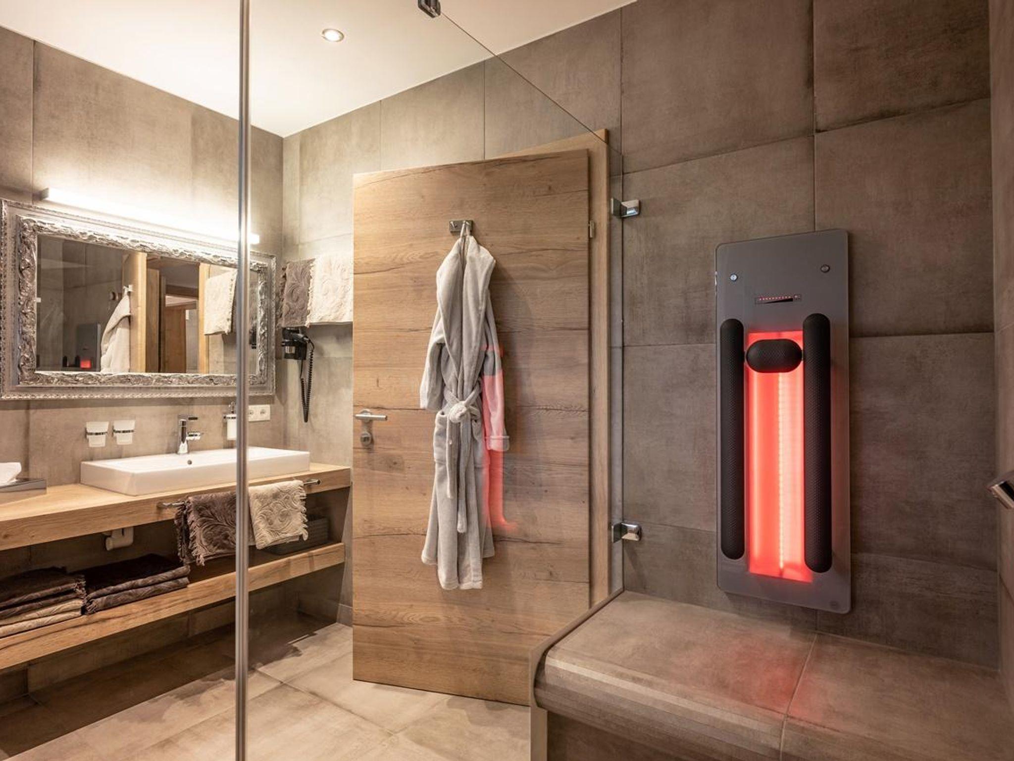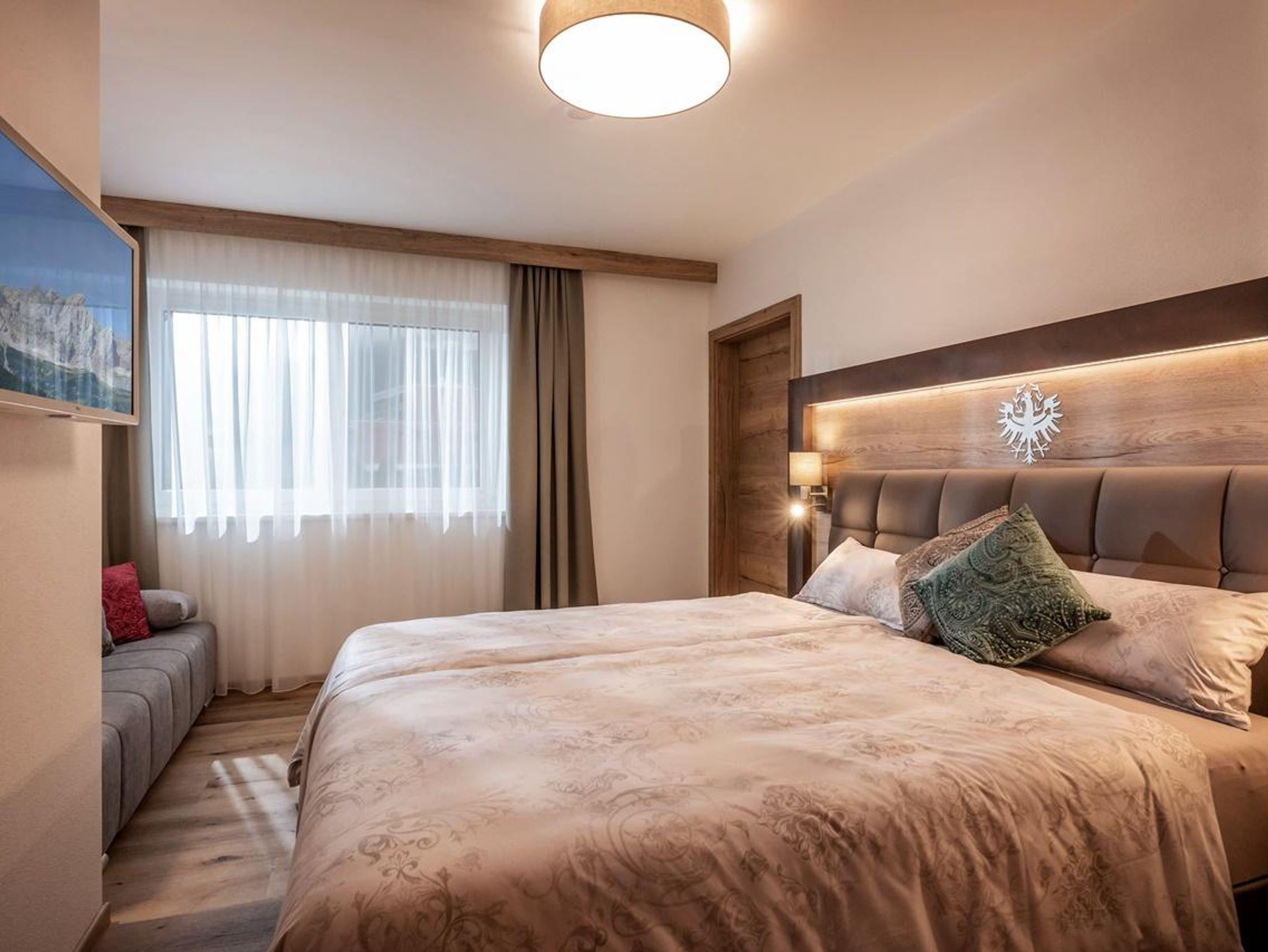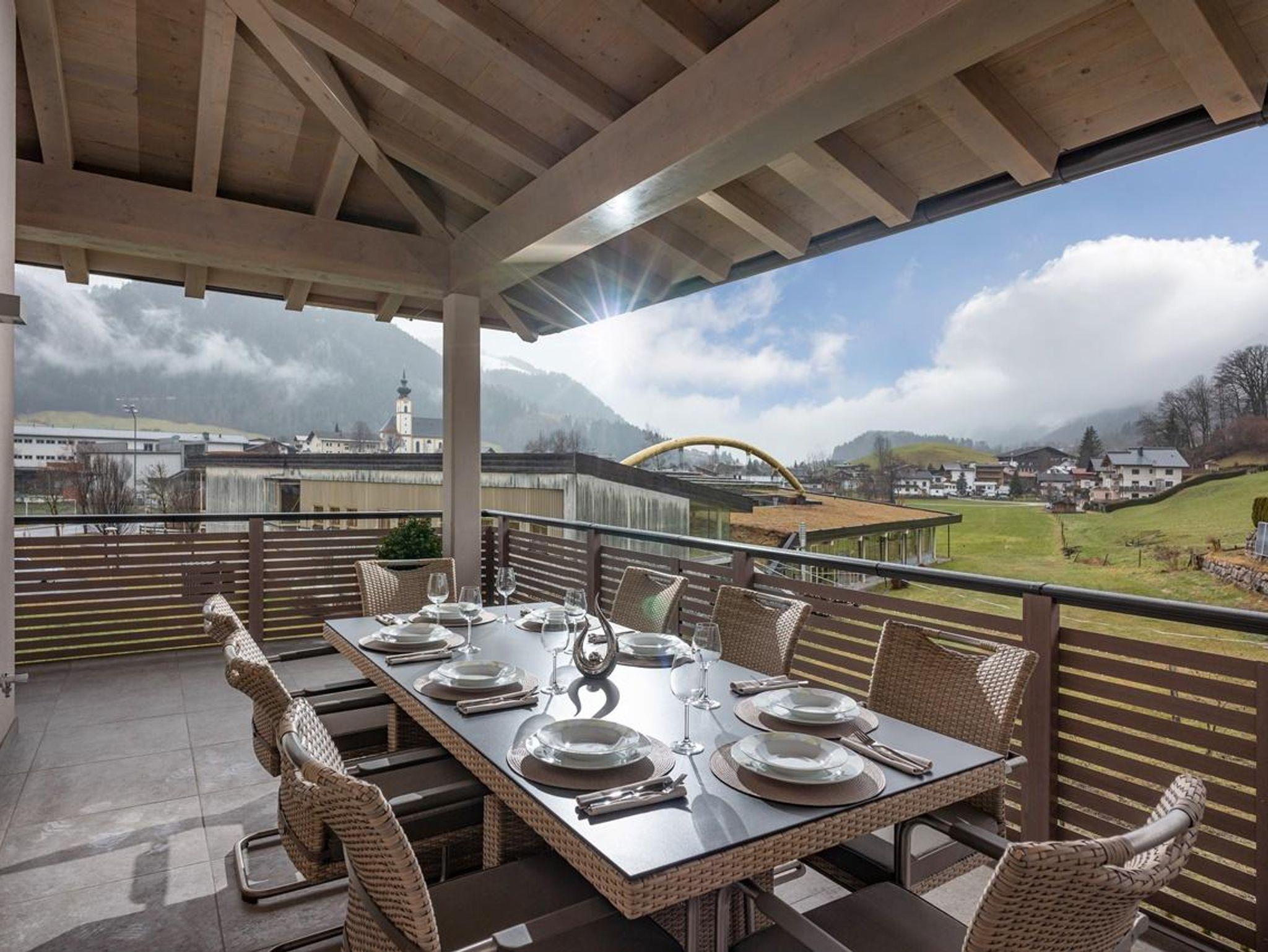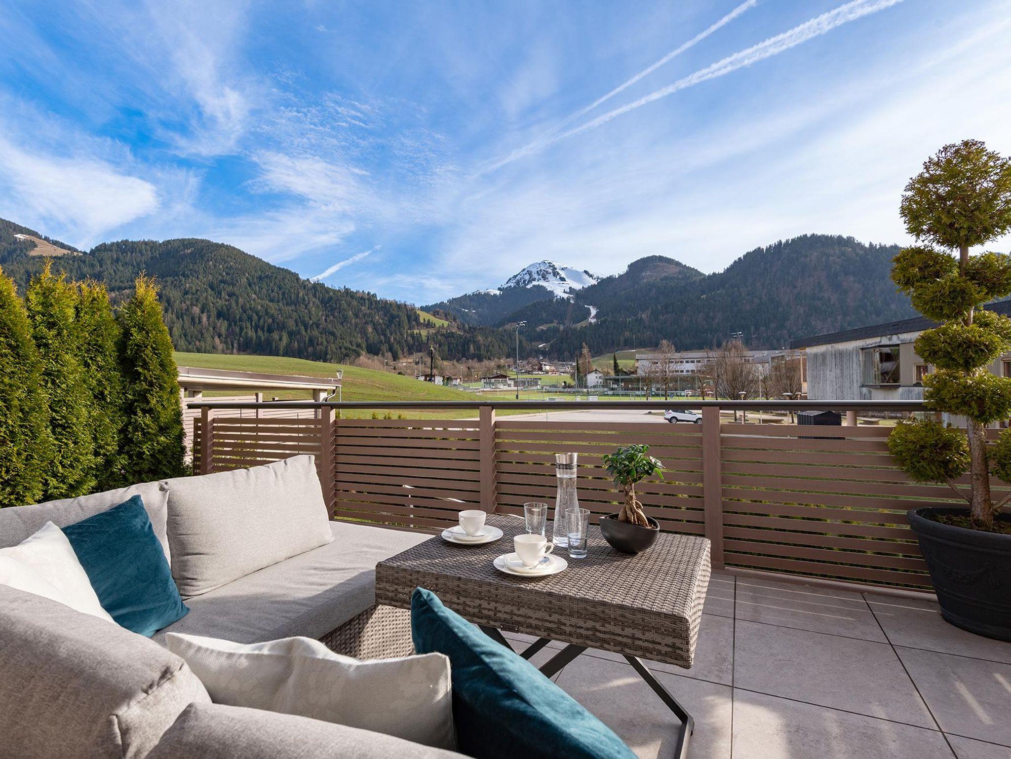 In der luxuriösen Panorama-Suite erwarten Sie 1 großzügige Doppelzimmer und 2 Dreibettzimmer mit komfortablen Boxspringbetten auf 135 qm Wohnfläche. Der traumhafte Blick zum Wilden Kaiser und der Hohen Salve von der 70 qm möblierten Terrasse und dem Balkon ist überwältigend.