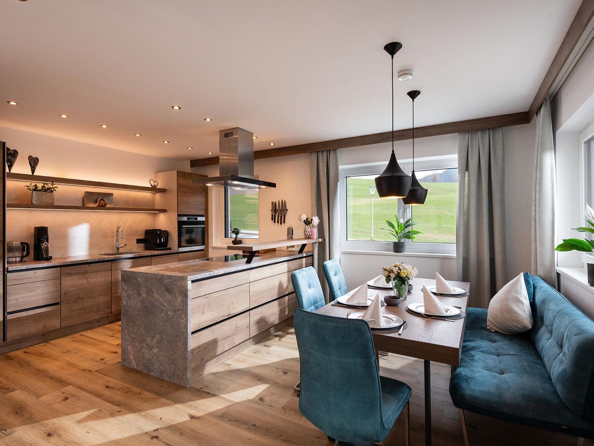 Eine top ausgestattete Küche mit Kochinsel, Geschirrspüler, Backofen, Induktionskochfeldern, Gefrier- und Kühlschrank, Kaffee und Kapselmaschine, SodaStream inklusive Kohlensäure, kompletter Geschirrausstattung, sowie ein großer Essbereich für bis zu 8 Personen lassen höchste Genüsse zu.