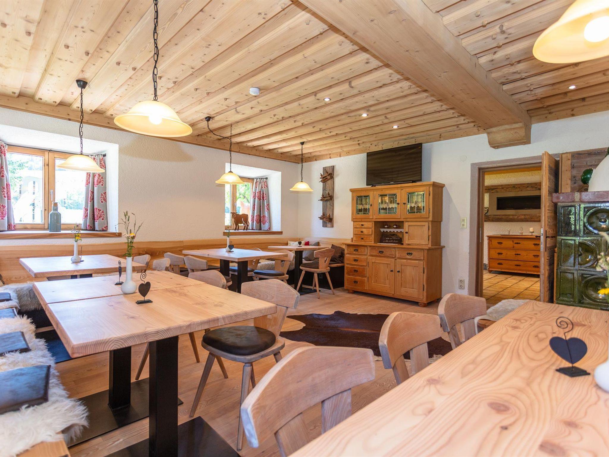 Unser gemütlich rustikaler Frühstücksraum verwandelt sich am Abend zum netten Aufenthaltsraum.