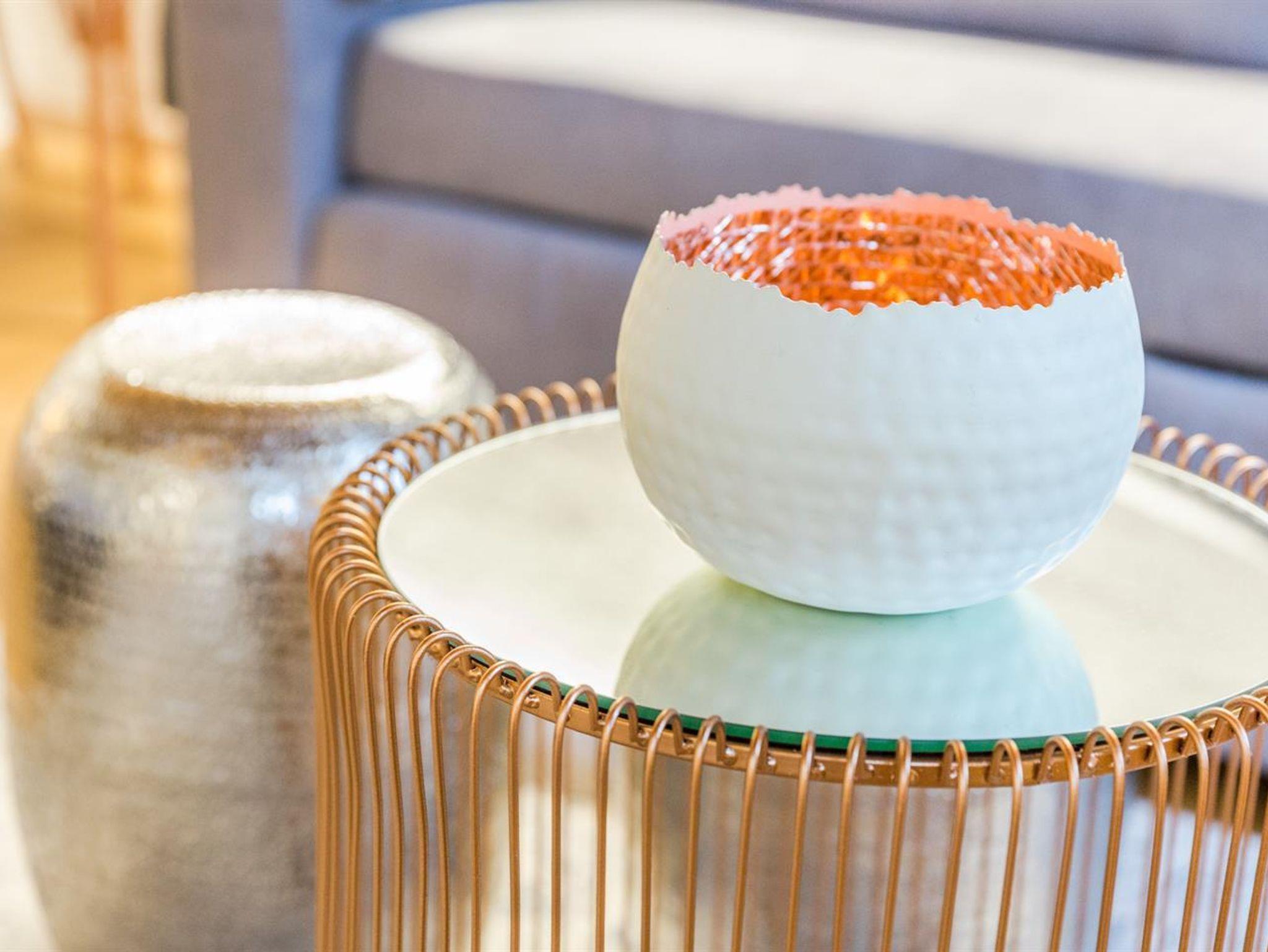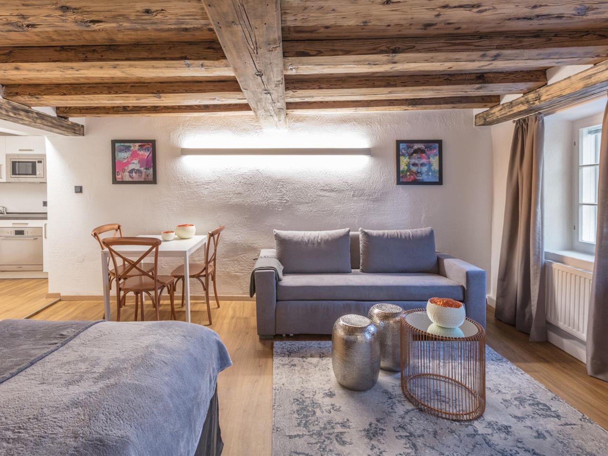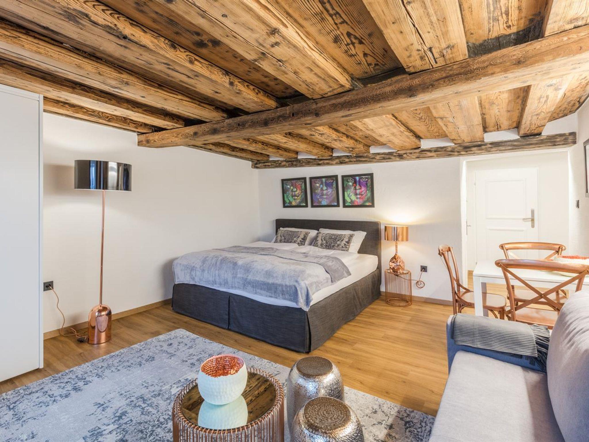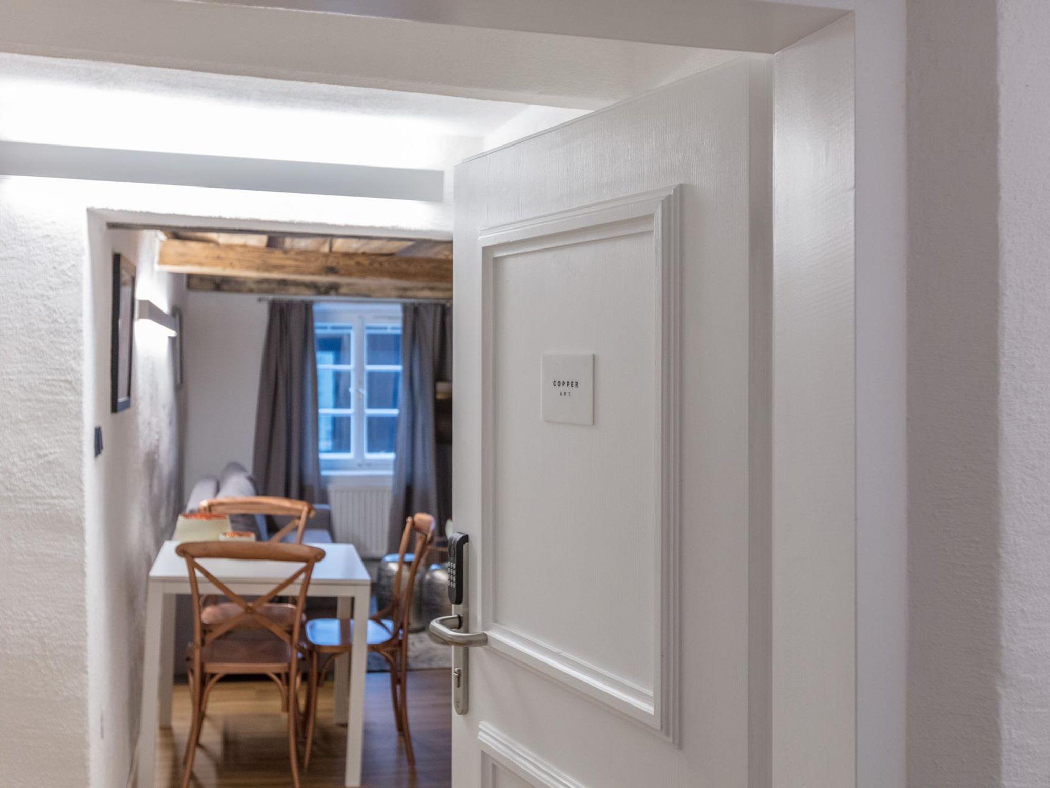 Der COPPER ROOM mit ca. 30 m², liegt im 3. Stock der Stein Lodge, umfasst ein Boxspring – Doppelbett, einen Tisch mit 2 Stühlen, einen Couch zum Ausziehen mit Couchtisch. Voll ausgestattete kompakte Küche mit Kochfeld und Cremesso Kaffeemaschine. Das Badezimmer verfügt über Dusche, WC und Waschtisch.