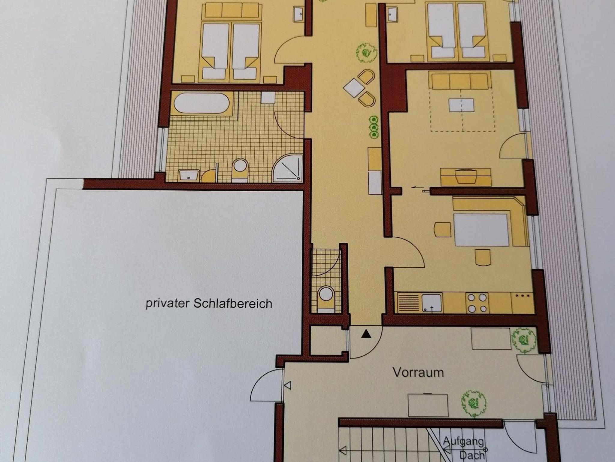 85 qm Wohnfläche, 2 Schlafzimmer, 1 Wohn-(Schlaf)-Zimmer, voll ausgestattete Küche, separates Bad mit Dusche/WC, zusätzlich separates WC; auf 3 Seiten mit Balkon umgeben.