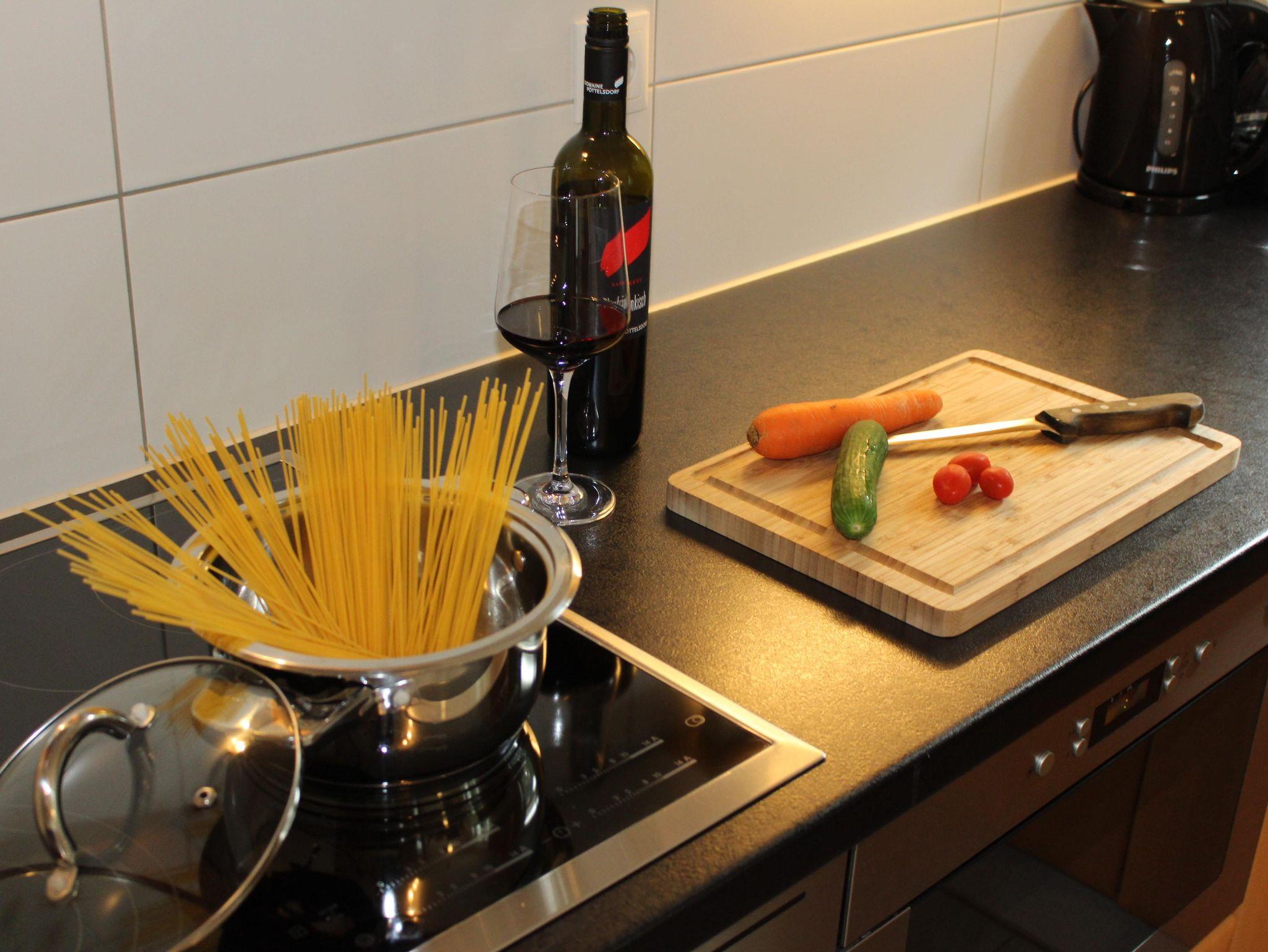 • voll ausgestattete Küche mit Cerankochfeld, Dunstabzug, Backofen, Mikrowelle, Kühlschrank mit Gefrierfächer, Filterkaffeemaschine, Wasserkocher, Eierkocher, Toaster, Spühlmaschine und die wichtigsten Kochutensilien