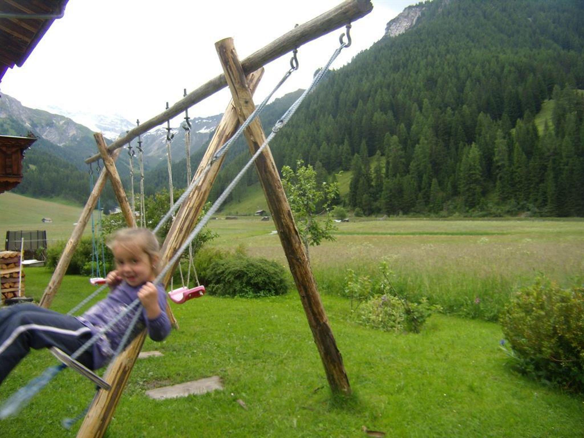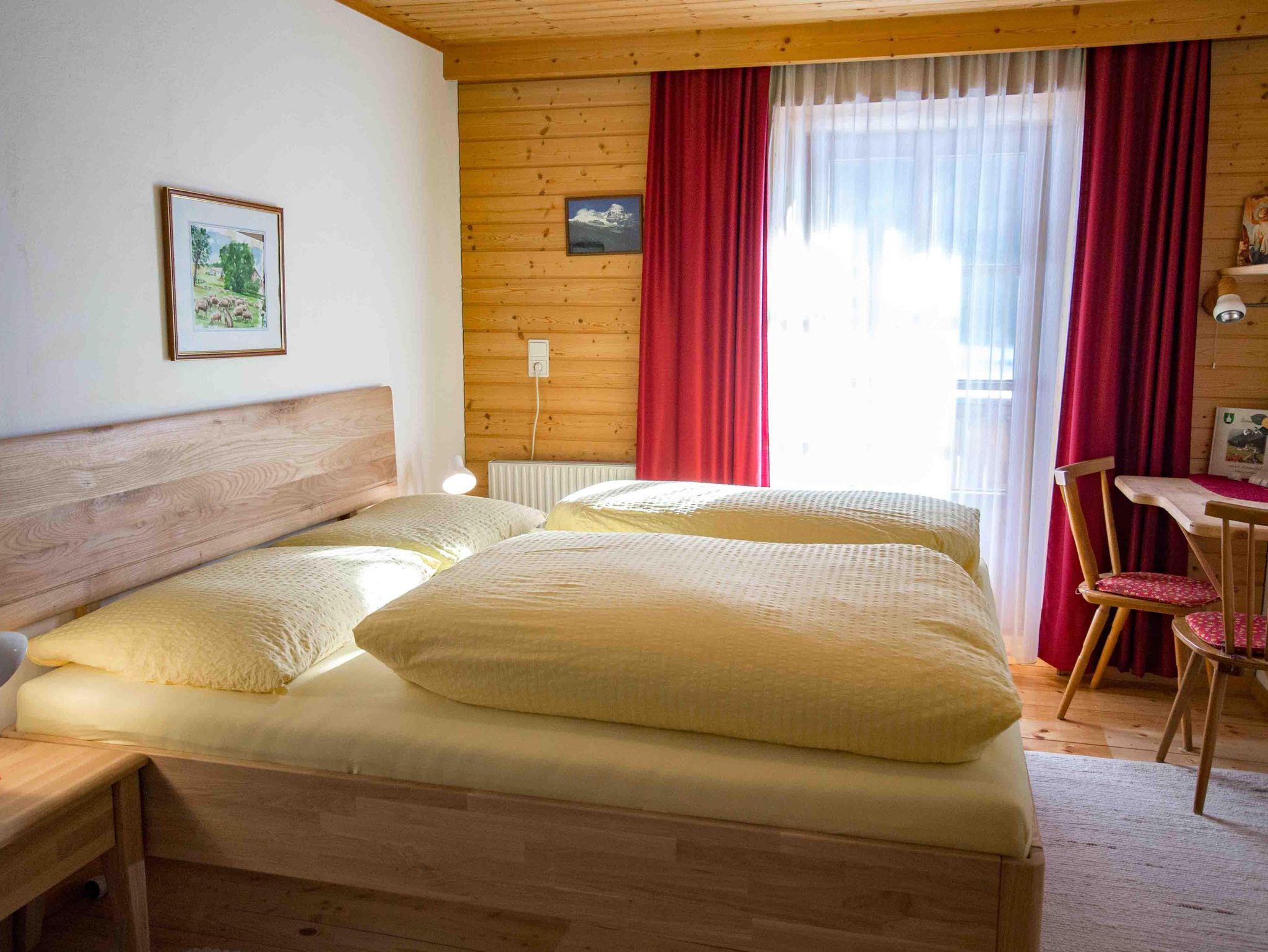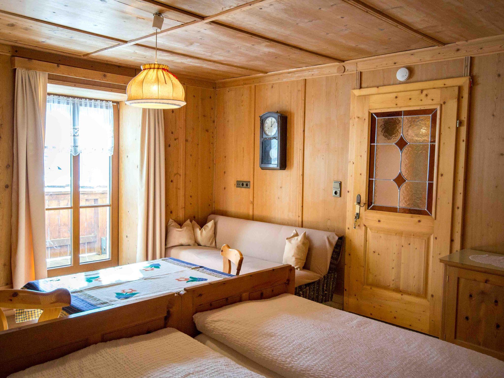 Die große Ferienwohnung im ersten Stock besteht aus drei Schlafzimmern, einer Küche und einem Badezimmer mit getrennter Toilette. Vom Schlafzimmer und der Küche gibt es eine Tür zum Balkon mit herrlichem Ausblick nach Osten auf den höchsten Berg der Region, dem Olperer und nach Süden talauswärts. Das große Schlafzimmer mit Doppelbett ist komplett in Holz getäfelt und mit Zirbenmöbeln ausgestattet. Auf Anfrage kann noch ein weiteres Doppelzimmer im selben Stock gemietet werden.