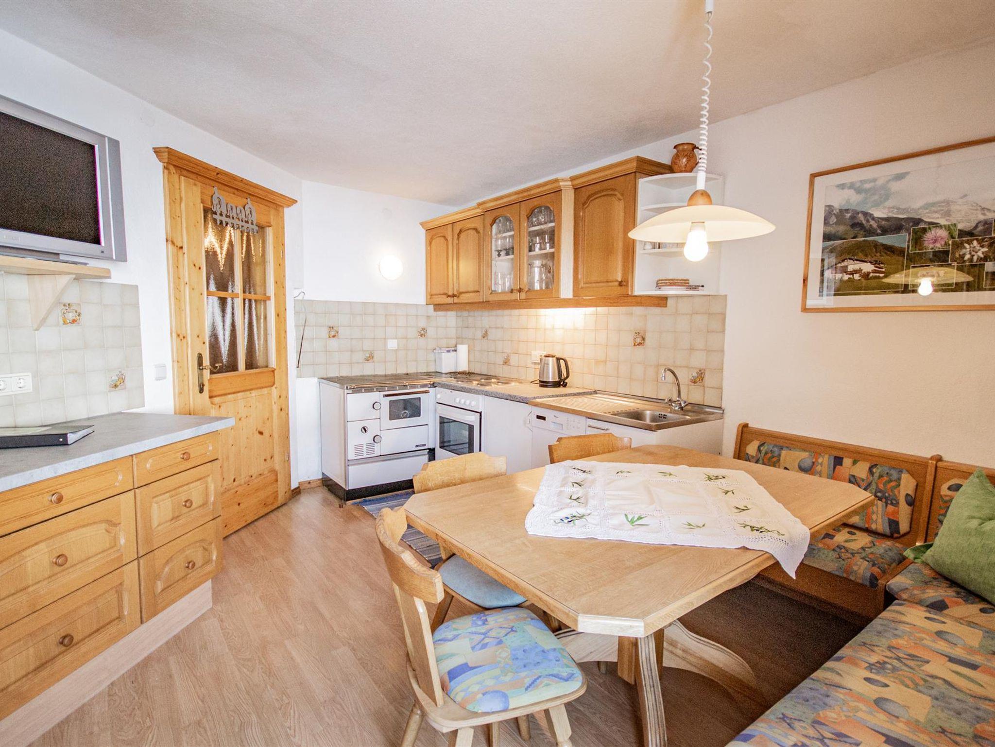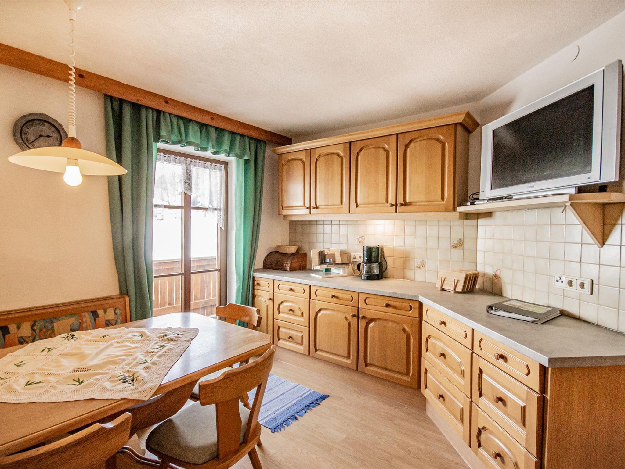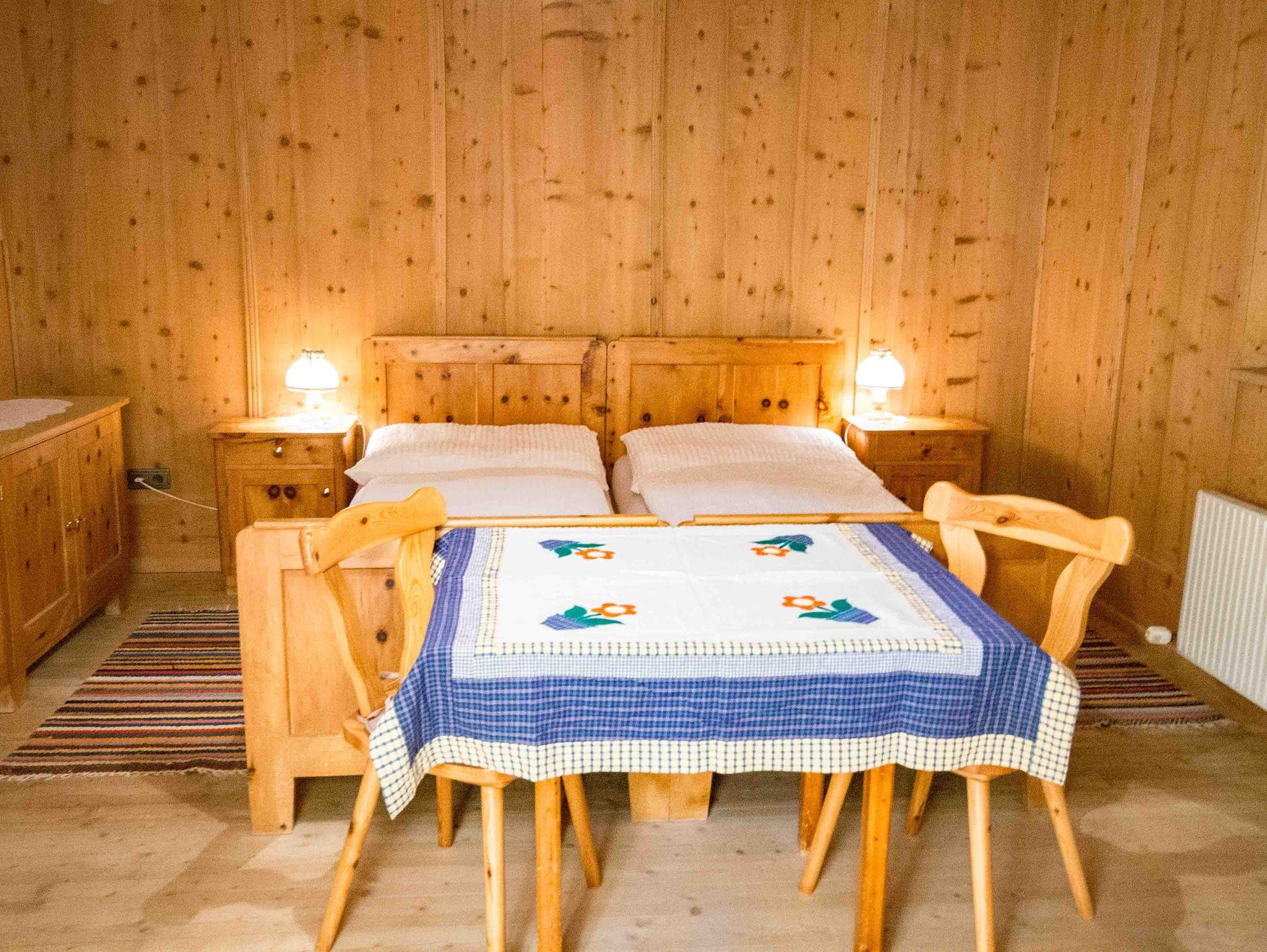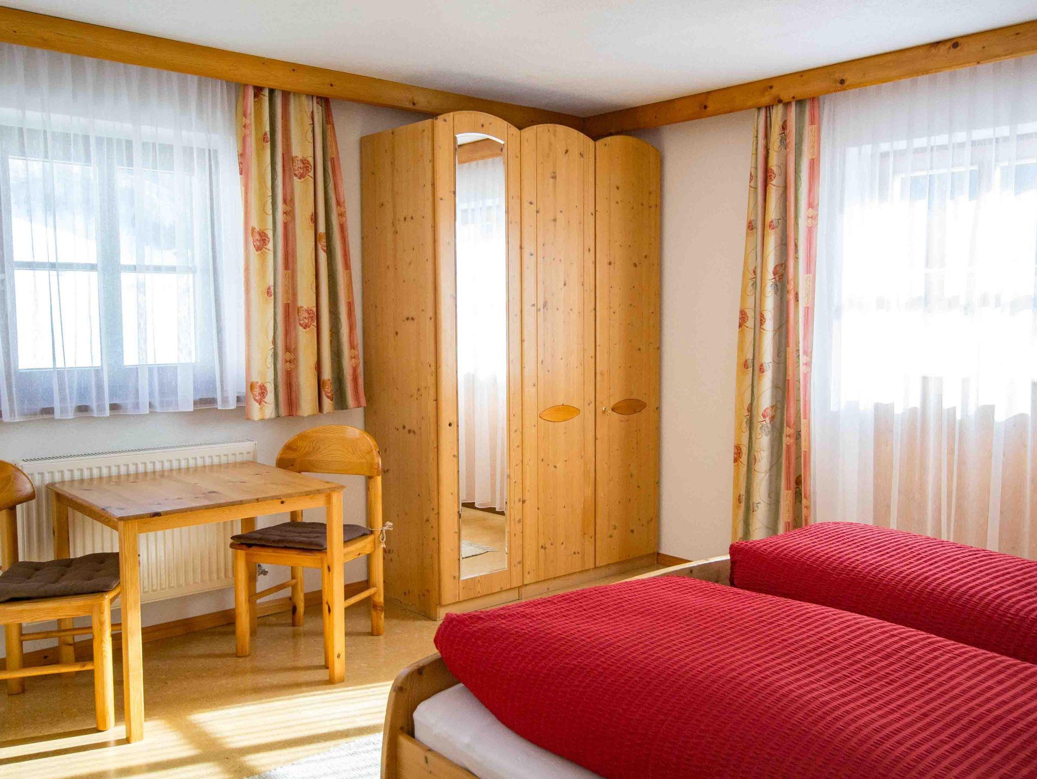 Die große Ferienwohnung im ersten Stock besteht aus drei Schlafzimmern, einer Küche und einem Badezimmer mit getrennter Toilette. Vom Schlafzimmer und der Küche gibt es eine Tür zum Balkon mit herrlichem Ausblick nach Osten auf den höchsten Berg der Region, dem Olperer und nach Süden talauswärts. Das große Schlafzimmer mit Doppelbett ist komplett in Holz getäfelt und mit Zirbenmöbeln ausgestattet. Auf Anfrage kann noch ein weiteres Doppelzimmer im selben Stock gemietet werden.