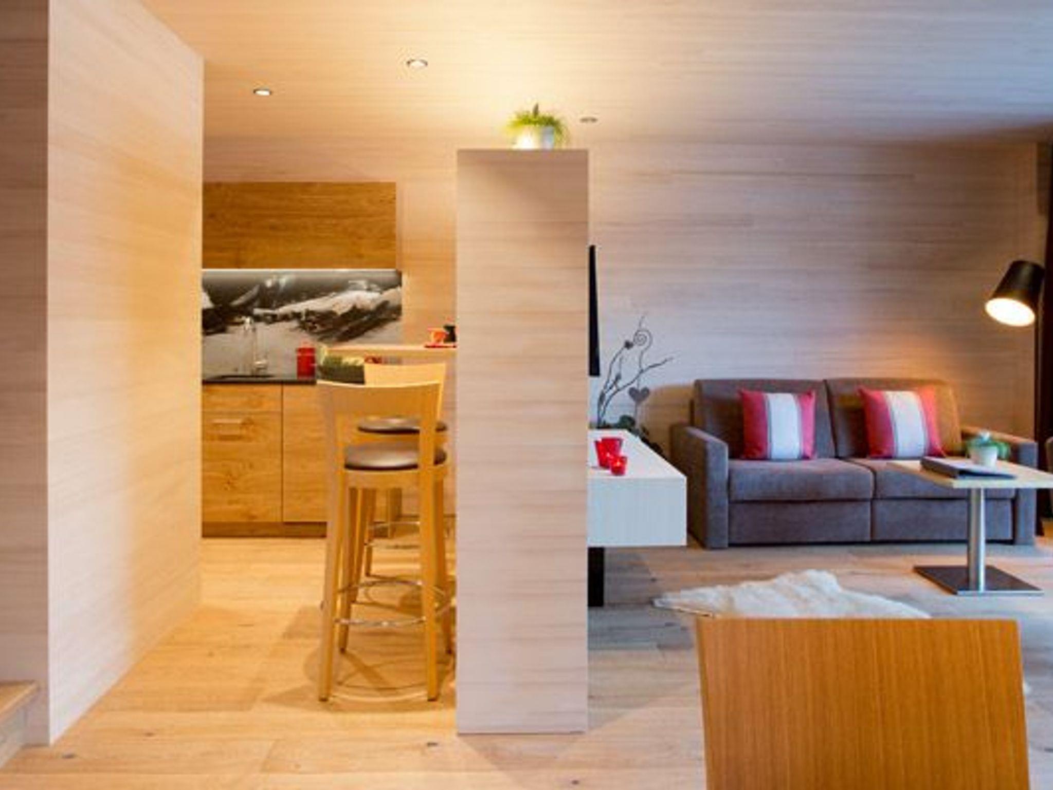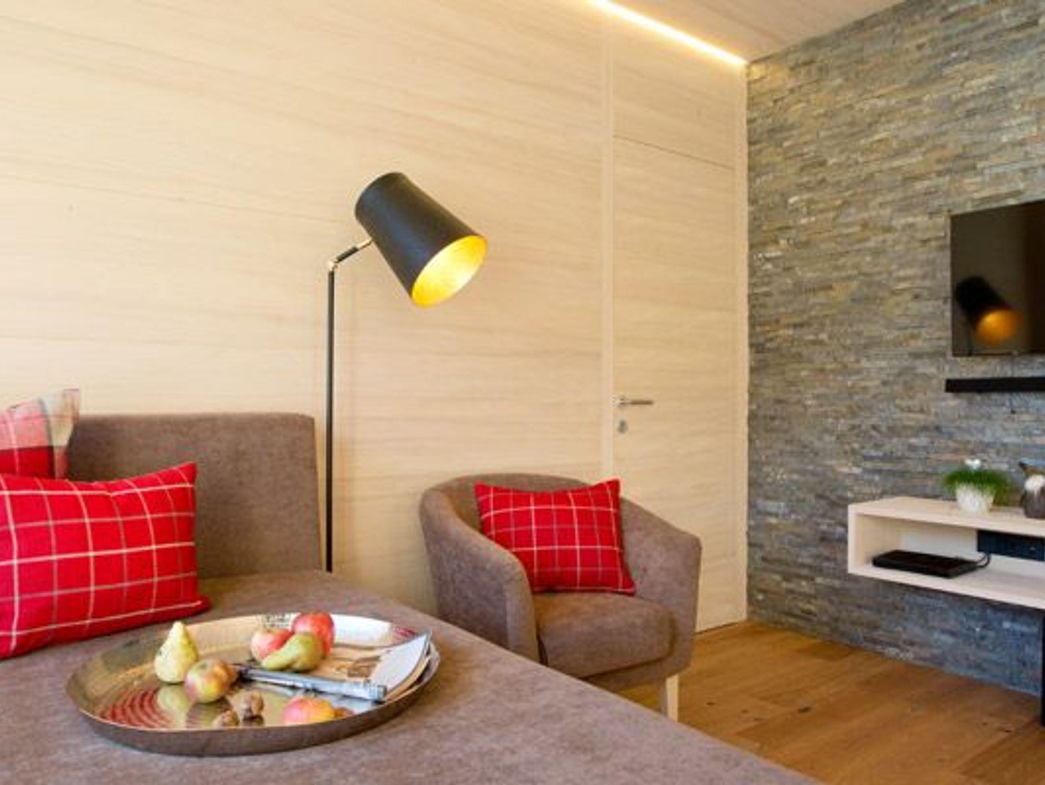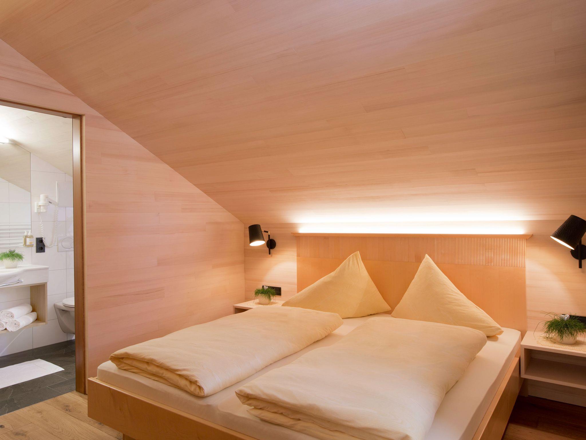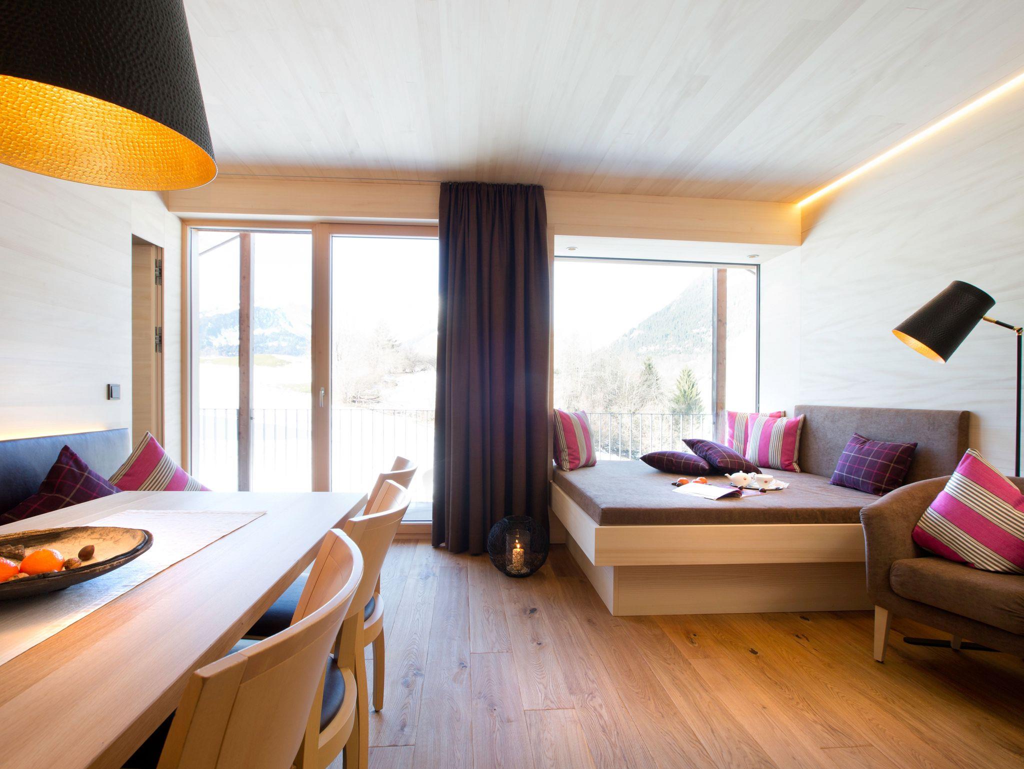 Alle Apartments sind mit hochwertigen Holzböden (Eiche Parkett), Wandvertäfelungen aus heimischer Weißtanne, Decken aus heimischer Weißtanne und Lehmputz ausgestattet.