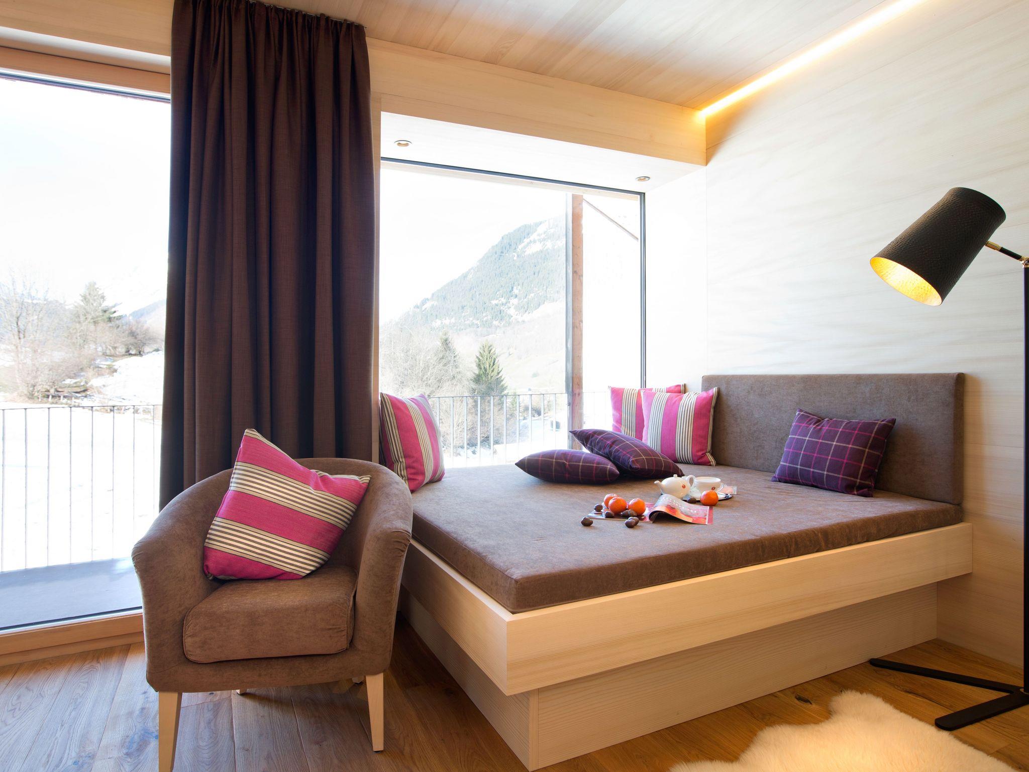 • Die großen Panoramafenster mit Wohlfühlcouch 190 x 190 cm (in Apartment 2, 3, 4, 5, 7, 8) ermöglichen einen unvergleichlichen Ausblick …