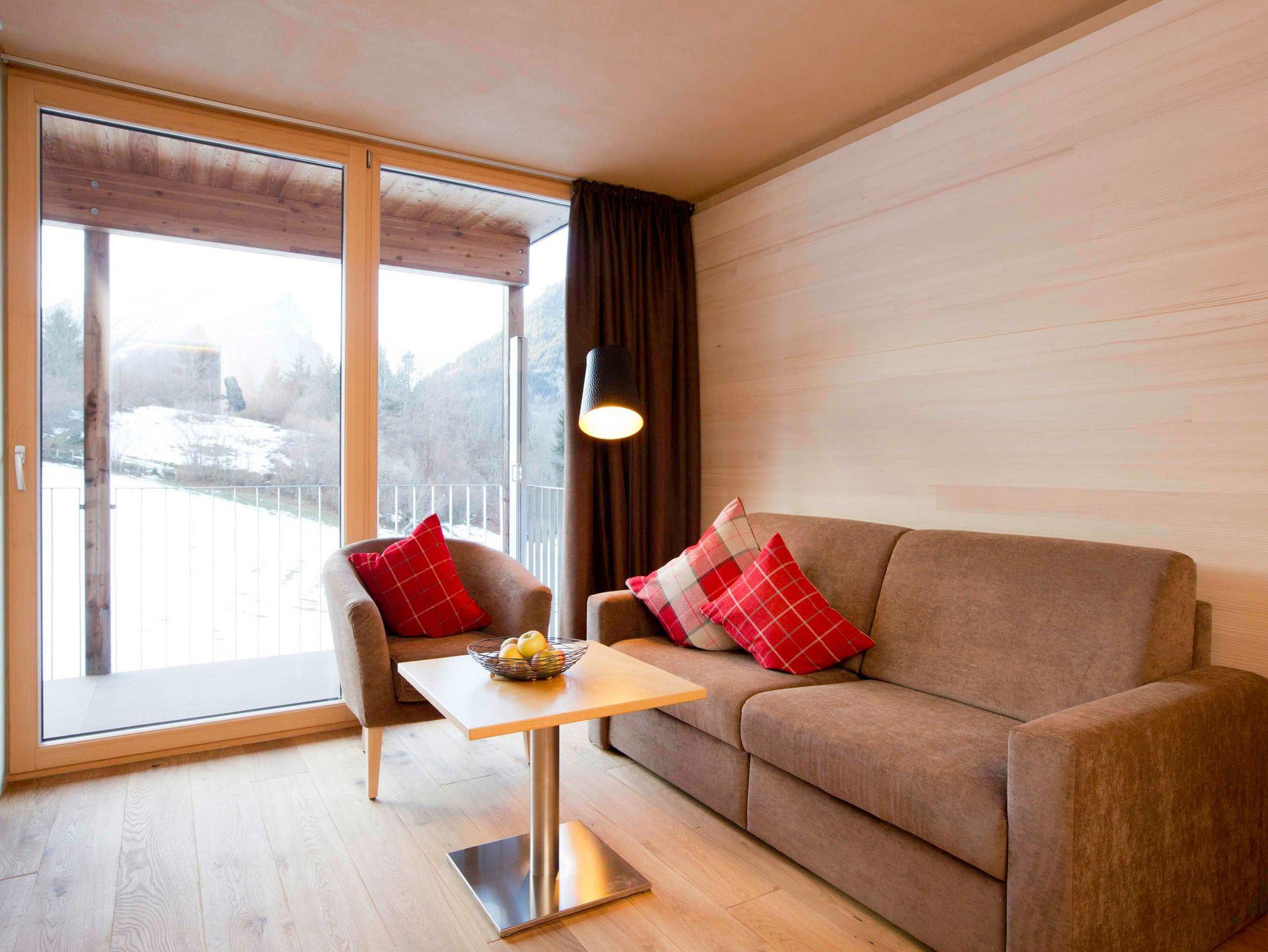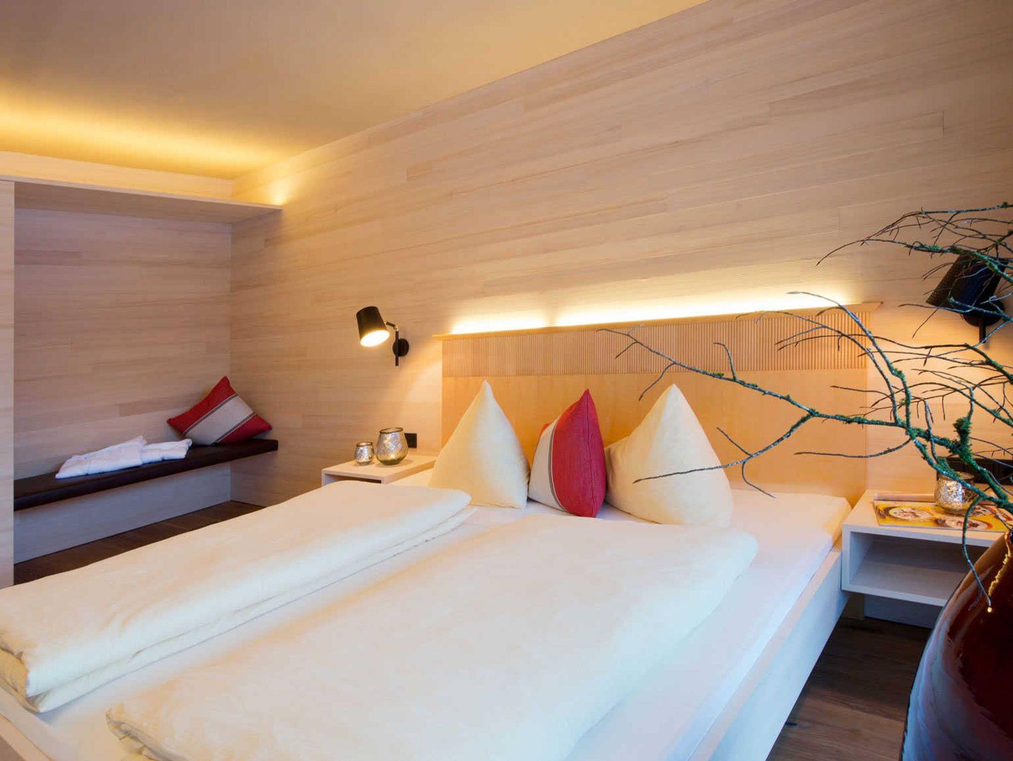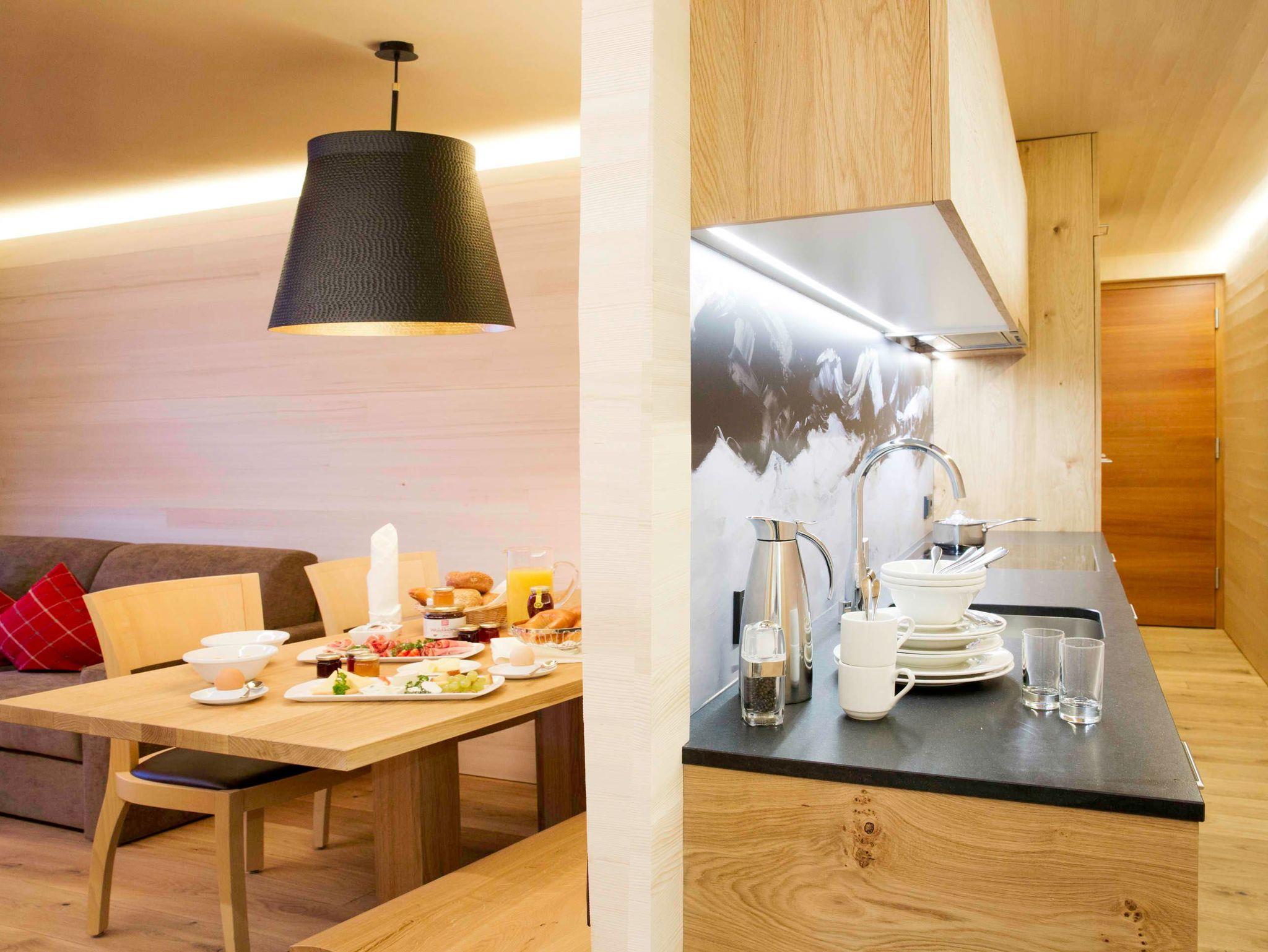 Alle Apartments sind mit hochwertigen Holzböden (Eiche Parkett), Wandvertäfelungen aus heimischer Weißtanne, Decken aus heimischer Weißtanne und Lehmputz ausgestattet.