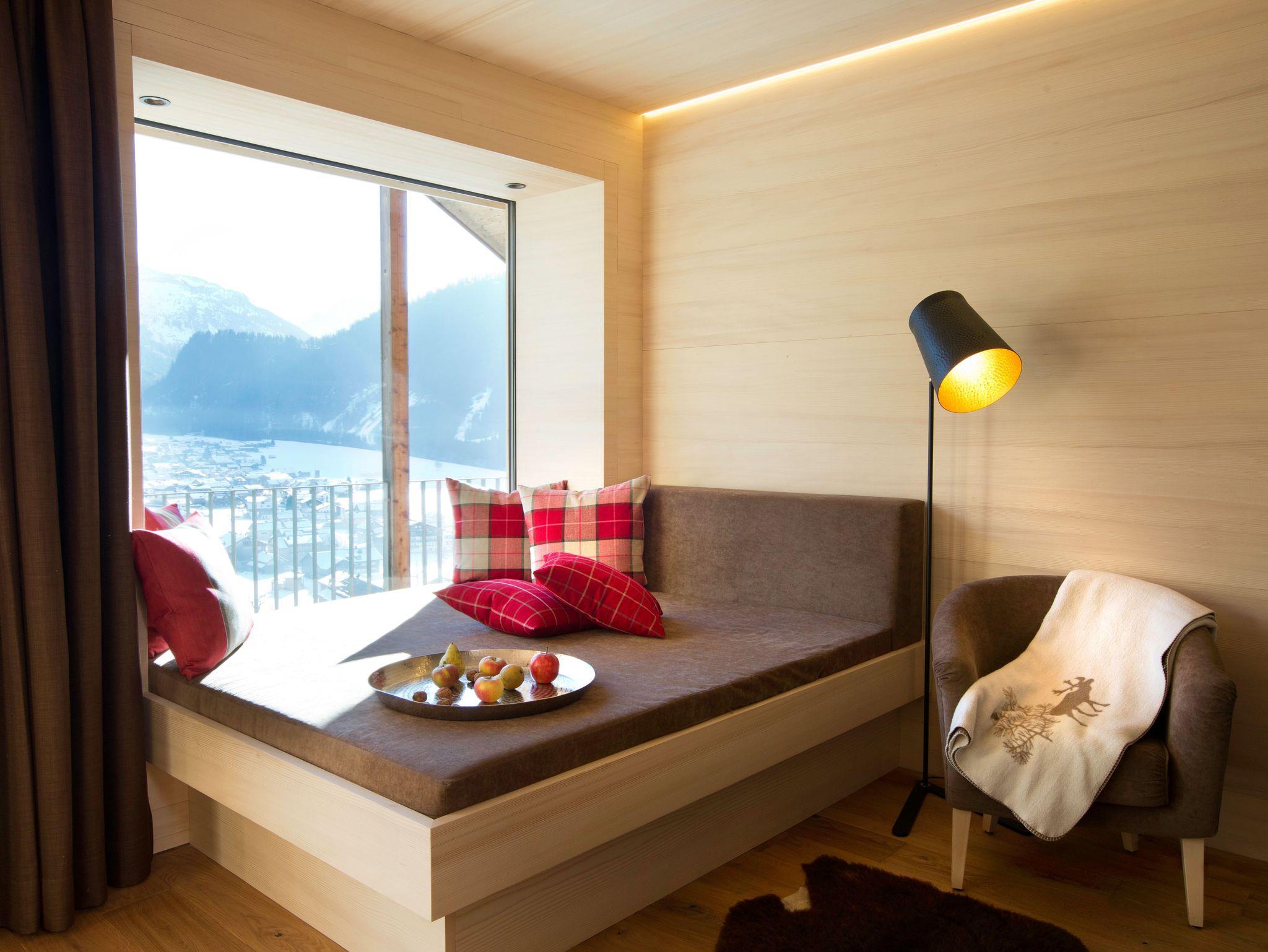 • Die großen Panoramafenster mit Wohlfühlcouch 190 x 190 cm (in Apartment 2, 3, 4, 5, 7, 8) ermöglichen einen unvergleichlichen Ausblick …