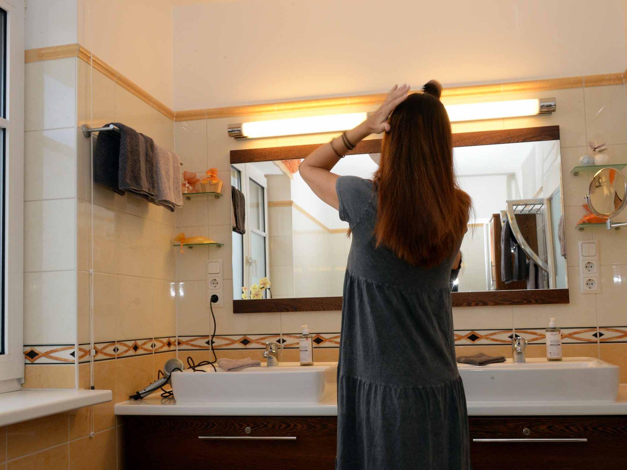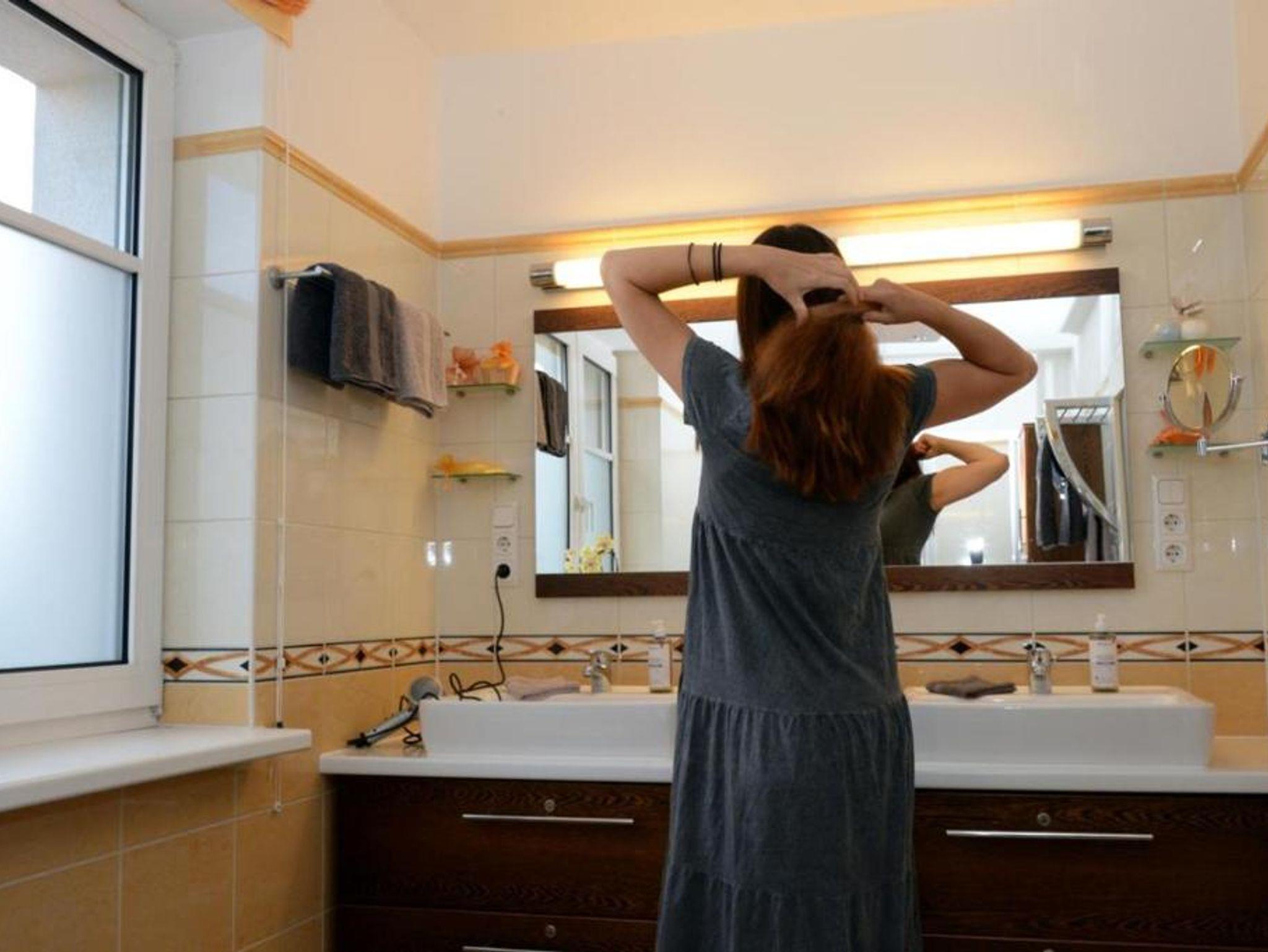 Handtücher, Duschtücher, Duschgel, Haarföhn sowie Waschmaschine und Waschmittel im Badezimmer.