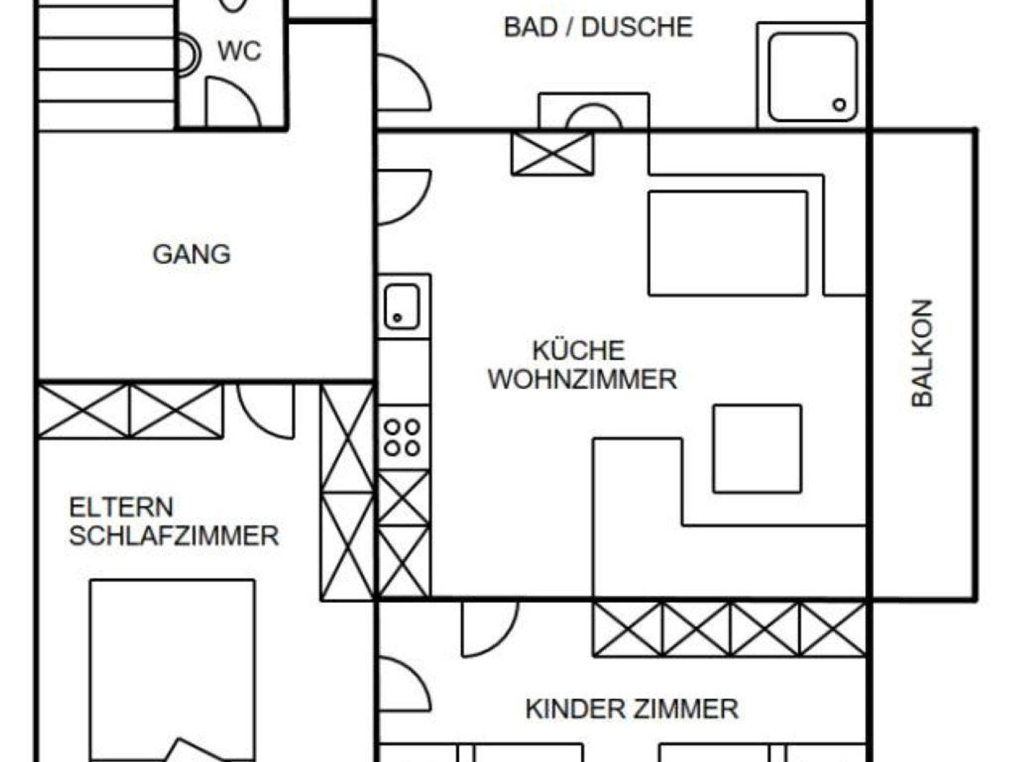 • 1 Doppelzimmer, 1 Zweibettzimmer, Wohnküche, Badezimmer, WC