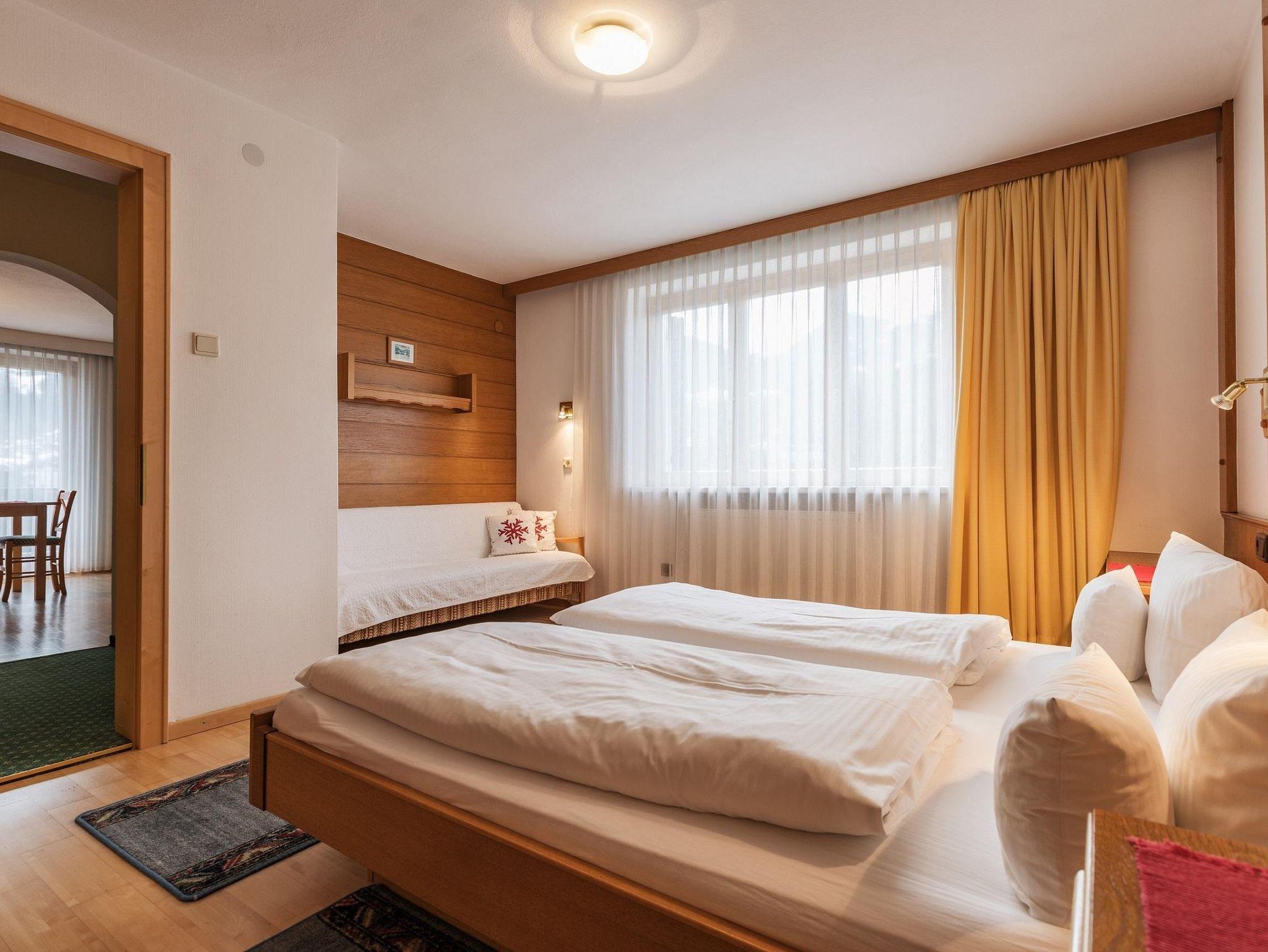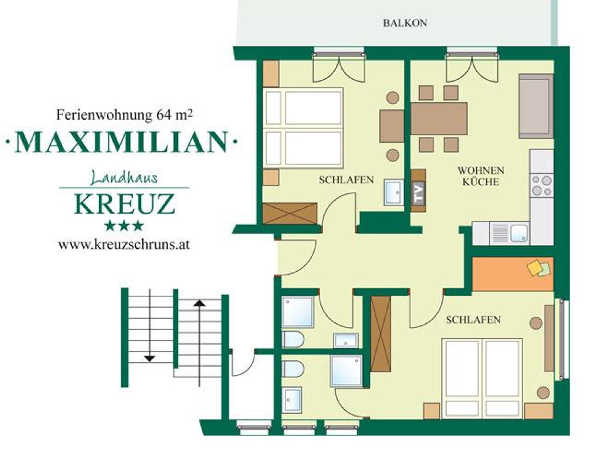 Das Appartement Maximilian“, 64 m² für 4-5 Personen ist neu renoviert, Wohnraum mit abgesetzter Küche (Geschirrspüler, Backrohr, Mikrowelle, ), und gemütlichem Esstisch sowie Kombi-Sofa, 2 Schlafzimmer, jedes mit eigener DU/WC, Süd-Balkon, Kabel-TV, Radio und gratis Wlan.