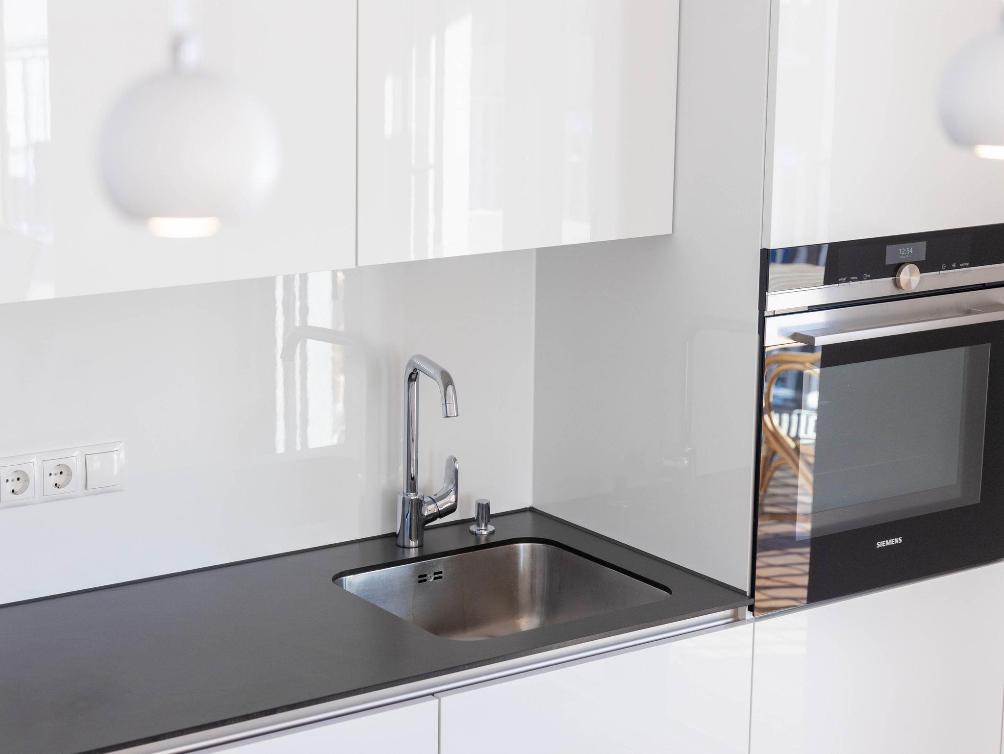 Helle Wohnküche, 2 Schlafzimmer für 4-6 Personen, Bad mit Badewanne und Dusche, WC extra, großzügiger Balkon.