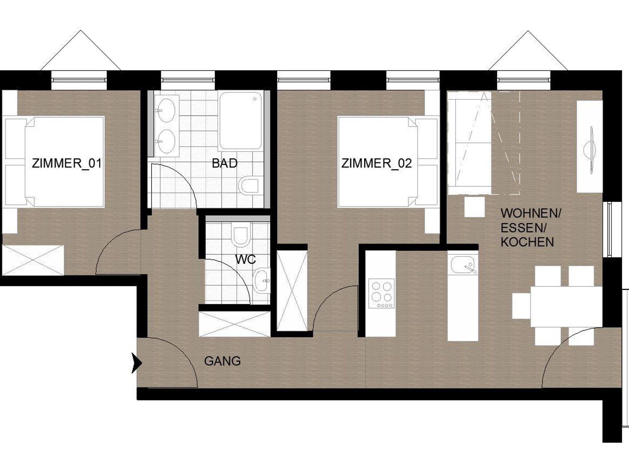Fünf neue, moderne Appartments mit jeweils zwei getrennten Schlafzimmern, Wohnküche, Bad mit Dusche/WC und WC extra.