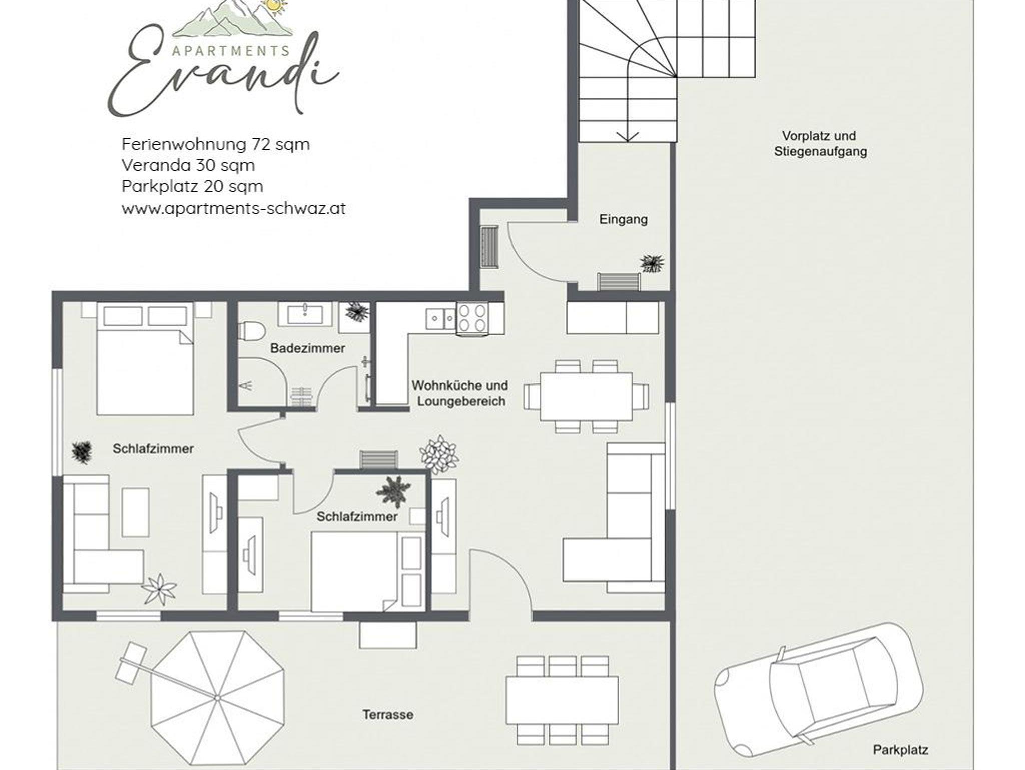 Am südöstlichen Rand der Stadt Schwaz liegt in einer ruhigten Wohngegend das Haus EVANDI am Ende einer verkehrsarmen Einbahnstraße.