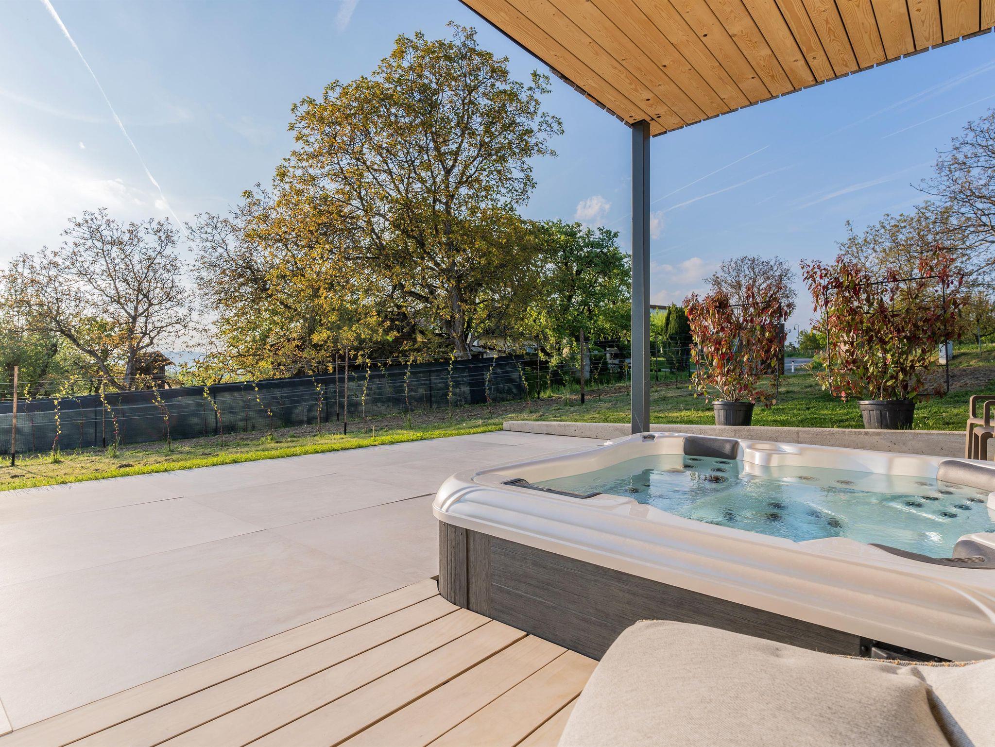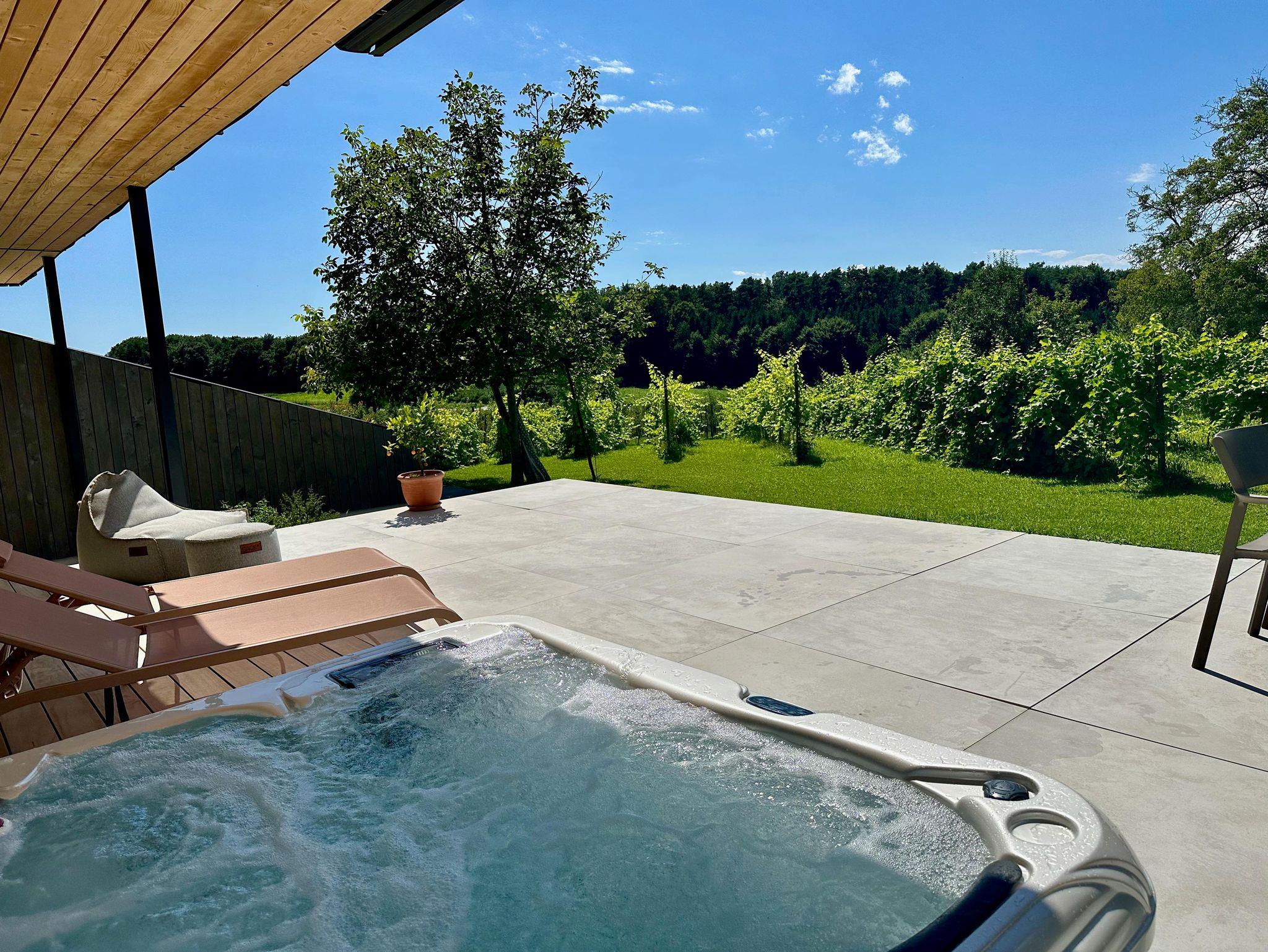 Barrierefreies Apartment, ca. 62 m2 mit Küchenzeile, Kühlschrank, Kaffeemaschine, großzügiges Badezimmer, Fernseher, ausziehbares Sofa, Boxspring-Doppelbett, großzügige Terrasse (ca 36 m2) mit Liegen, Gartenmöbeln und Whirlpool mit Blick in den Weingarten