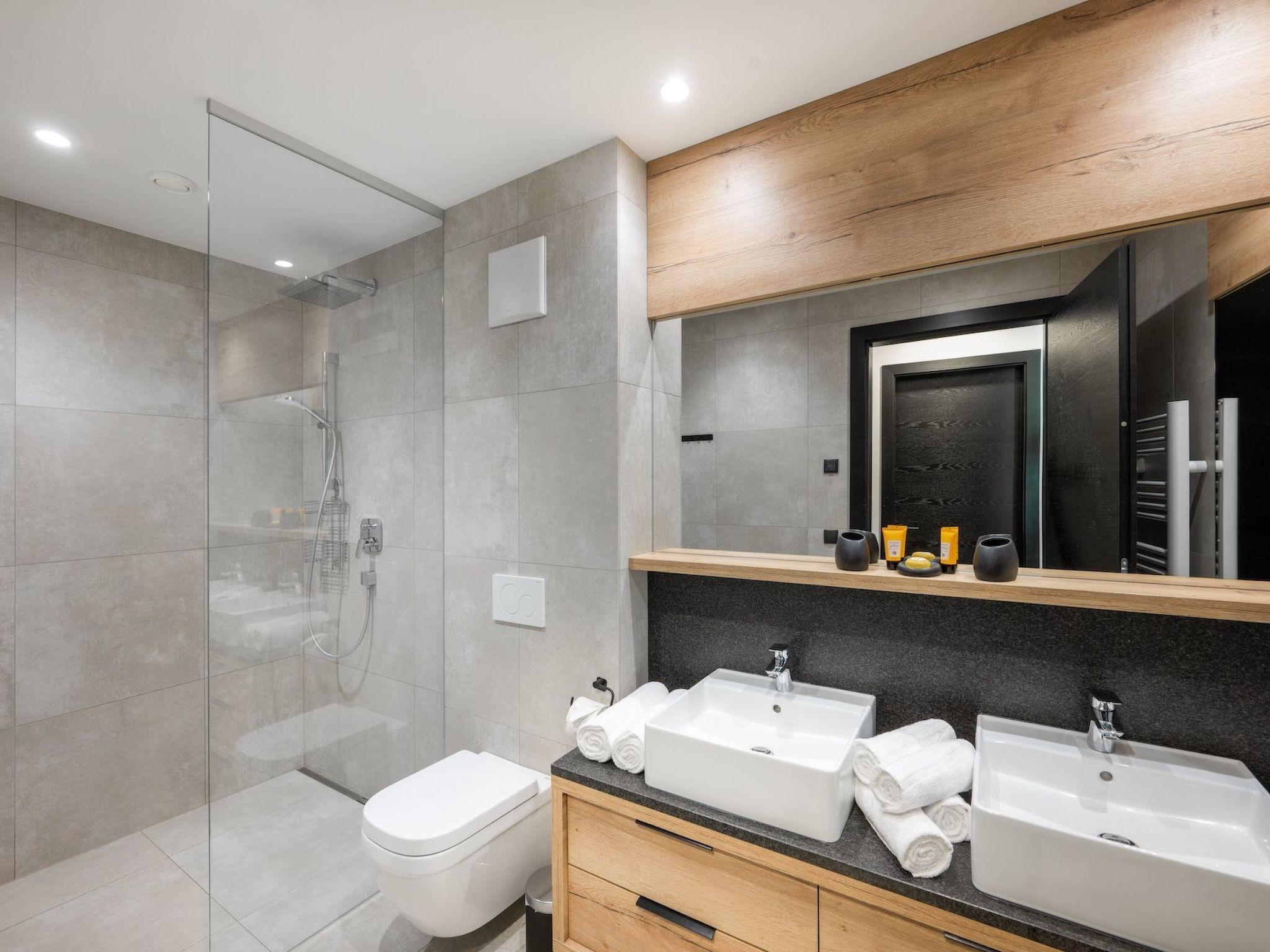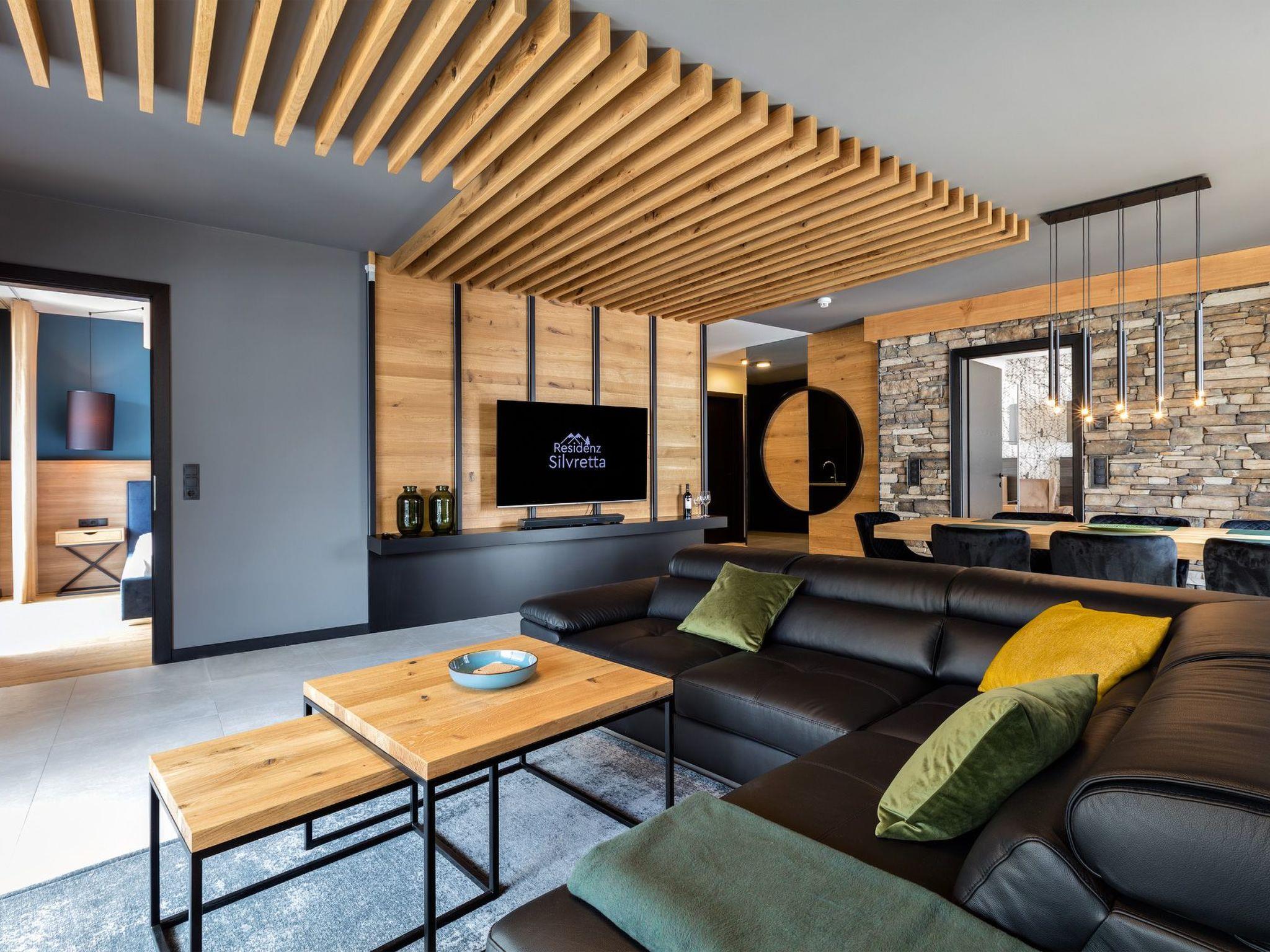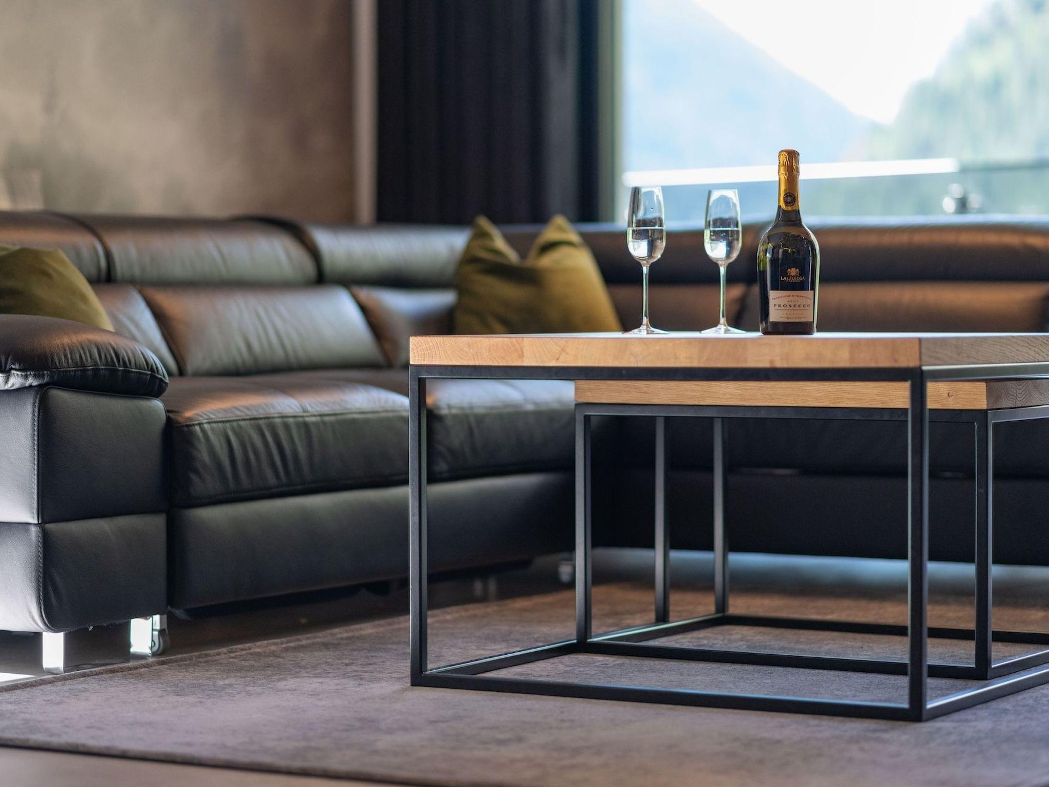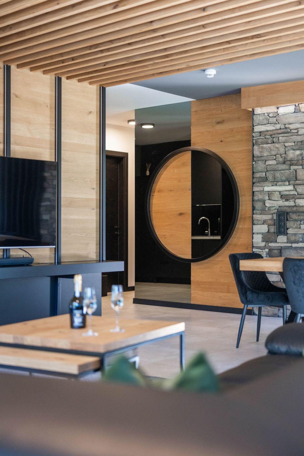 The spacious living area with a large L-shaped sofa and a stylish armchair is the perfect place to relax and enjoy the wonderful alpine atmosphere. The living area flows into the spacious dining area, where the tables can seat up to eight guests on comfortable chairs. The elegant, modern kitchen is fully equipped and offers everything you need to prepare meals for your family and friends.