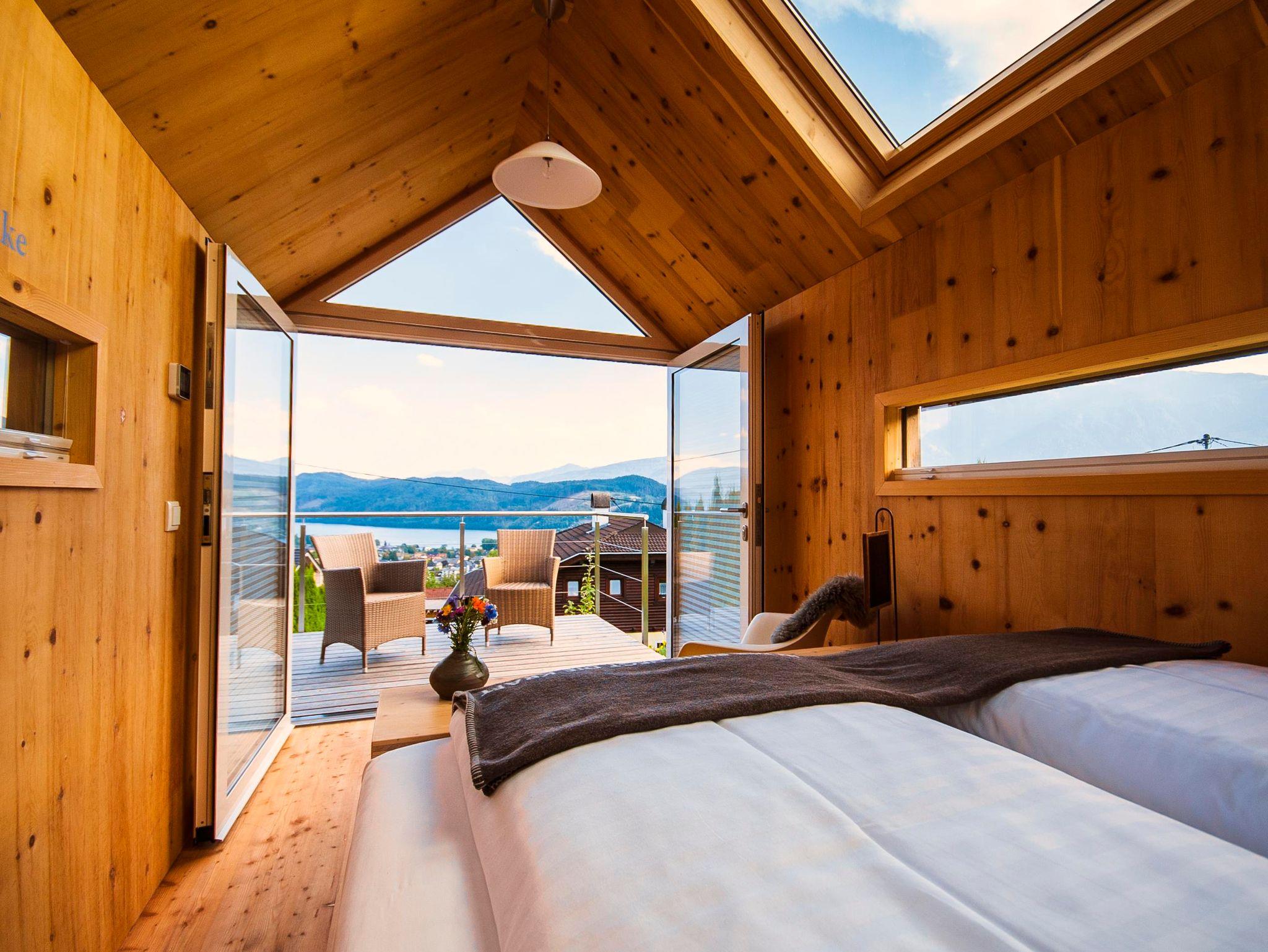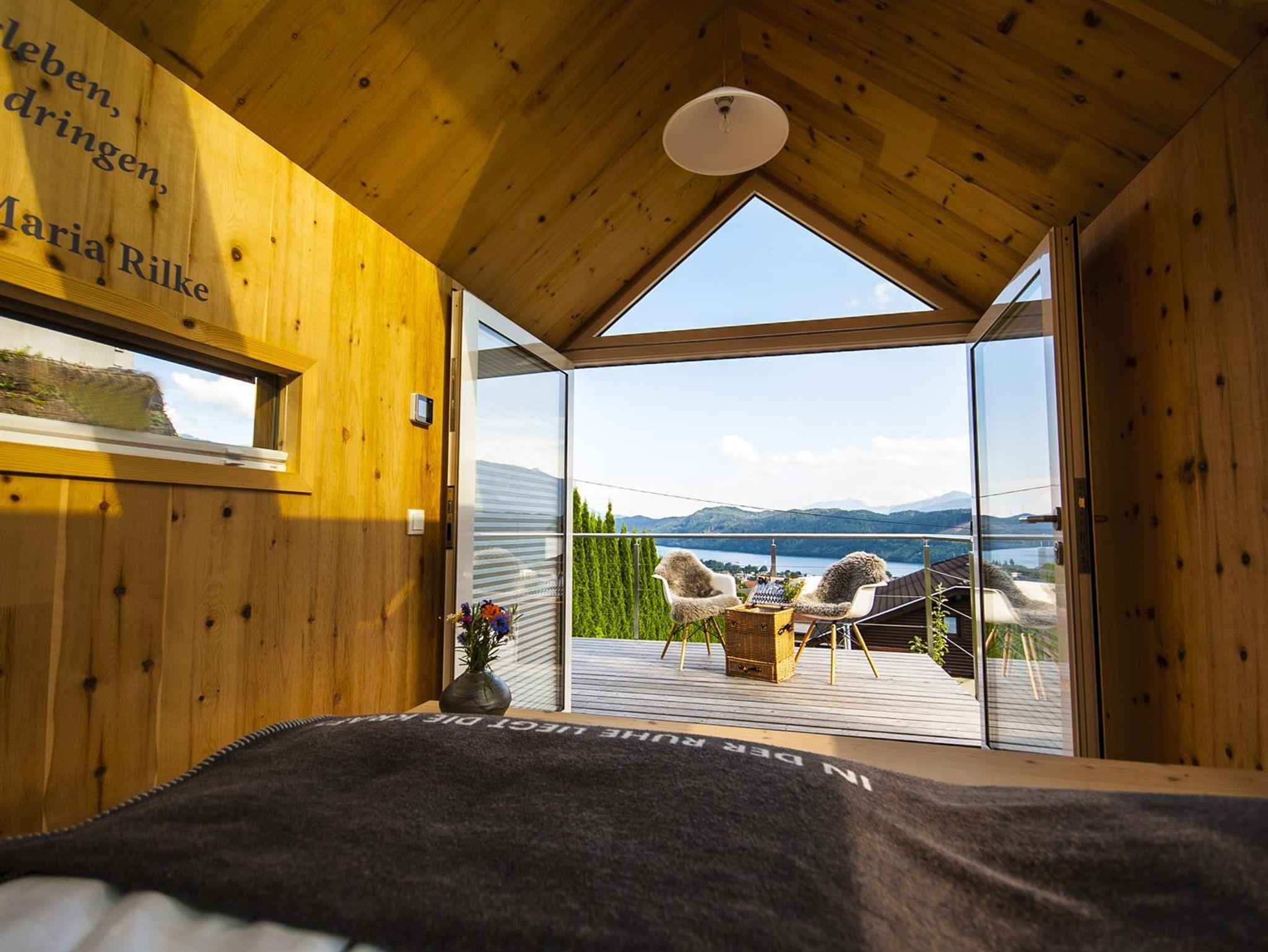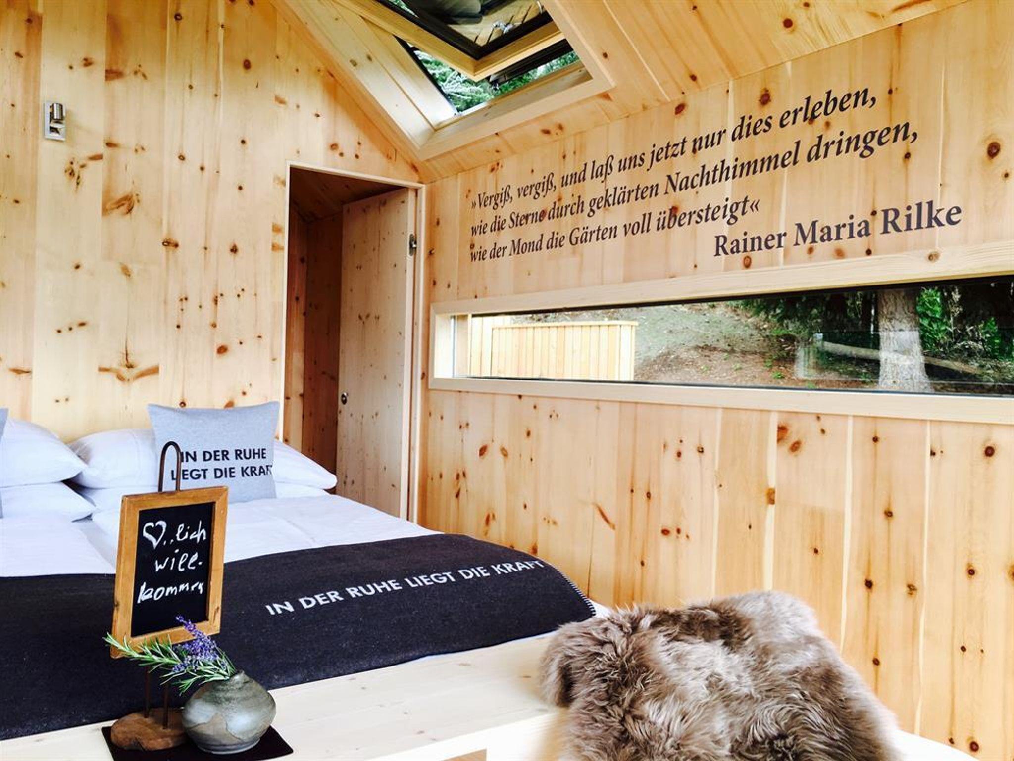 Durch die großzügigen Panoramafenster fällt der Blick abends auf die Sterne, morgens auf den Sonnenaufgang. Aus heimischem Lärchen-, Zirben und Fichtenholz gezimmert bietet das Biwak Platz für ein großes Bett, einen Tisch samt beschwingten Stühlen mit kuscheligem Lammfell sowie einen getrennt zugänglichen Waschraum mit WC und einer Waschschüssel aus Fluss-Stein. Mobilgeräte, Schlüssel und Terminkalender verstauen Sie in einem kleinen Fach, um die Zweisamkeit ganz ungestört zu erleben. Die Glasflügeltür öffnet sich zur Veranda hin, die zum Frühstücken Freien einlädt.