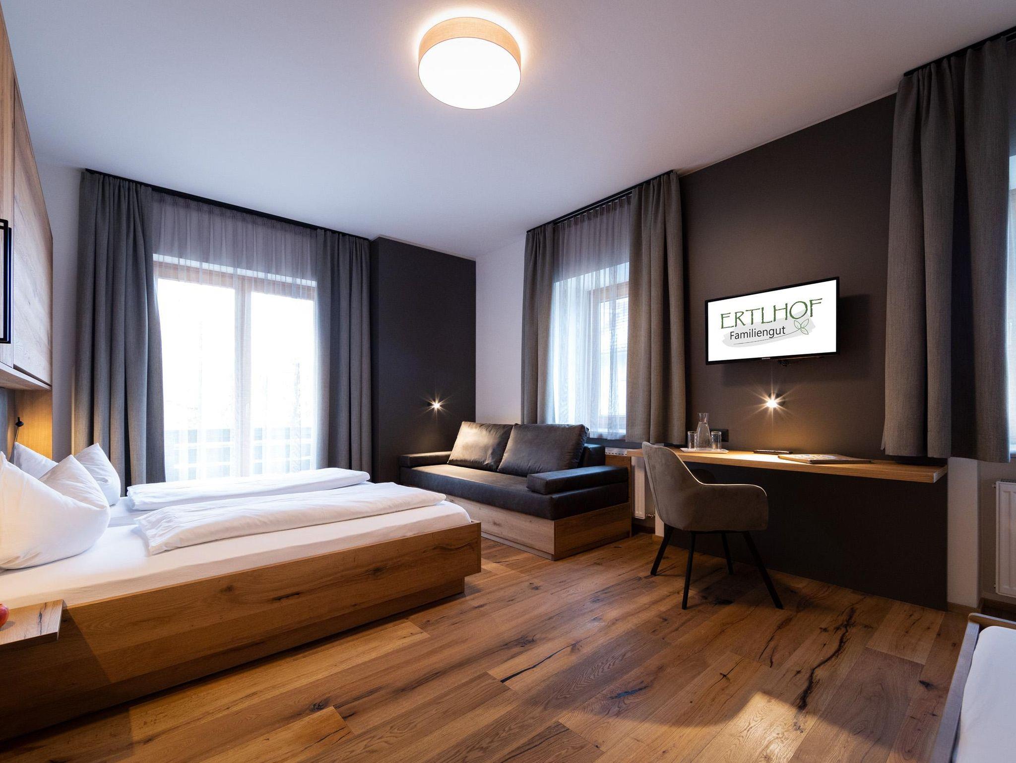 Das Familiengut Ertlhof verfügt über insgesamt 27 modern und geschmackvoll eingerichtete Zimmer in jeder Kategorie, vom Doppelzimmer bis hin zum Green Garden Familienzimmer. Alle Etagen sind natürlich auch mit dem Aufzug erreichbar. Der jetzige Zimmertrakt wurde im Jahr 2012 vollkommen modernisiert. Vor allem auch der Gartenbereich mit Freibad und Kinderbecken, aber auch die zur Erholung und Entspannung einladenden grünen Wiesen, Felder und Wälder der zugehörigen Landwirtschaft, runden das Urlaubsangebot ab.