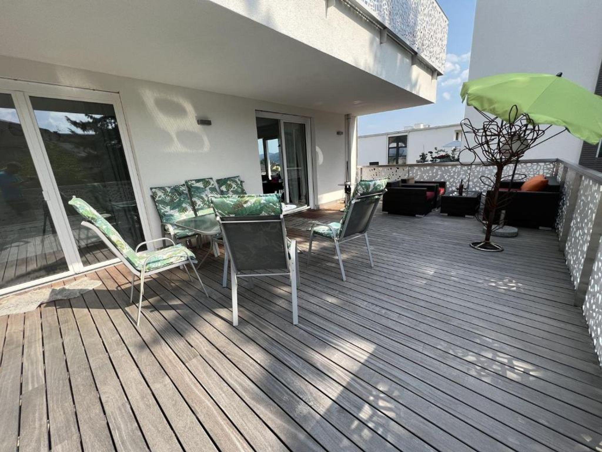Sie benutzen bequem den Lift im Haus und finden das Apartment im 1. Stock. Wenn Sie nach einem erlebnisreichen Tag eine Pause brauchen, bietet sich die herrliche Terrasse mit den Lounge-Möbeln perfekt an um einen gemütlichen Ausklang zu finden.