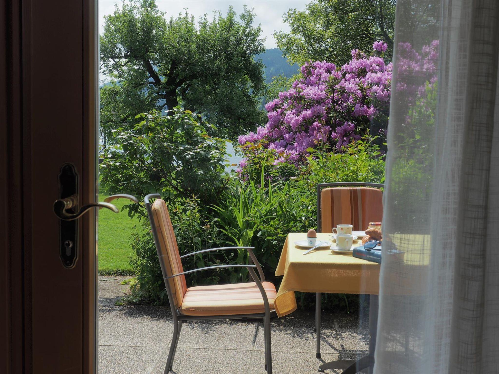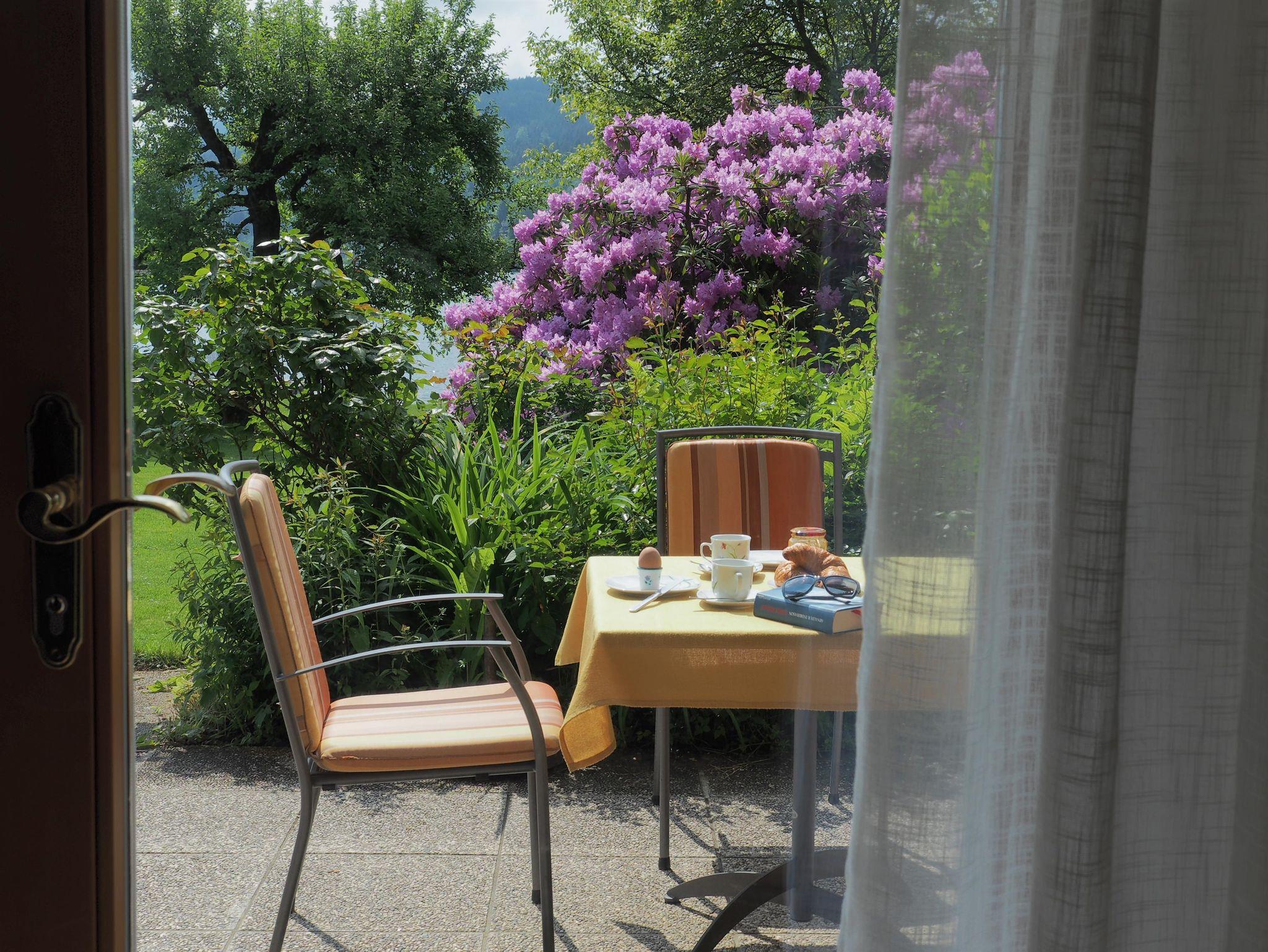 Auf der Terrasse unserer SeeWohnung sitzen Sie mitten im üppig blühenden Garten mit Blick auf den Millstätter See.