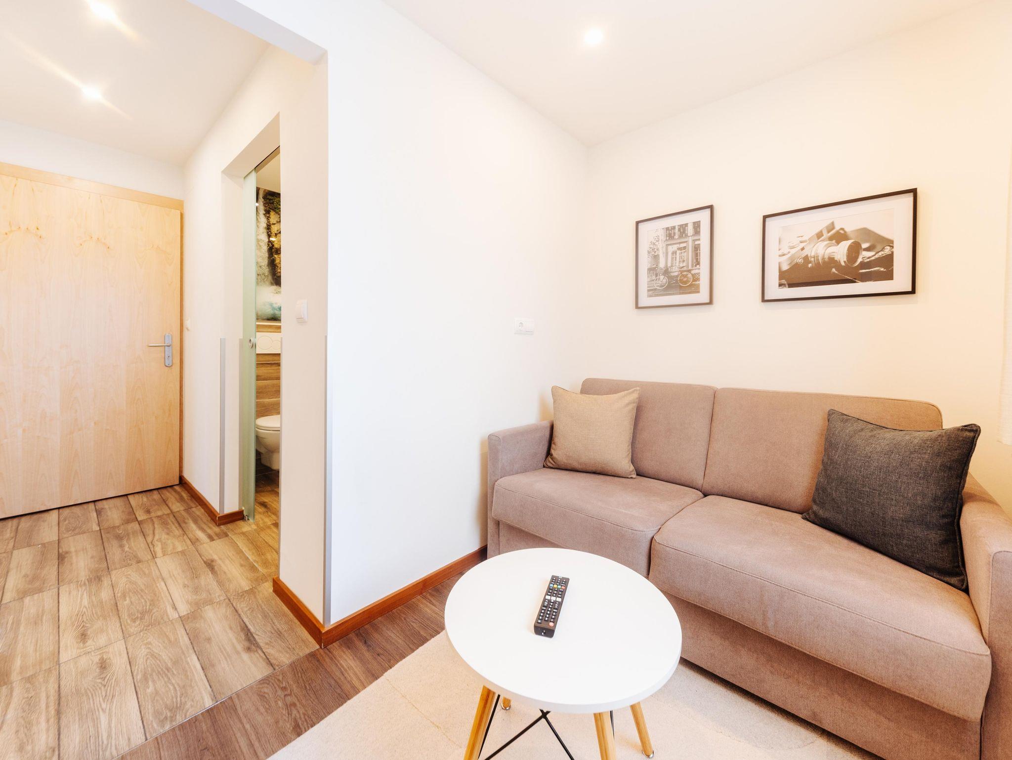 Schlafzimmer mit Flath TV und Desingbild , Verbindungstüre zu Wohnbereich mit 2. Flath TV und hochwertiger Hotelcouch ( ausziehbar mit Klatschaumatratze). Duschbereich im modernen Design mit Riesen Spiegel - Glas und Designbildern.