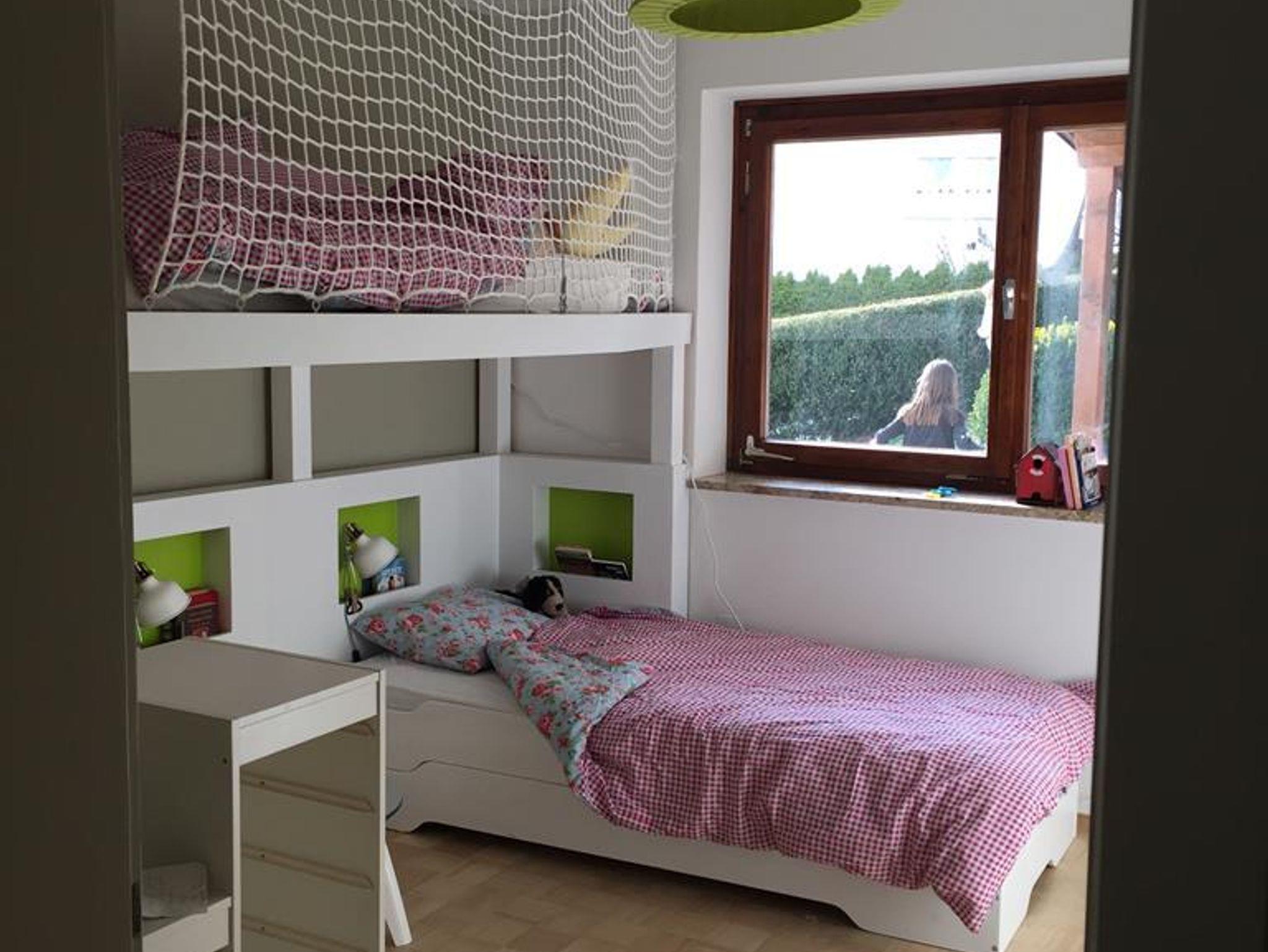 Eines der beiden Schlafzimmer ist mit einem Doppelbett ausgestattet, das andere Schlafzimmer enthält ein Hochbett und je nach Bedarf zusätzlich ein oder zwei Einzelbetten, wobei die 2 Einzelbetten individuell gestellt werden können und der Einstieg sehr niedrig ist (Gesamthöhe inklusive Matratze ca 30cm).