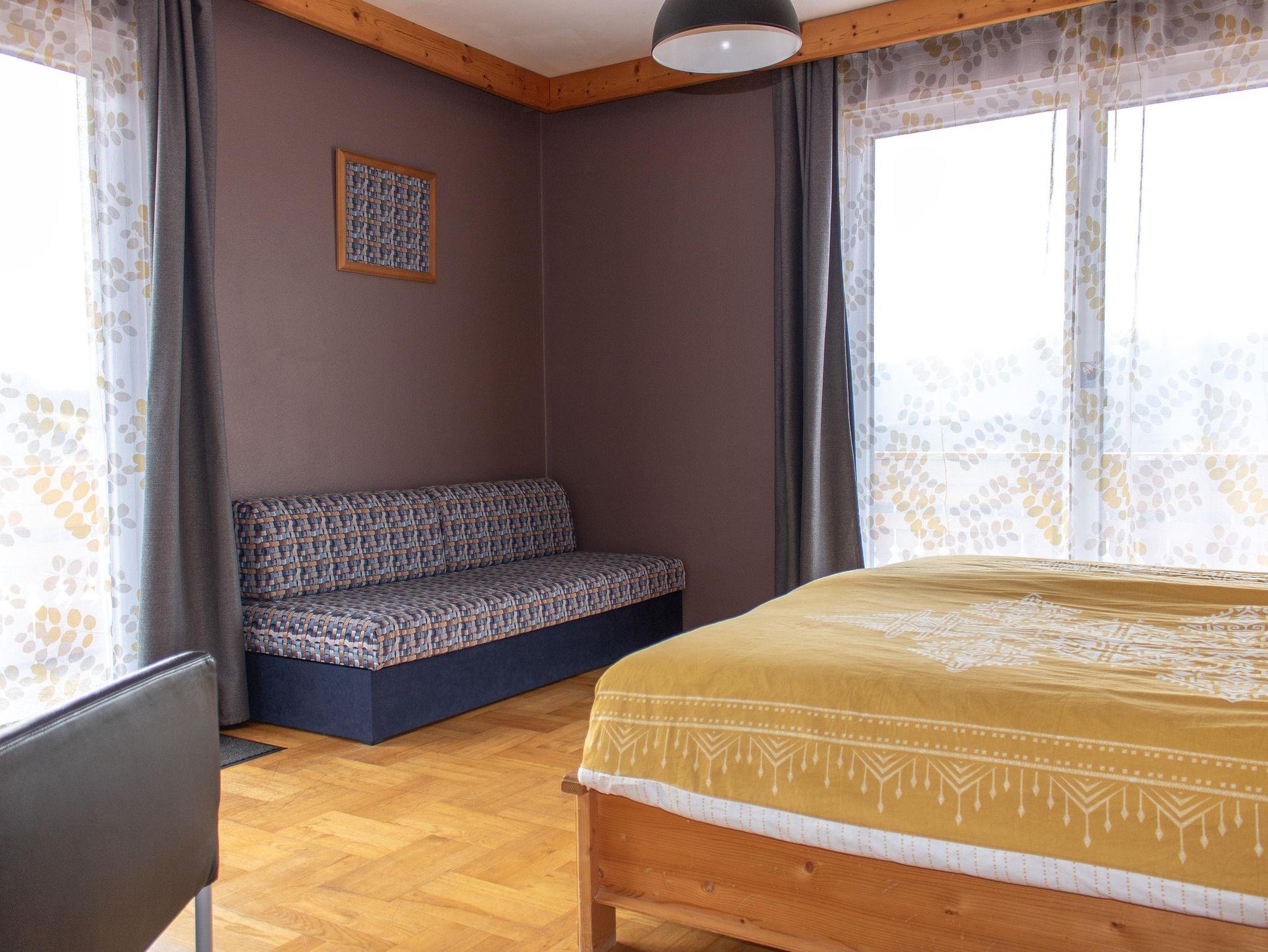 Großer Familienzimmer bestehend aus zwei Schlafzimmern und einem Badezimmer. Geeignet für bis zu 5 Personen. Mit großem Eckbalkon und herrlichem Blick auf die Burg Sommeregg und das Goldeck.