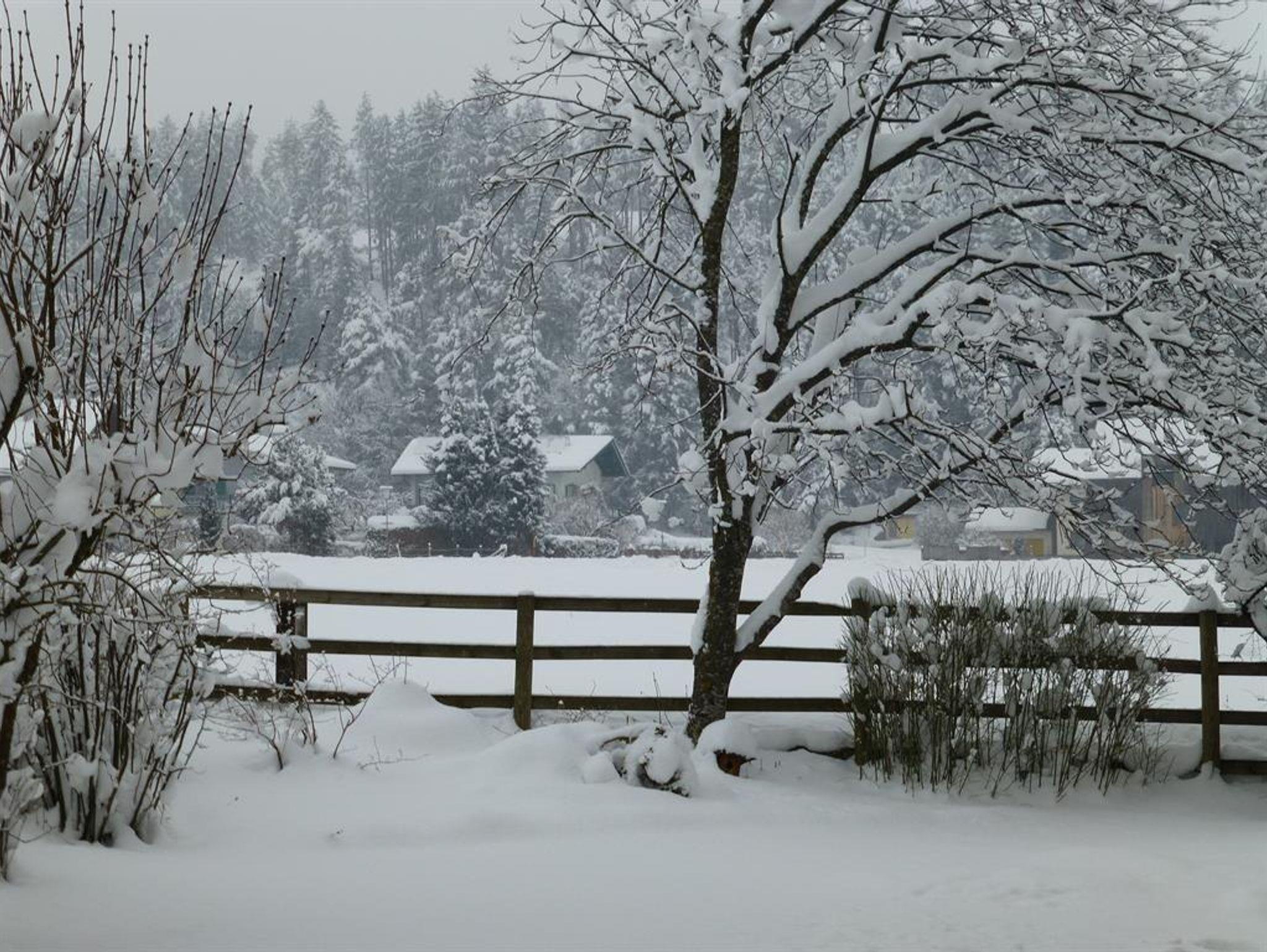 Unsere Frühstückspension liegt in Seeboden am Millstätter See auf einer Anhöhe mit Blick über den ganzen See, den Ort und die umliegenden grünen Berge.
