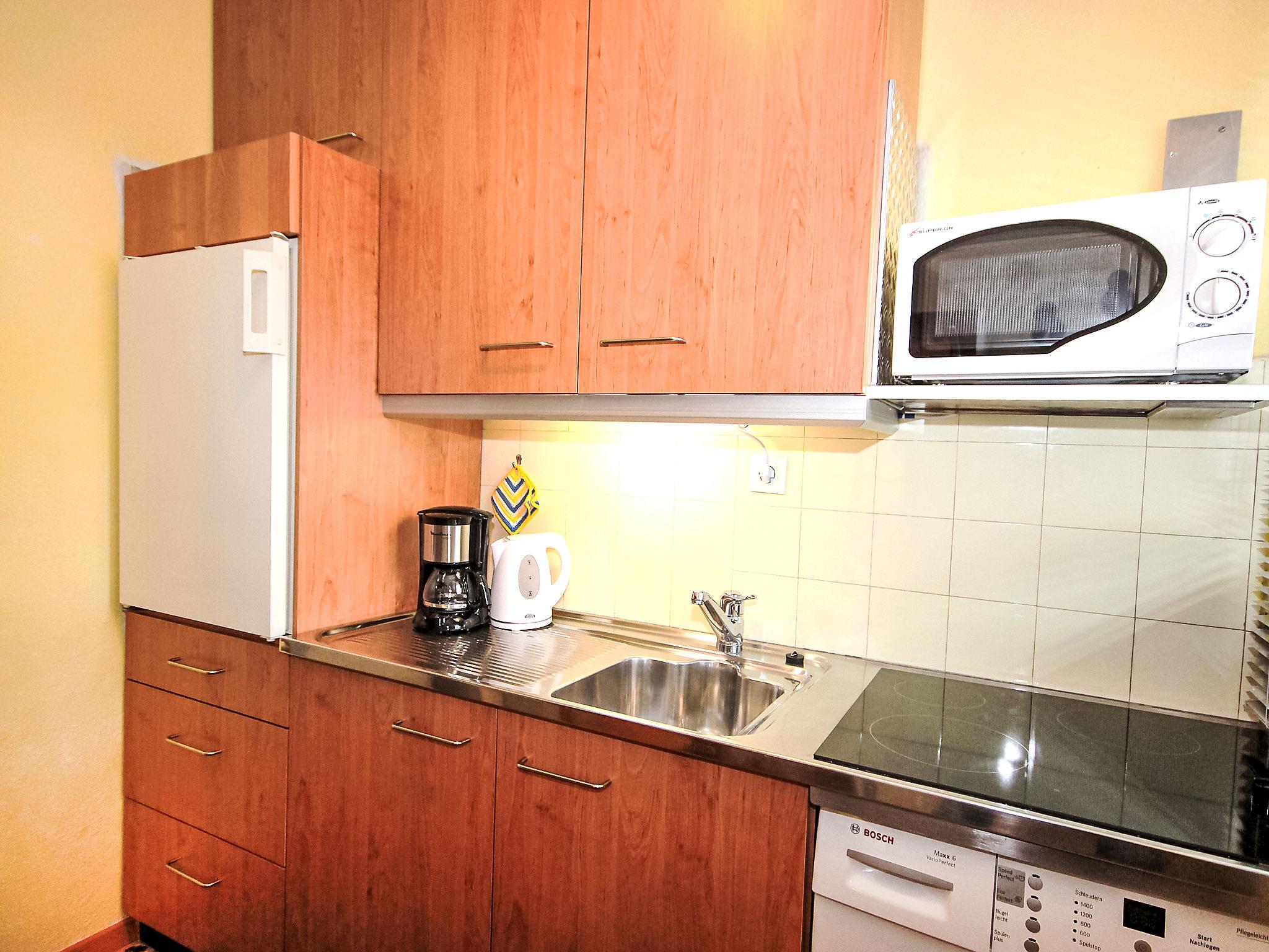 1-room apartment 33 m2, on the upper ground floor. Living/dining room with 1 sofabed, 1 double fold-away bed, dining nook and cable TV (flat screen). Exit to the balcony. Kitchen (mini-oven, 3 ceramic glass hob hotplates, microwave). Shower/WC. Balcony. Balcony furniture. Please note: non-smokers only. Smoke alarm.