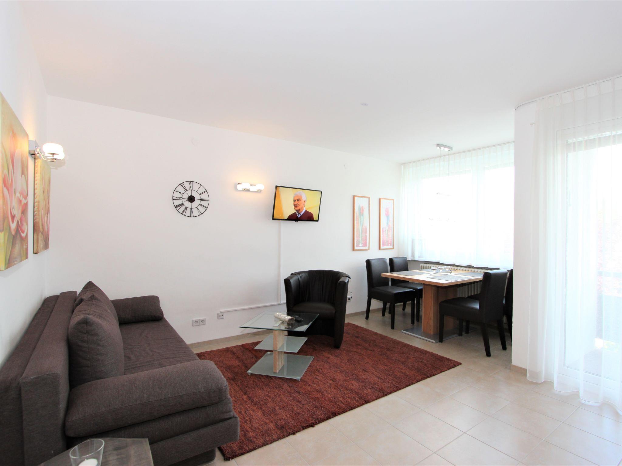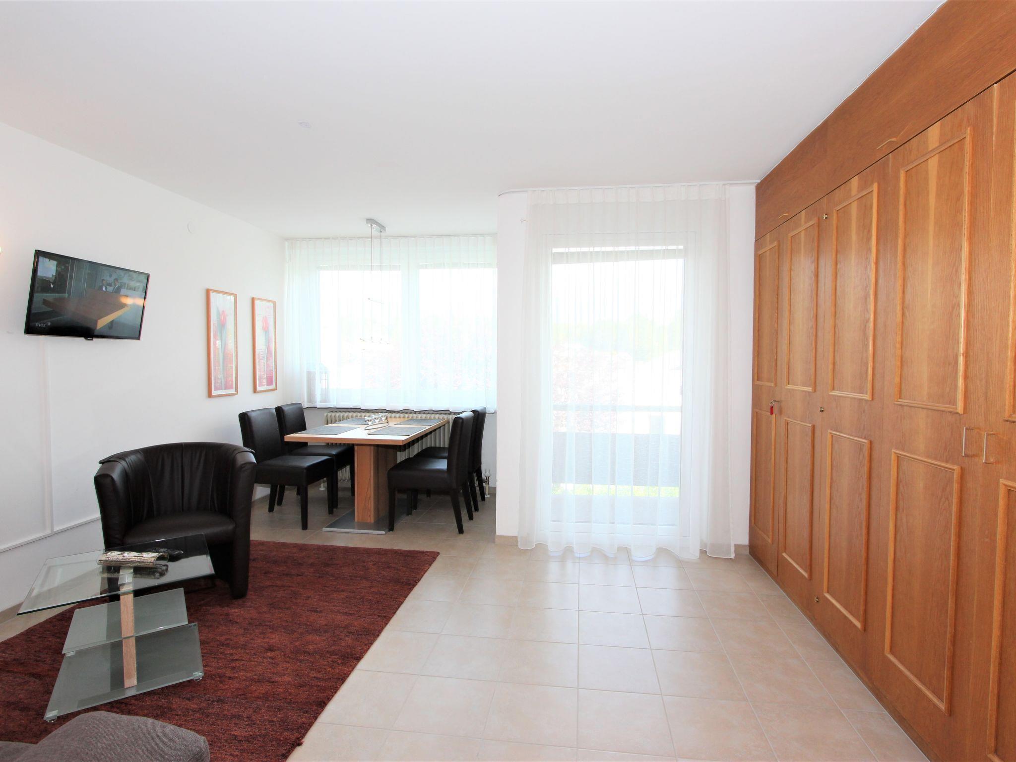 1-room apartment 32 m2 on 1st floor. Modern and tasteful furnishings: living/sleeping room with 1 double sofabed, 2 fold-away beds, dining table and cable TV (flat screen). Kitchenette in the entrance (2 ceramic glass hob hotplates, electric coffee machine, Capsules for coffee machine (Philips Senseo) extra, combination microwave). Bath/WC. Small balcony, west facing position. Balcony furniture. Beautiful view of the mountains. Facilities: baby cot for up to 2 year olds. Please note: non-smokers only.