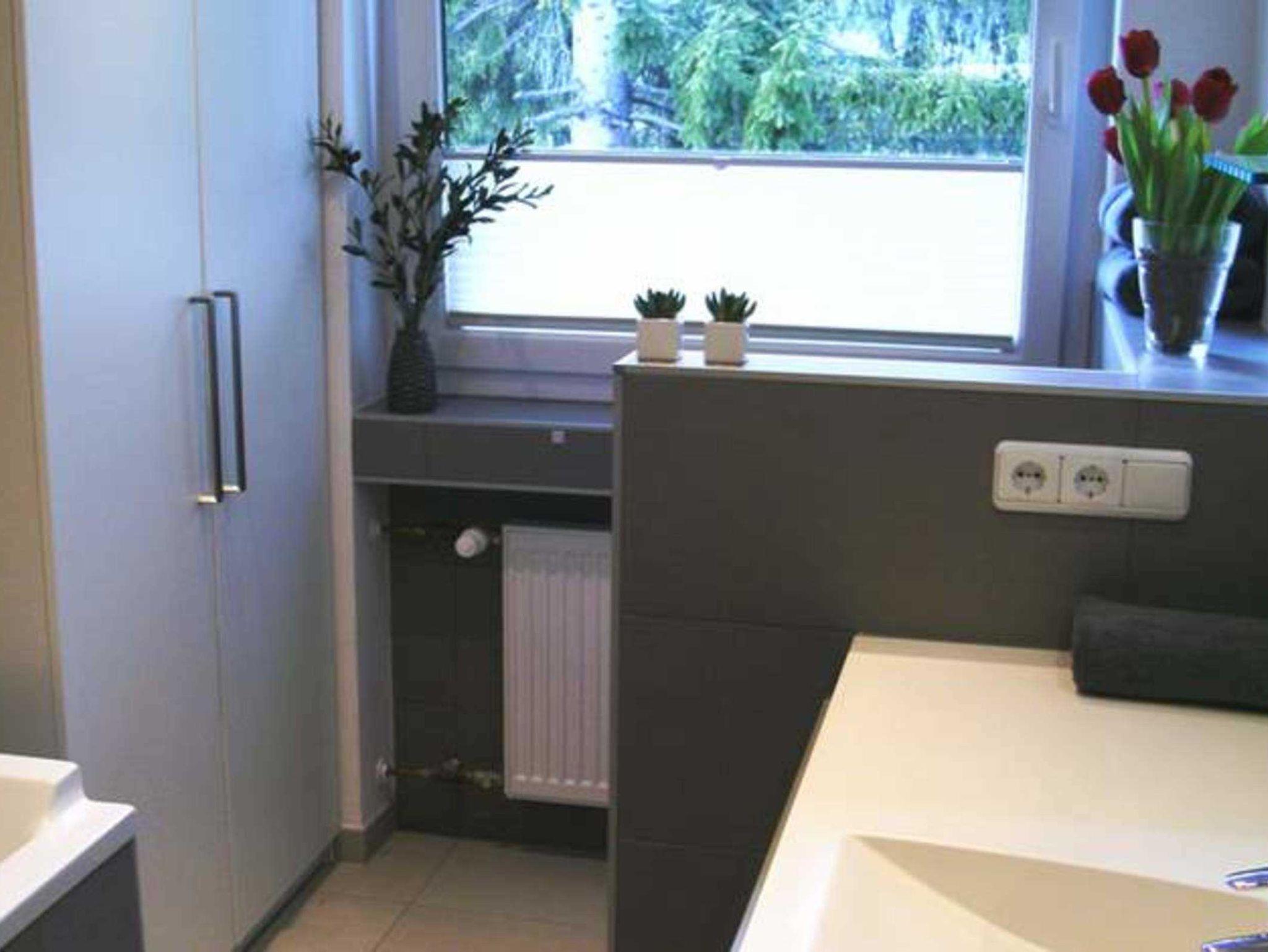 Designerbad: (kompl. renoviert 2014) Badewanne, Rain-Dance-Dusche, WC getrennt durch eine Schamwand, Schrank mit viel Ablagefläche, Mineralsteinwaschtisch mit LED-Beleuchtung, Kosmetikspiegel, Handtuchwärmer und Fön.
