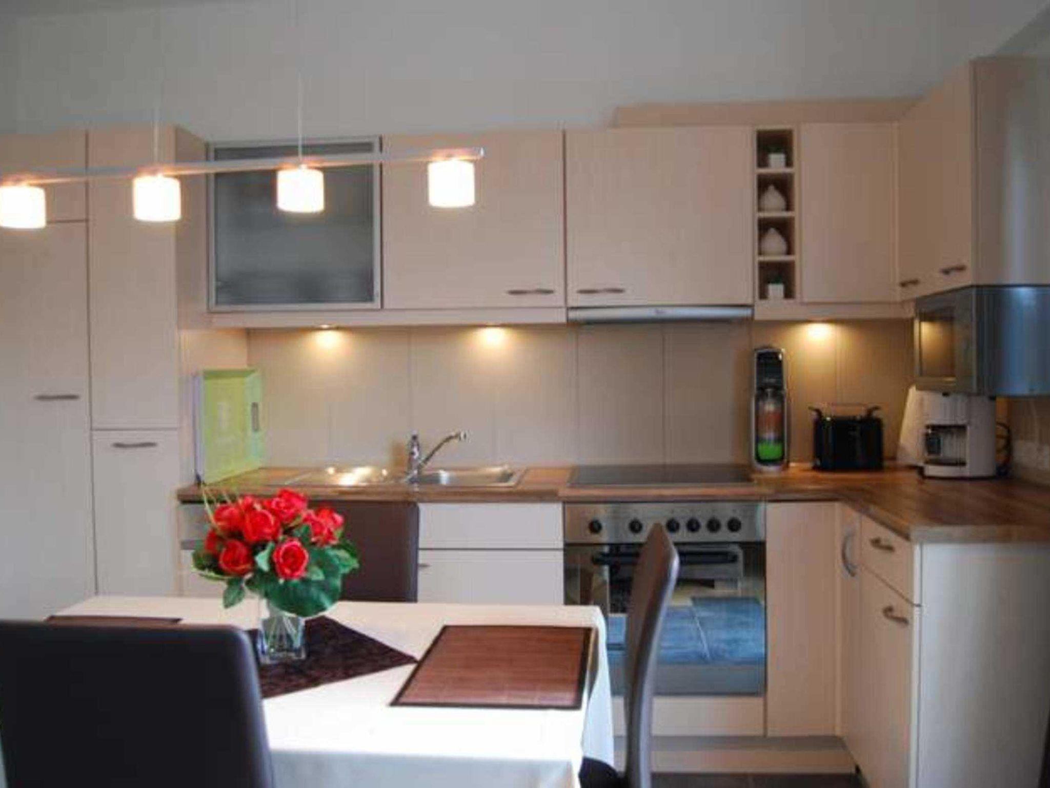 Küche/Esszimmer: voll ausgestattete Einbauküche mit Esstisch mit Stühlen, Backofen + Grillfunktion, Mikrowelle, Spülmaschine, Kühlschrank mit Gefrierfach, Cerankochfeld, Kaffeemaschine, Wasserkocher, Toaster und zahlreiche weitere Küchenutensilien.