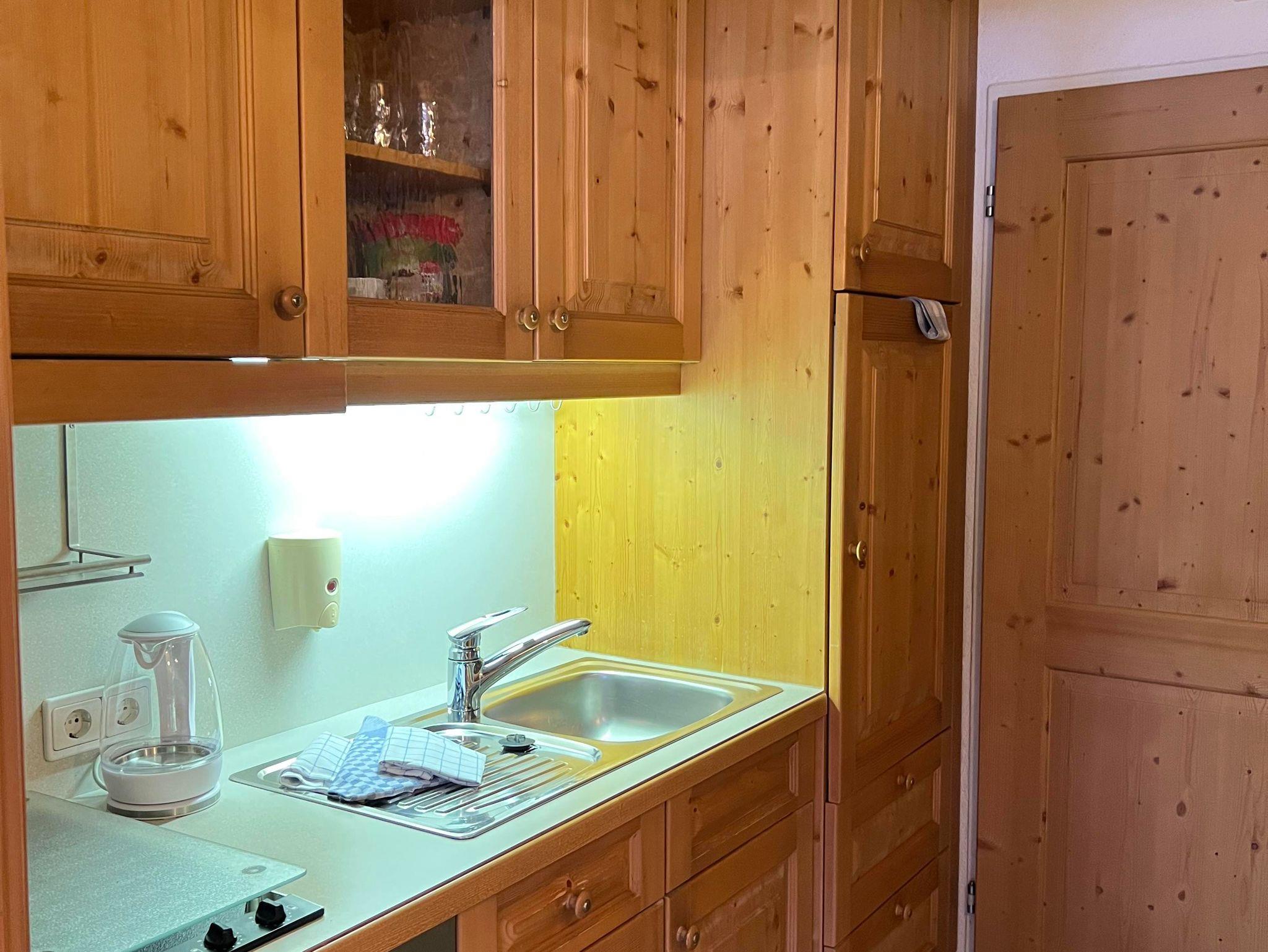 Das etwa 35 m² große Appartement ist ideal für bis zu 2 Personen und bietet einen kombinierten Wohn- und Schlafbereich, eine Küchenzeile, ein Badezimmer und einen Balkon.