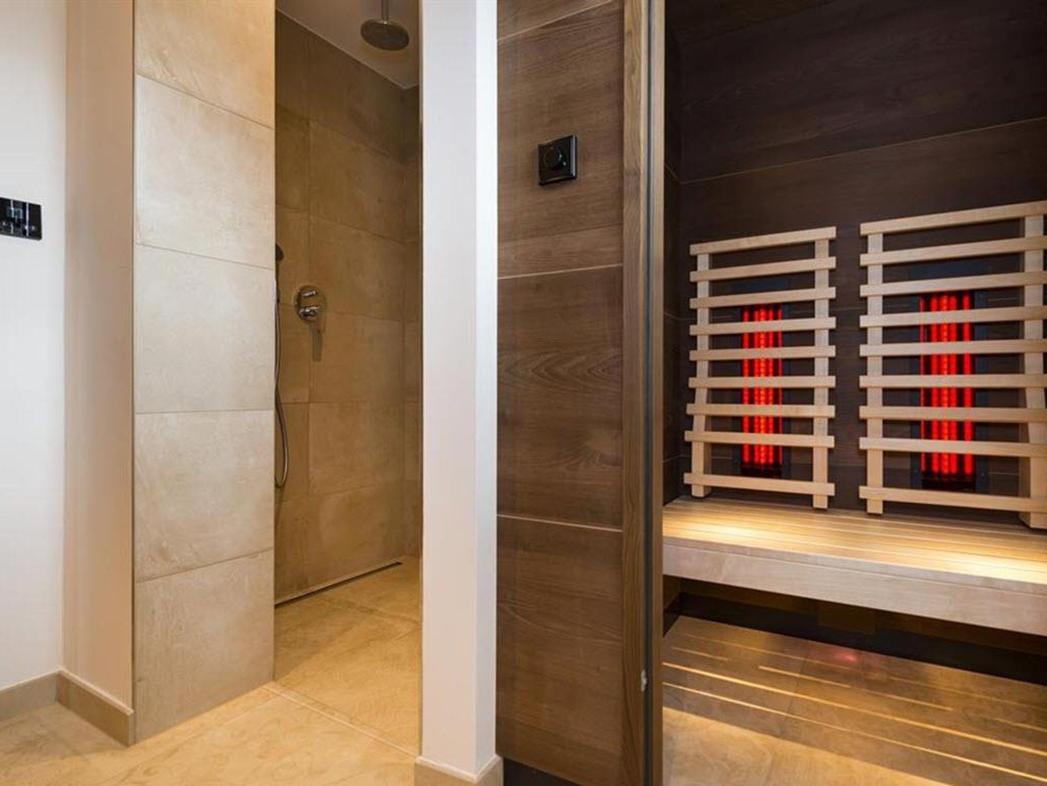 Wohnraum mit Küche, Essplatz, Couch mit Ausziehfunktion, Schlafzimmer, Bad mit Dusche und Infrarotkabine, WC separat, Flat TV, Balkon
