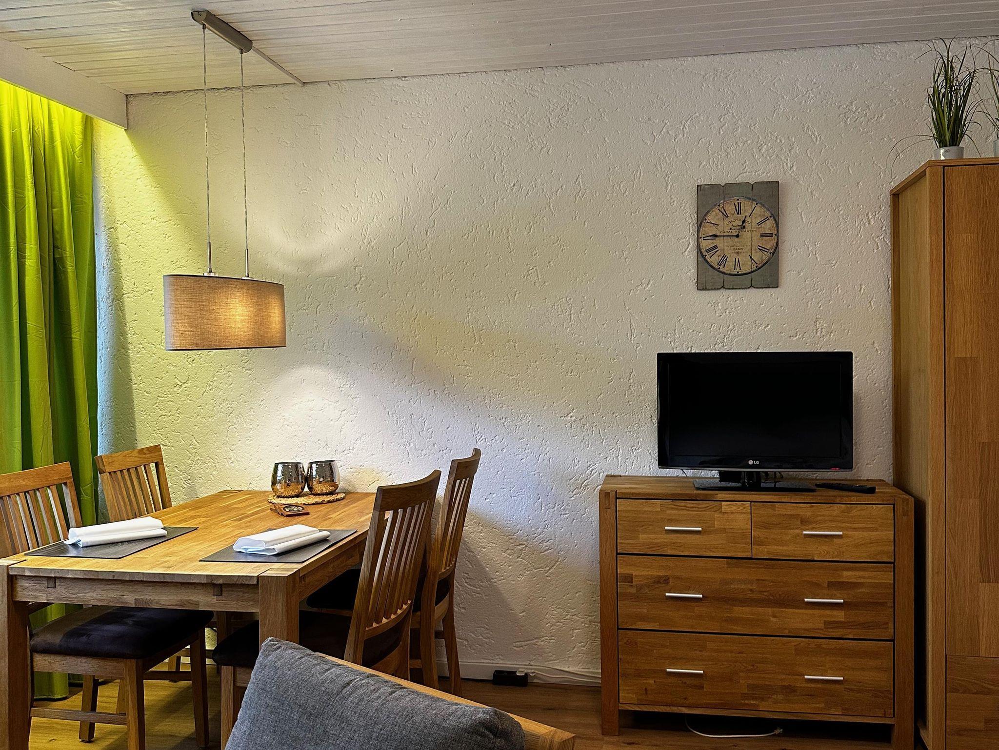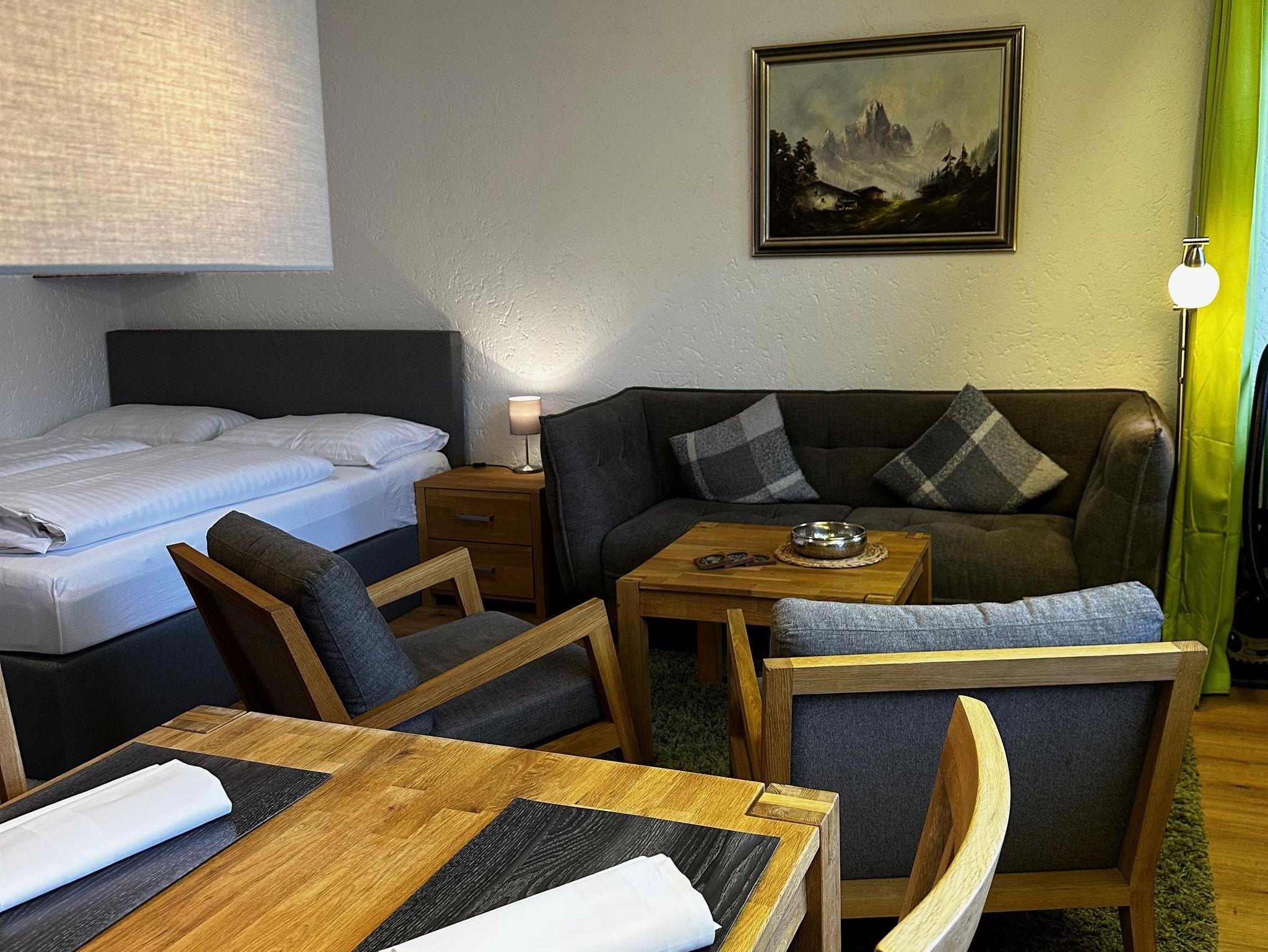 Das etwa 35 m² große Appartement ist ideal für bis zu 2 Personen und bietet einen kombinierten Wohn- und Schlafbereich, eine Küchenzeile, ein Badezimmer und einen Balkon.