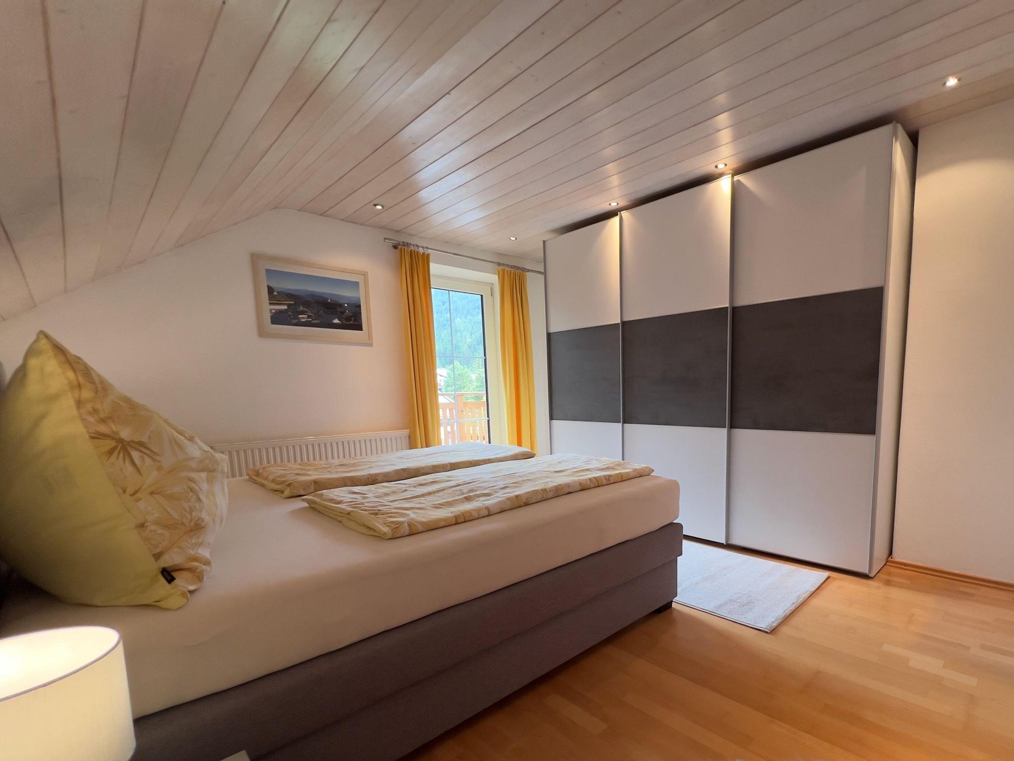Komfort im 2. Stock: Hauptschlafzimmer mit Vorraum und Babybett, Zugang zum zweiten Südbalkon. Zweites Schlafzimmer – perfekt für Familien. Zusätzliches WC im Obergeschoss.