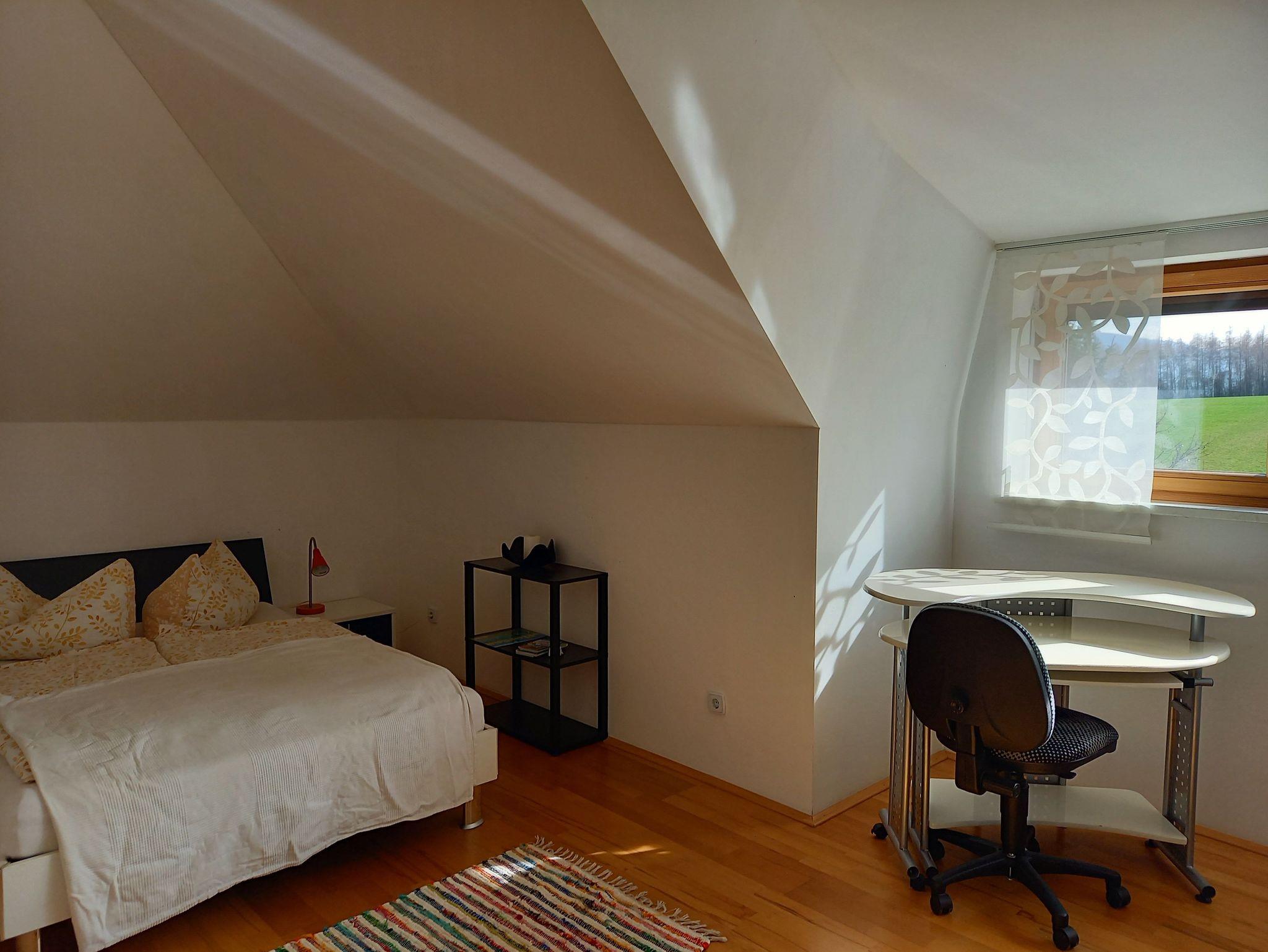 Etagenwohnung (abgeschlossener Wohnbereich, 2 -5 Personen, ideal für Kinder) bestehen aus: Vorraum ca. 8,5 m² Wohnküche ca. 23 m² Schlafraum ca. 25,5 m² Sauna incl. Ruheraum mit Waschbecken, Dusche und Tauchbecken ca. 15 m² Separates WC mit Waschbecken ca. 3,5 m² Carport Lage: mitten im Grünen (keine unmittelbaren Nachbarn) an einer wenig befahrenen Nebenstraße EKZ, Bank, Bus/Bahnstation in 700 m Entfernung Restaurants 100m Ins Ortszentrum 1,5 km Zum Attersee 2 km Freibadeplatz am Attersee mit kostenloser Parkmöglichkeit 5 km Fahrradweg führt am Haus vorbei Autobahnanschluss 1,5 km Flughafen 65 km (Salzburg) Ausstattung: TV, Musikanlage, WLAN, Wohnküche komplett, Sauna mit Ruheraum und Nassbereich: Dusche, Waschbecken, Tauchbecken, Liegen und Fitnessgeräte. Terrassen – und Gartenbenützung (eigener Gästebereich mit Sitz und Essgarnitur, Gartenliegen, Gartendusche) Grillplatz(Holzkohle - Grill steht zur Verfügung), Wäscheleine. Auf Wunsch: Frühstück im separaten Frühstücksraum Wäscheservice