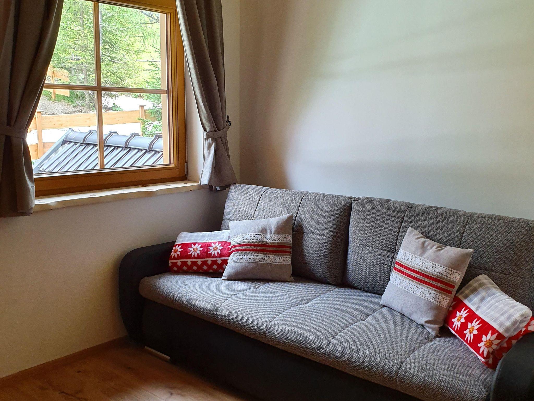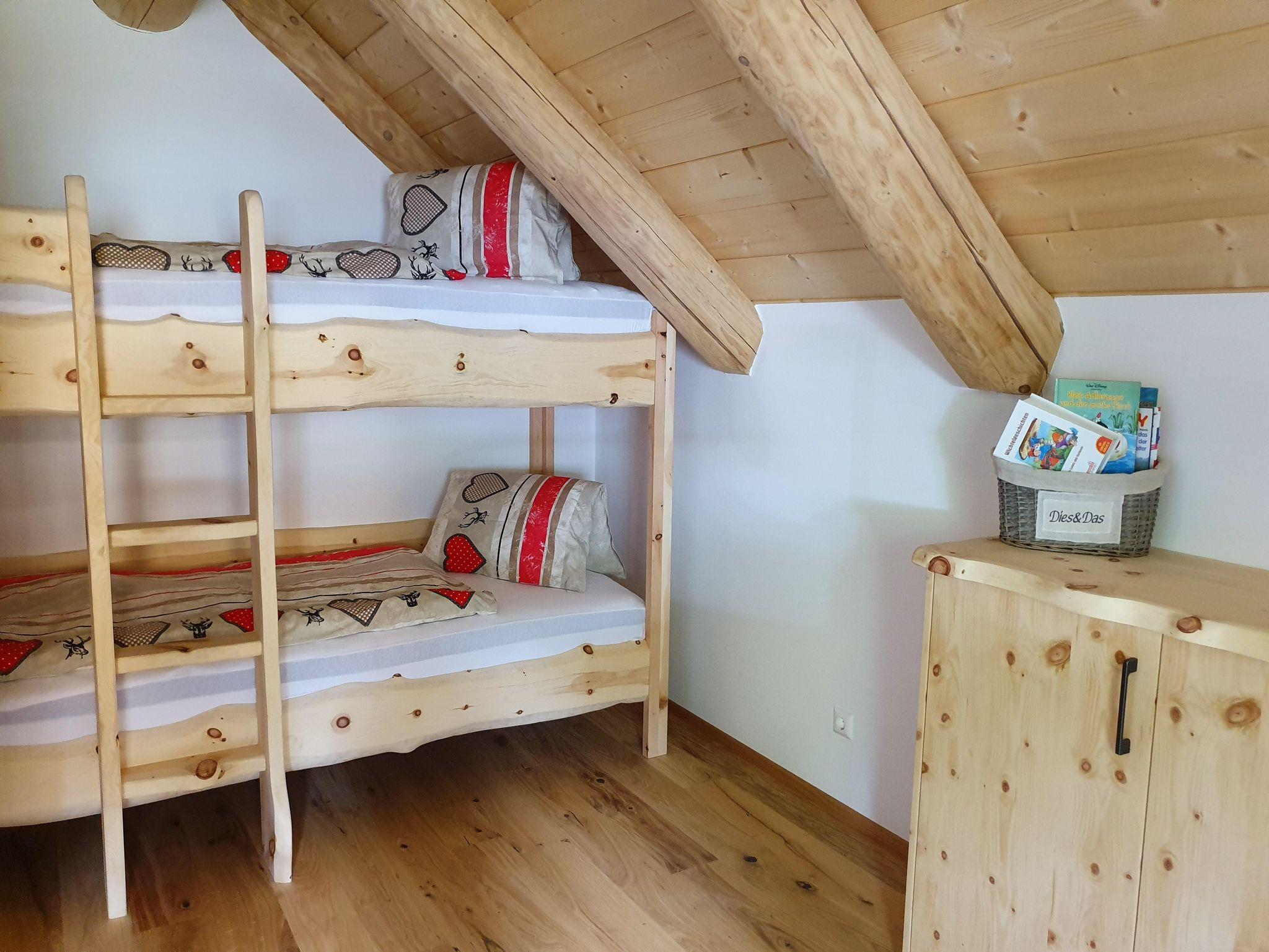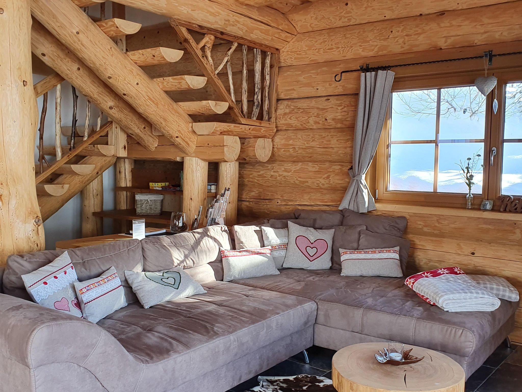 Chalet mit Panoramablick, behaglicher Wohnraum mit Kaminofen, Couch sowie einer voll möblierten und eingerichteten Küche. Vom Wohnraum führt eine Holztreppe ins Obergeschoss. Dort befinden sich ein Schlafzimmer mit Doppelbett sowie ein weiteres Zimmer mit Stockbett für 2 Personen und einem Schlafsofa für 2 Personen. Bad mit Badewanne, WC und Föhn im OG. Ein weiteres WC mit Dusche befindet sich im EG. Fußbodenheizung im gesamten Haus. Zwei Infrarotliegen im Schlafzimmer.