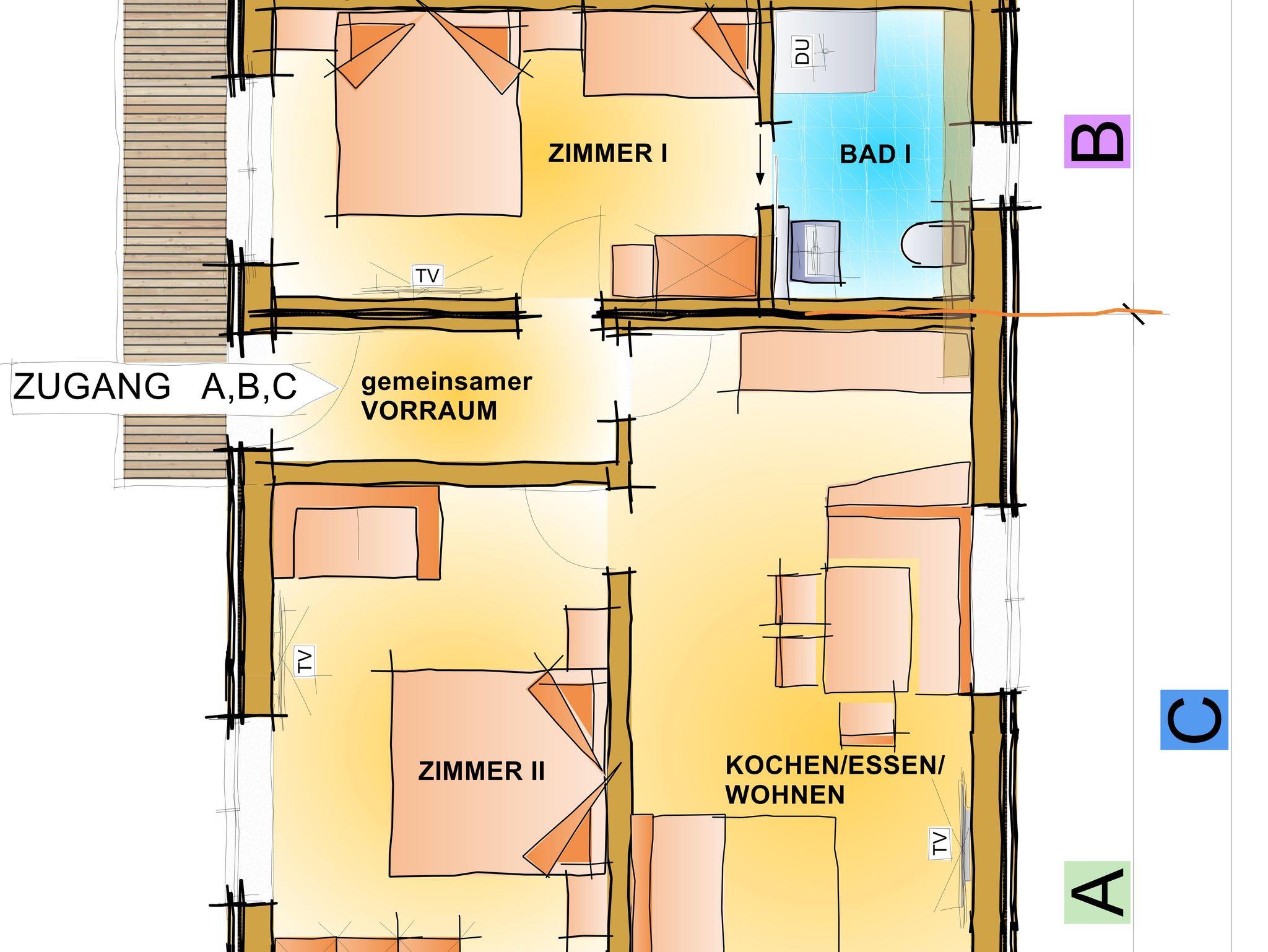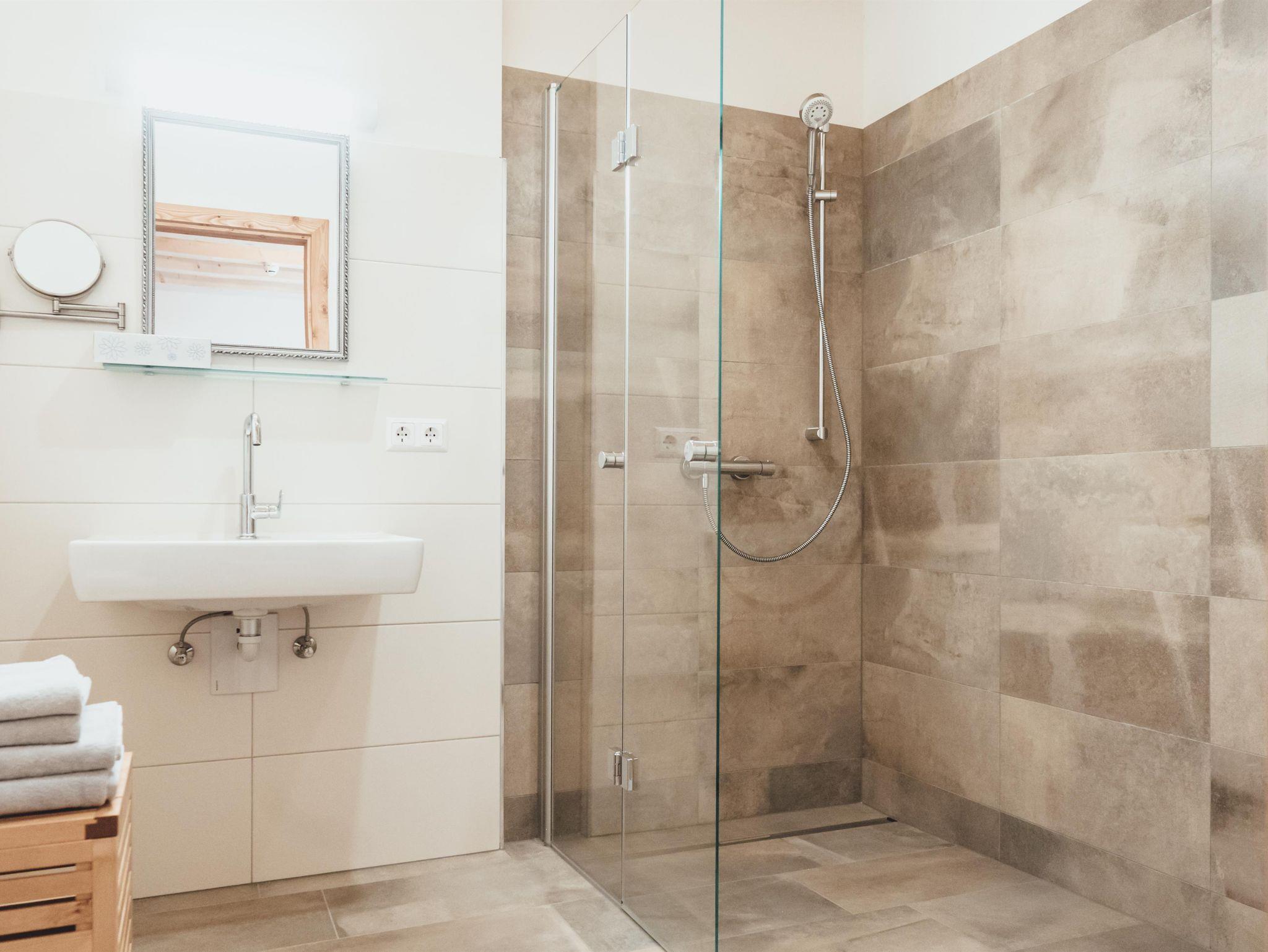 Zirben – Schlafzimmer Nr. 1 mit Doppelbett, Sofaliege; Bad Nr. 1 mit Dusche/WC. Gemeinsamer Vorraum.
