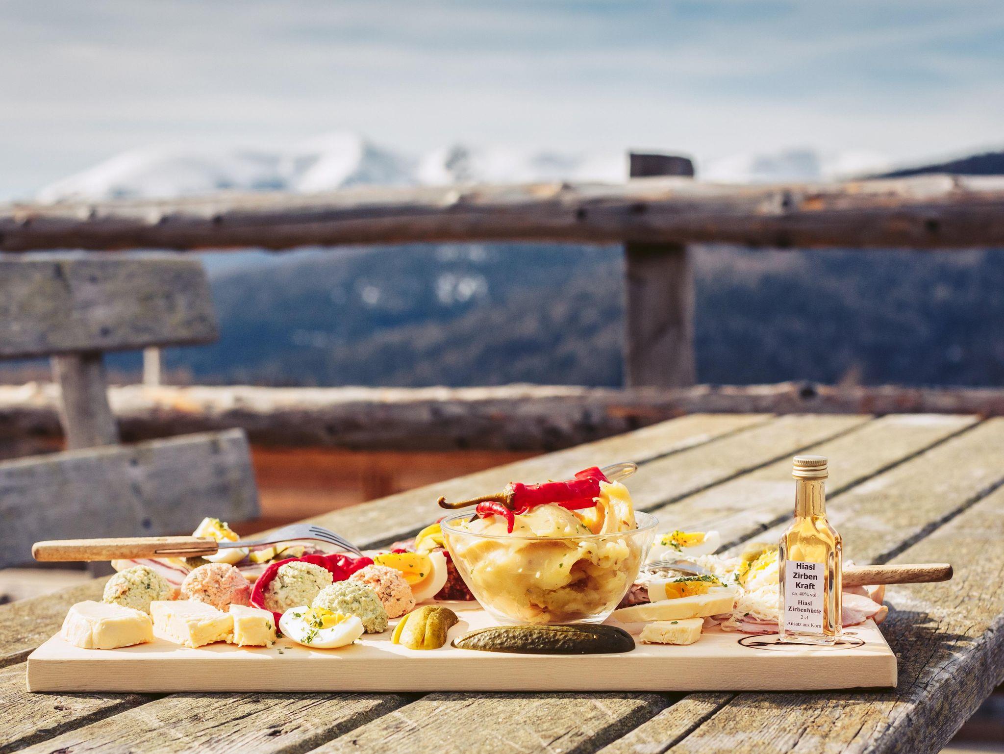 Wir verwöhnen Sie mit Gerichten von Nockfleisch: Gegrilltes Rindfleisch, Schweinsbraten mit Semmelknödel, Wiener Schnitzel, Bratwürste, unserem Hiasl Burger, Leberknödelsuppe... Weiters gibt es die Hiasl Zirbenjaus´n, den bereits berühmten Glundner Käse, Belegte Brote, Kaiserscharrn, Kärntner Reindling, Apfelkuchen, Topfenstrudel u.v.m.